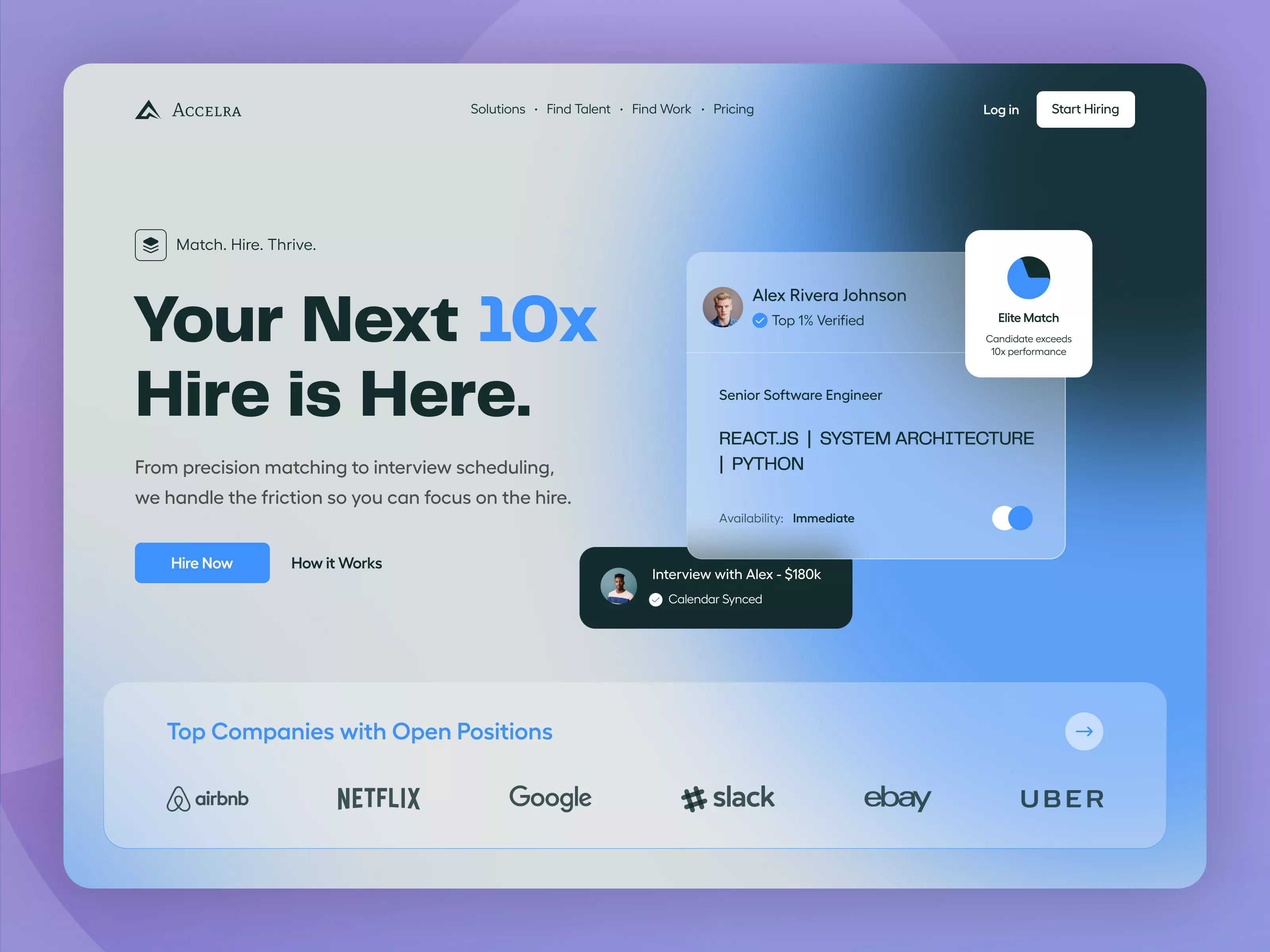 Discover the ultimate UI design that elevates your recruitment platform, creating an impactful first impression with its sleek, modern aesthetics. This design is perfect for websites aiming to connect top-tier talent with leading companies seamlessly. It features a clean, intuitive layout with a balanced use of space and typography that directs attention to essential details, ensuring an engaging user experience. The design incorporates a visually striking header with a compelling call-to-action, drawing users in with the promise of accelerating their hiring process. The interface showcases a dynamic profile card of a top candidate, complete with credentials and availability, enhancing transparency and trust. Integrated seamlessly are elements to guide users through the process, including hyperlinks like 'Hire Now' and 'How it Works,' ensuring effortless navigation. Moreover, the design highlights high-profile company logos, reinforcing credibility and aspirational messaging. Offered as a Figma file, this UI design is easily editable and ready to integrate, promising efficiency and customization for any business aiming to modernize its recruitment interactions.