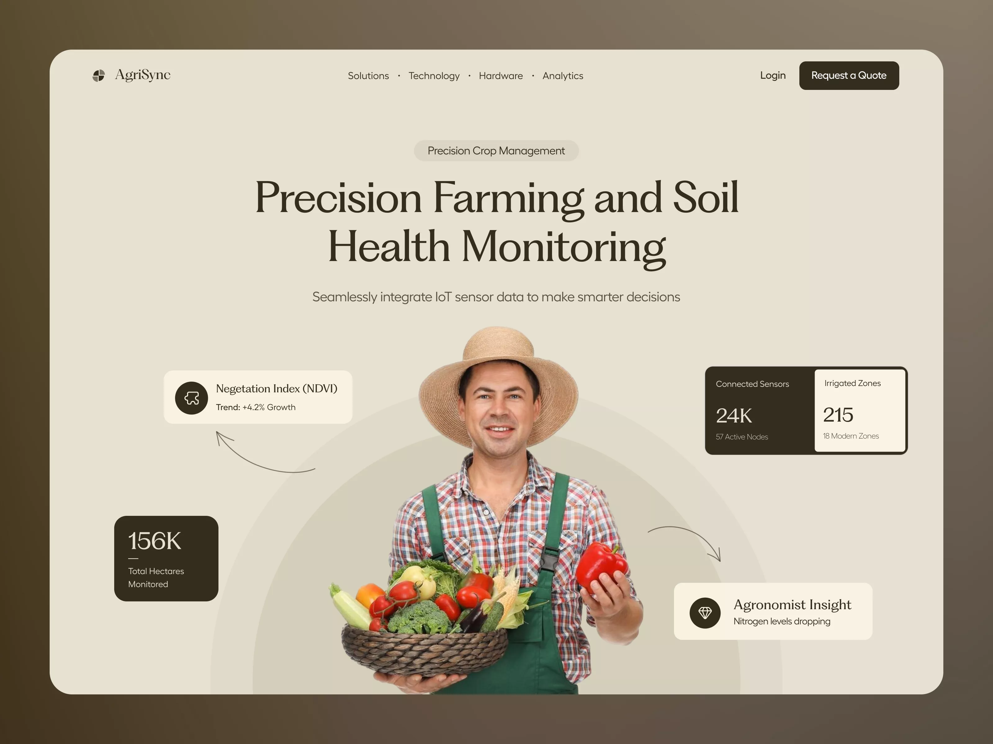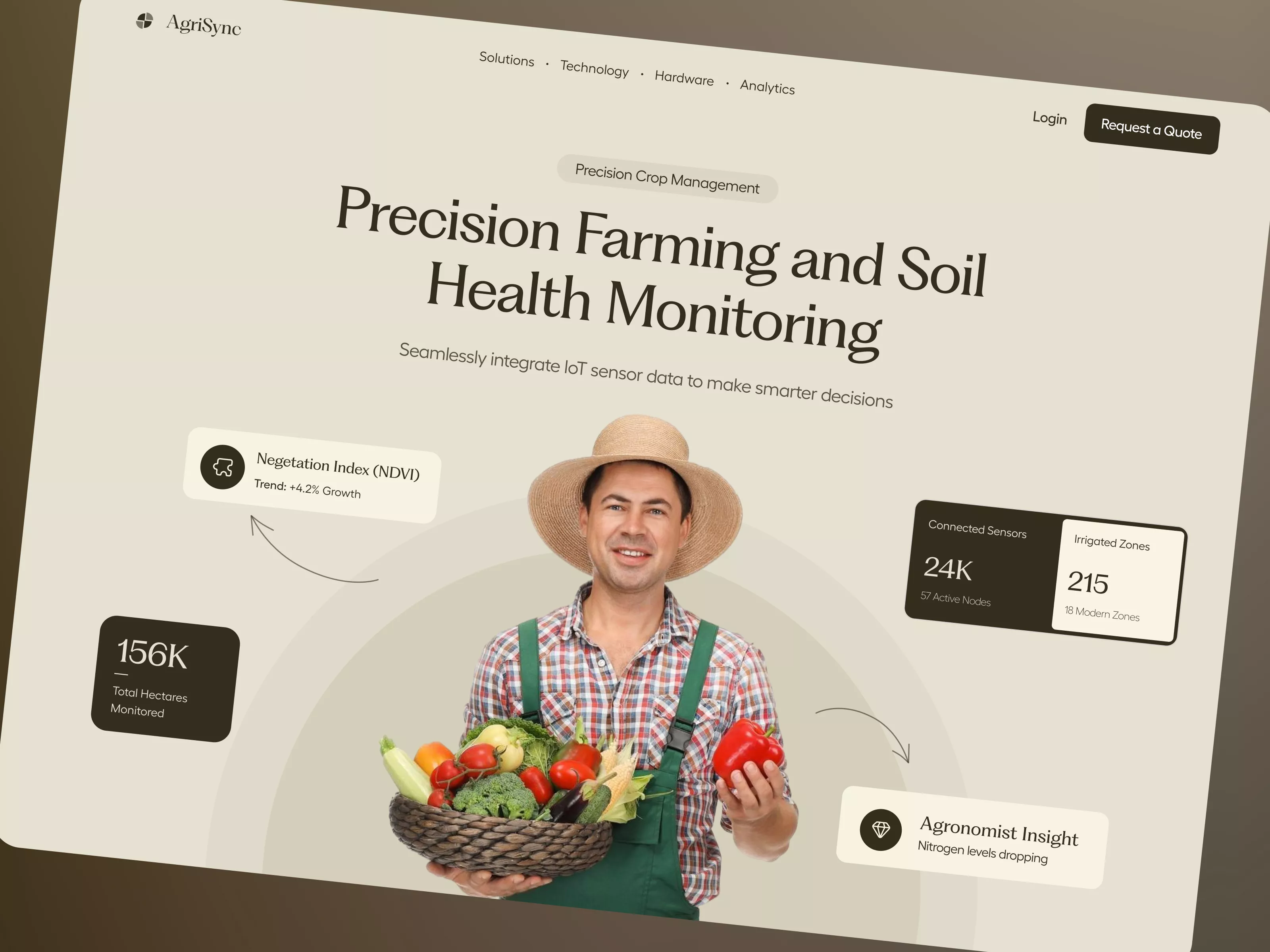 This Precision Farming and Soil Health Monitoring UI design offers a seamless integration of IoT technology to empower farmers with crucial insights and data analytics. The design showcases an attractive interface targeting agricultural professionals who seek to advance their farming operations through technology-driven solutions. The hero section introduces the core functionalities – showcasing real-time sensor data, growth analytics, and actionable insights. The visuals support a narrative of efficiency and informed decision-making, making it ideal for those keen on modernizing agricultural practices. The UI employs a clean, engaging design which features strategic placements of key information such as the vegetation index and agronomist insights. There is also an emphasis on connected sensors and irrigated zones, highlighting extensive data monitoring coverage. With its subtle color palette and professional layout, this design communicates sophistication and reliability. Usability is enhanced through user-friendly navigation and intuitive interface elements. Offered as a Figma file, it provides easy integration, allowing users to copy and paste elements directly into their projects without cumbersome downloads. This design is a perfect match for agriculture technology companies aiming to present comprehensive farming solutions in a visually appealing and practical manner.