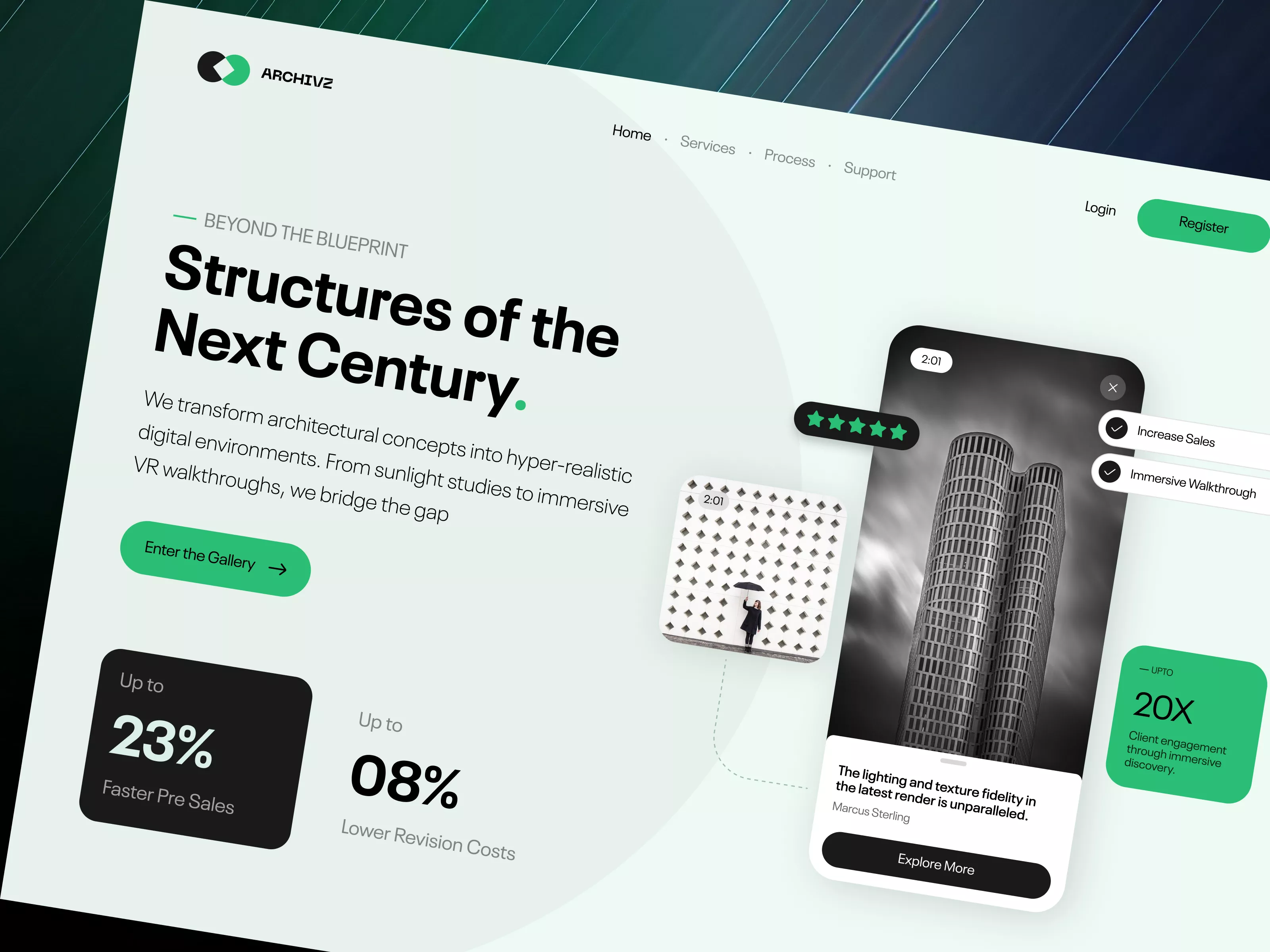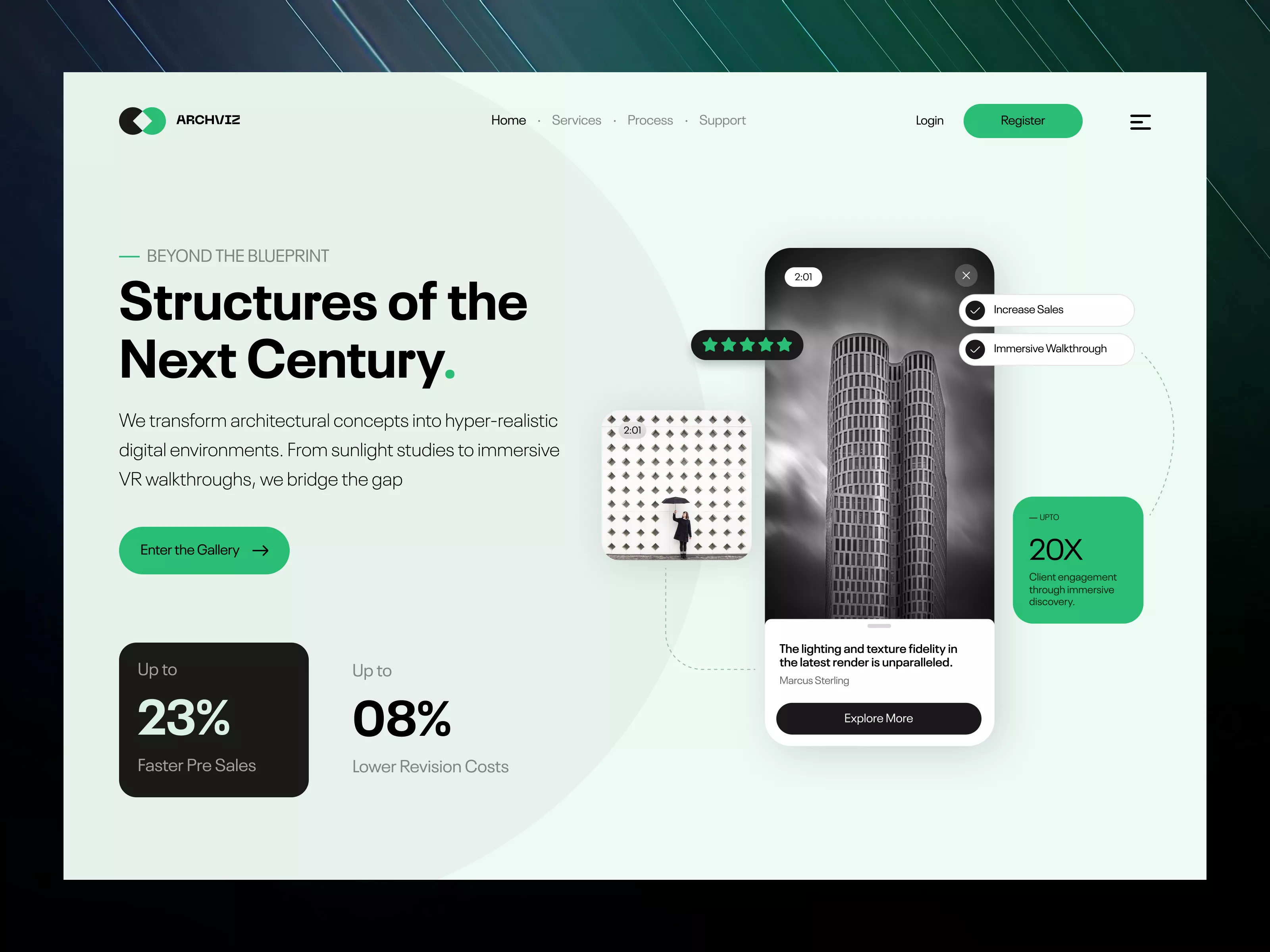 Introducing a cutting-edge UI design crafted for architectural visualization that blends functionality with aesthetic appeal. This sophisticated design caters to businesses eager to transform complex architectural concepts into immersive digital environments. The visuals are clean and modern, utilizing a harmonious color palette that ensures user engagement without overwhelming the senses. The header prominently features a sleek logo alongside a streamlined navigation menu, guiding users effortlessly through Home, Services, Process, and Support sections. The hero section is anchored by a bold statement, 'Structures of the Next Century,' paired with a compelling subtext that highlights the transformation of architectural concepts into hyper-realistic digital spaces. Interactive elements include buttons for entering a gallery and exploring more, enhancing user interaction with seamless transitions. Featured within the design are sections showcasing key metrics, such as faster pre-sales and lower revision costs, alongside engaging visual content to captivate the audience. With a focus on increasing client engagement by up to 20x through immersive discovery, this design is perfect for any firm looking to bridge the gap between blueprints and virtual reality.
