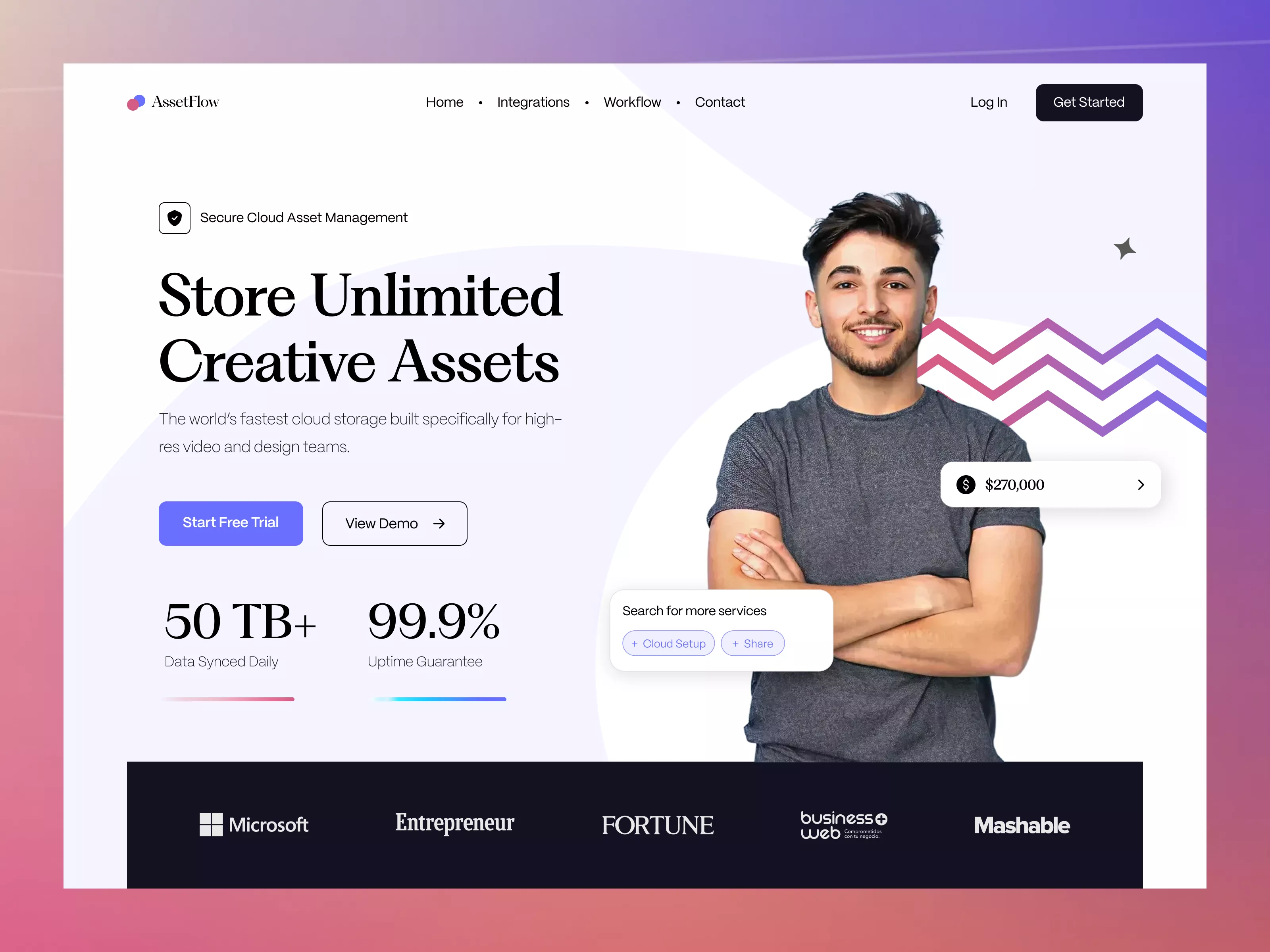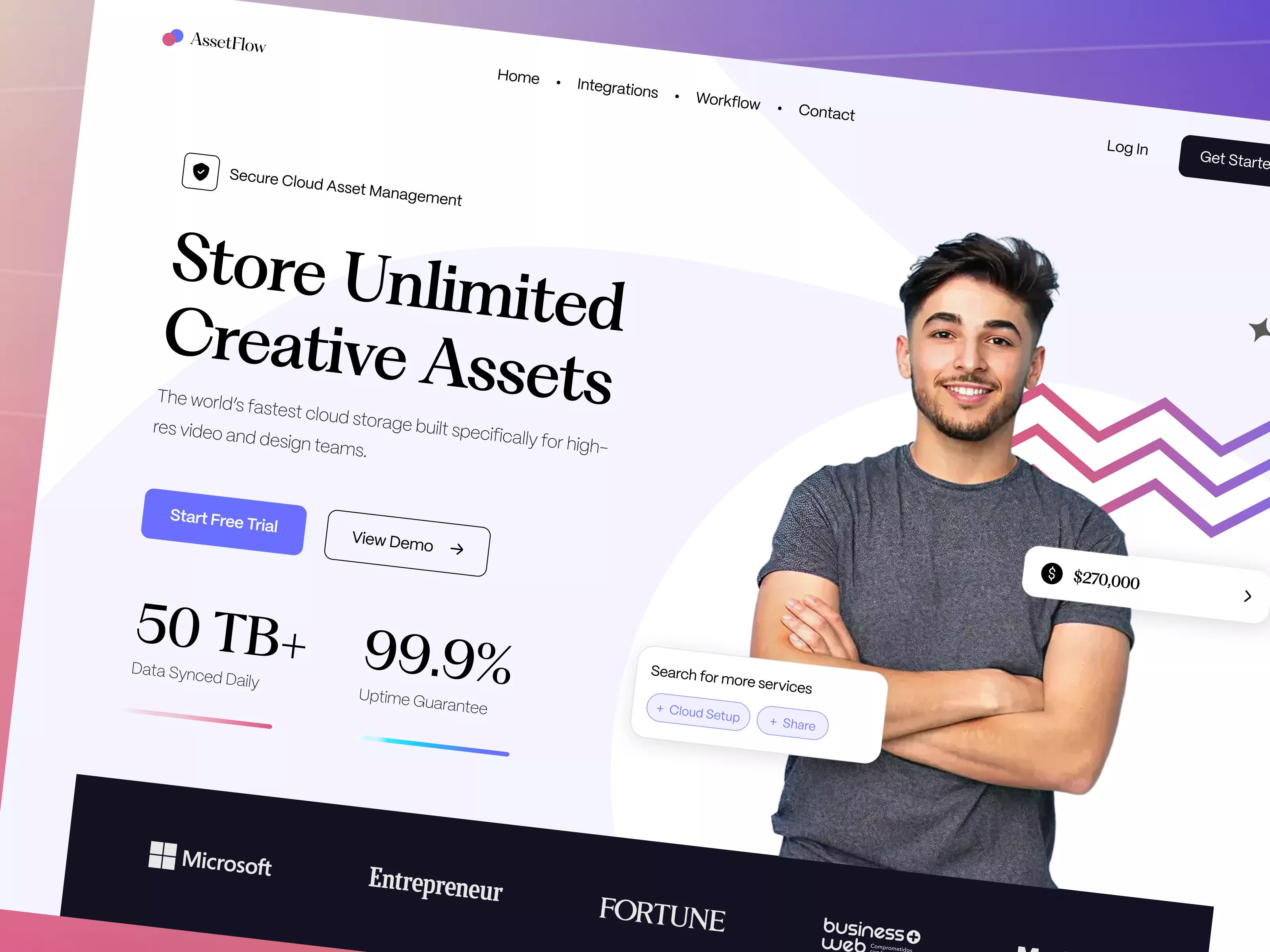 Introducing an exceptional UI design tailored for SaaS platforms, this component truly embodies modern aesthetic appeal and functionality. The layout is meticulously crafted to enhance user engagement, marrying sleek design with dynamic functionality. At its core, this design features a prominent call-to-action area that encourages users to 'Start Free Trial' or 'View Demo', driving conversions with minimal effort. The use of bold typography not only captures attention but enhances readability, ensuring visitors grasp the value offered instantly. Additionally, the inviting hero section presents a captivating image coupled with interactive elements that emphasize client trust and network reach. This Figma template is prepped for seamless integration, allowing designers to directly copy and paste into their projects without any additional downloads. With its intuitive navigation bar showcasing essential sections like Home, Integrations, and Workflow, users can explore with ease, while the login and 'Get Started' buttons are prominently placed for immediate access. Accompanied by metrics like '50 TB+ Data Synced Daily' and a '99.9% Uptime Guarantee', this design instills reliability and performance assurance. A must-have for anyone looking to enhance their digital product’s visual appeal and user experience.