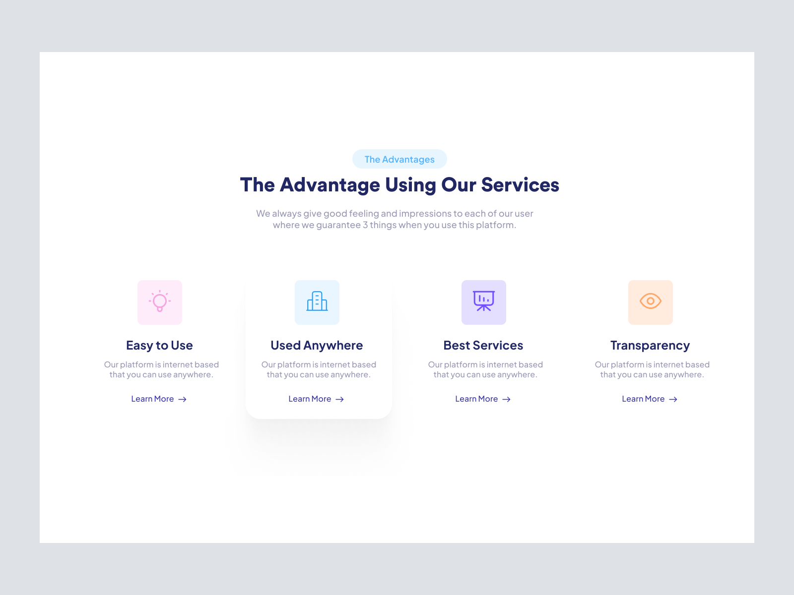 Introducing an elegantly structured UI design layout tailored for showcasing the core advantages of any service or platform. This design captures the essence of minimalism paired with effective communication, ensuring that your users are immediately drawn to the most critical aspects of your offerings. The layout features four distinct sections: Easy to Use, Used Anywhere, Best Services, and Transparency. Each section is highlighted with unique pastel icons, choosing colors that not only complement each other but also evoke a sense of calm and trust. A clean, sans-serif font is used to ensure readability and modernity, which aligns perfectly for both web and mobile platforms. This Figma template is ready to integrate directly into your projects without the need for additional files or downloads. With intuitive spacing and a well-thought-out hierarchy, this design allows your content to breathe, thereby engaging your audience effectively. Our template is internet-ready, ensuring that it performs consistently across different devices and platforms. Perfect for businesses looking to emphasize reliability, accessibility, and exemplary service, this template will not only enhance the visual appeal of your content but also increase conversion rates by directing users towards detailed insights through strategically placed ‘Learn More’ CTA buttons.