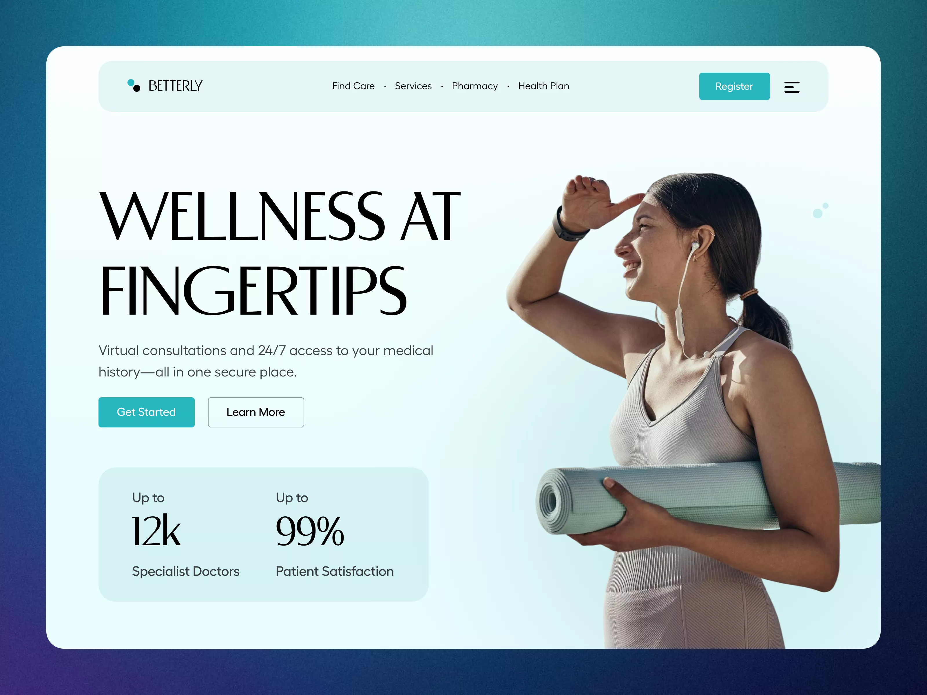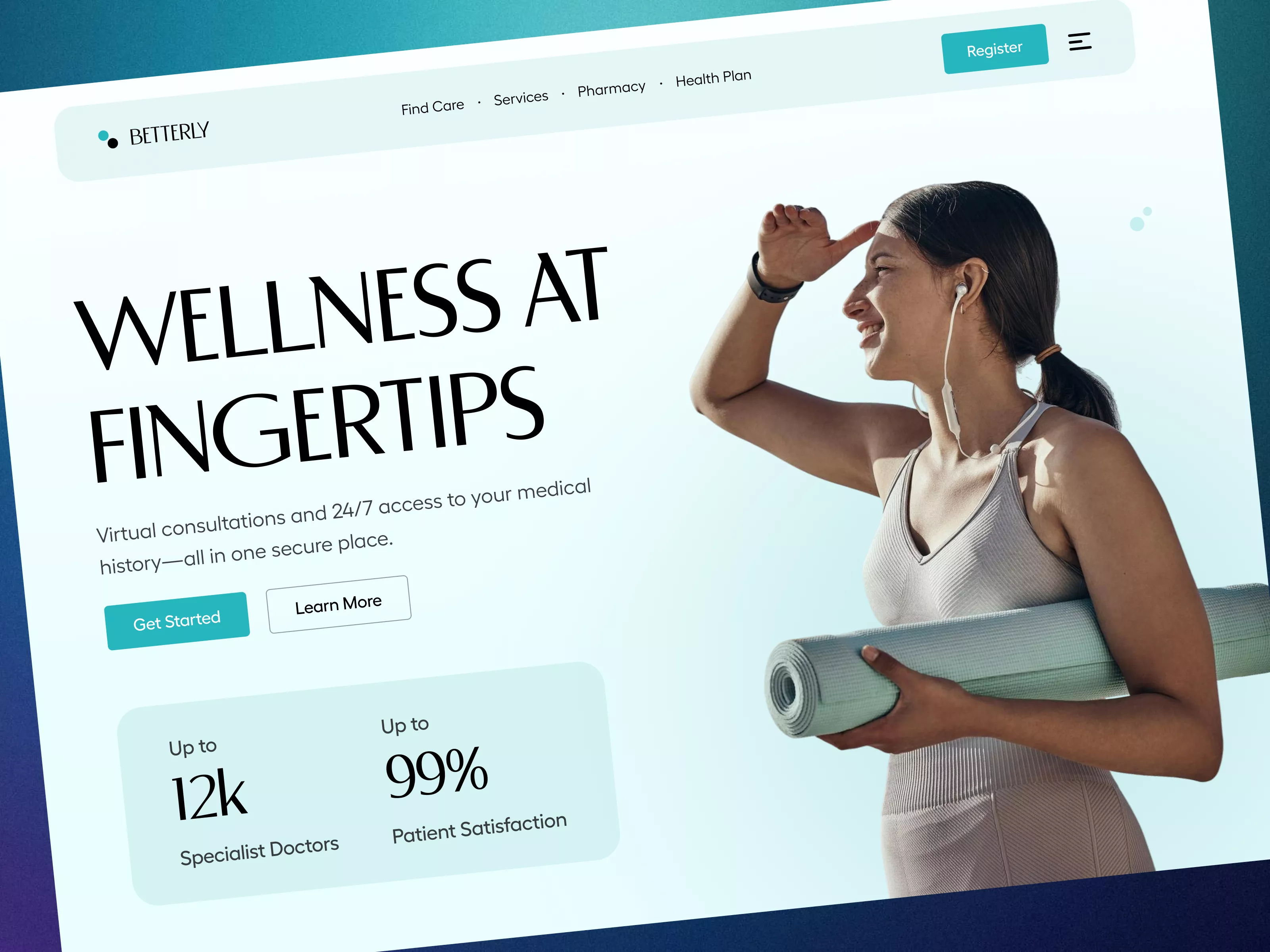 Introducing a clean and modern UI design tailored for healthcare and wellness industries. This design offers a seamless user experience with an emphasis on accessibility and efficiency. The top navigation bar includes intuitive links for 'Find Care', 'Services', 'Pharmacy', and 'Health Plan', ensuring users can quickly locate desired services. The 'Register' button is prominently positioned, facilitating easy account creation. With an engaging hero section showcasing a motivational image, the design resonates with users seeking virtual consultations and 24/7 access to medical history. Promotional components highlight impressive statistics, such as 12k specialist doctors and a 99% patient satisfaction rate, building trust and credibility. The design's color palette is calming and professional, suitable for healthcare environments. Each UI component has been crafted to encourage interaction while maintaining an aesthetically pleasing layout. Users can transition smoothly across sections, making it ideal for web designers aiming to enhance user engagement. Delivered in a flexible Figma format, this UI component can be effortlessly copied and pasted, streamlining integration into existing projects. Elevate your digital presence with a design that harmonizes functionality and beauty.