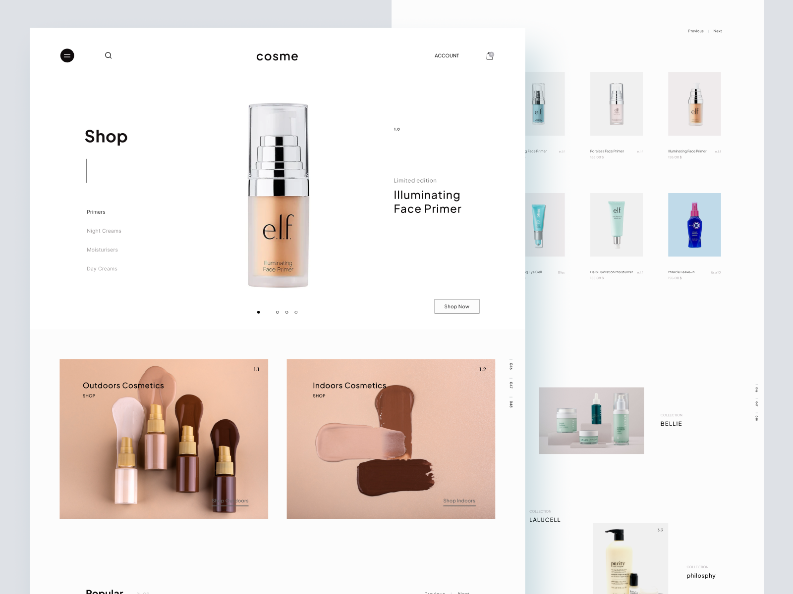 Introducing our sleek and modern UI design tailored for e-commerce websites, specifically those selling cosmetics and beauty products. This responsive and intuitive design showcases a visually appealing layout with a minimalistic aesthetic. It features a clean white background that allows the product images to stand out, creating a sophisticated shopping experience. The navigation is streamlined and user-friendly, with a simple drop-down menu on the left, enabling easy access to different product categories such as Primers, Night Creams, Moisturizers, and Day Creams. The main section highlights a featured product with an eye-catching call-to-action button, 'Shop Now,' inviting visitors to make a purchase. The product gallery is elegantly organized, displaying multiple product options with clear images, prices, and names. It also includes a carousel feature for easy browsing. Designed with Figma, this UI layout allows direct copy and paste functionality, making it incredibly convenient for designers. Enhance your online store with this design that balances visual appeal and functionality to boost user engagement and sales.