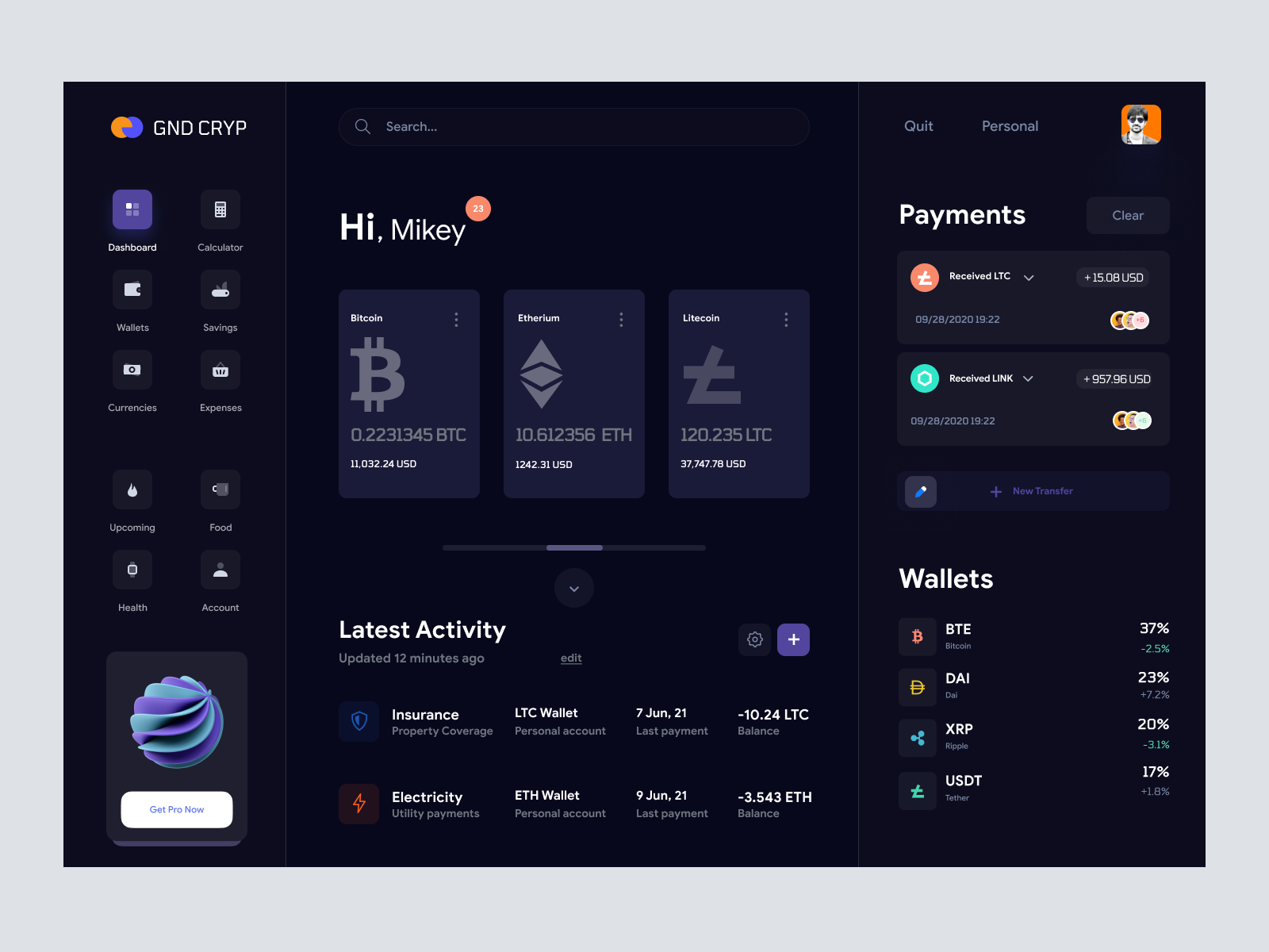 CryptoCore - Cryptocurrency Dashboard UI Concept Dark Version