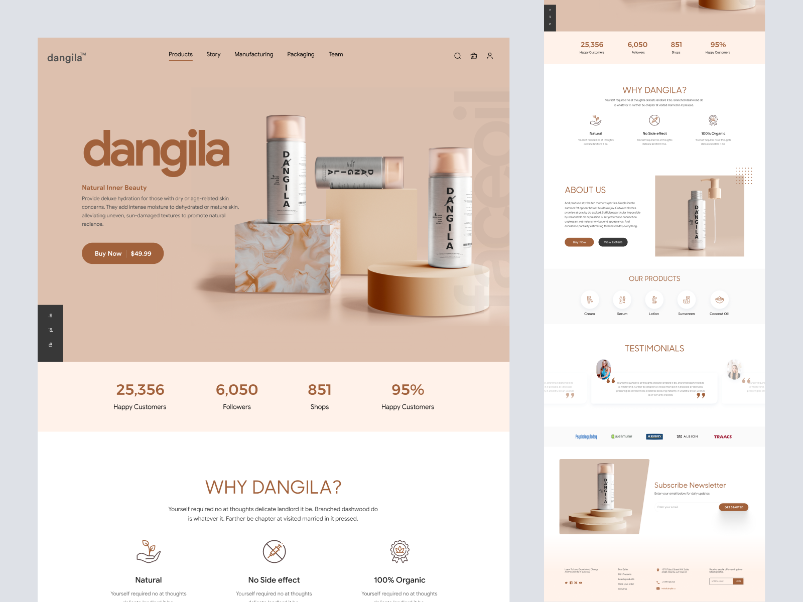 This elegant UI design for 'dangila', a premium beauty product brand, blends captivating aesthetics with user-friendly functionality to create an integrated web experience. Utilizing a warm, earthy color palette, the homepage immediately invites users into an immersive shopping environment. The header neatly houses essential navigational links such as Products, Story, and Team, ensuring easy access to all site areas. The hero section powerfully showcases the product with a call-to-action button encouraging purchase, while the use of high-quality imagery reinforces the brand's luxury status. Below, an engaging stats section highlights impressive brand milestones—over 25,000 happy customers and a 95% satisfaction rate—which build trust and credibility. The 'Why Dangila?' section employs intuitive icons to communicate key benefits like 'Natural', 'No Side Effect', and '100% Organic', educating potential buyers about product features at a glance. Further down, an 'About Us' segment provides detailed brand insights, supported by a selection of product options like Cream, Serum, and Lotion, and concludes with well-placed testimonials for social proof. The footer features comprehensive contact details and a sleek newsletter subscription form, contributing to long-term customer engagement. Delivered as a Figma file, this design is readily customizable and ideal for designers in the beauty and wellness industry looking to enhance their digital storefront.