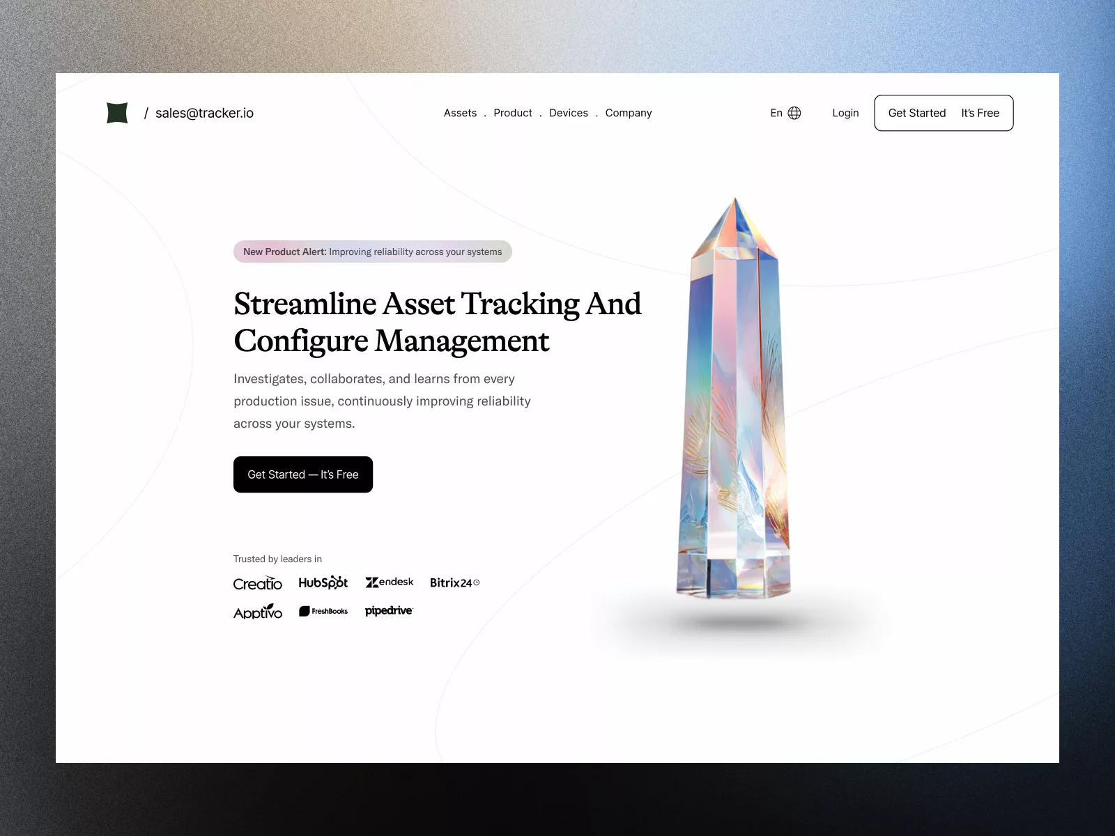 This stunning UI design is crafted specifically for modern websites aiming to captivate and engage their audience effectively. Designed to streamline asset tracking and configure management processes, this layout showcases a minimalist aesthetic with an elegant use of white space and a captivating central image of a crystalline structure, symbolizing clarity and precision. The typography is bold yet refined, catching the eye with its simplicity and underlining the professionalism your business deserves. Seamlessly integrated navigation options like 'Assets,' 'Product,' 'Devices,' and 'Company' ensure users navigate with ease, enhancing their overall experience. The strategic placement of a call-to-action button – 'Get Started – It's Free' – encourages user conversion by leveraging psychological triggers and best practices in UI design. The use of trusted brand logos at the bottom adds a layer of credibility and trust, reassuring potential clients of the quality and reliability of your offerings. This UI is embedded directly into your Figma workflow without the hassle of downloading, allowing for immediate customization. Ideal for tech companies, software brands, or any business seeking a sleek, modern web presence.