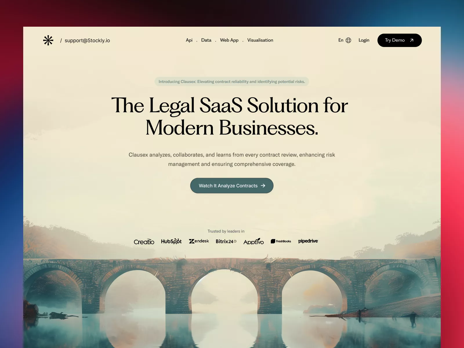 Introducing our latest UI design for a sophisticated SaaS solution tailored for modern businesses. This design exudes professionalism and elegance with its clean lines, spacious layout, and strategically placed call-to-action buttons. The design begins with a prominent header showcasing a support email and navigation menu that includes core services like API, Data, Web App, and Visualization. The body features an impactful headline, 'The Legal SaaS Solution for Modern Businesses,' encapsulated by a concise subheading that details the innovative functionalities of 'Clausex.' The background image of a serene bridge over misty waters adds a touch of tranquility, blending seamlessly with the overall theme. Below the main content, renowned brand logos depict trust and reliability, underlining the credibility and reputation of your SaaS product. This Figma file allows easy integration; you can quickly copy-paste it directly without downloading, enhancing workflow efficiency. Designed with both aesthetics and functionality in mind, it's perfect for companies aiming to make a compelling digital presence.