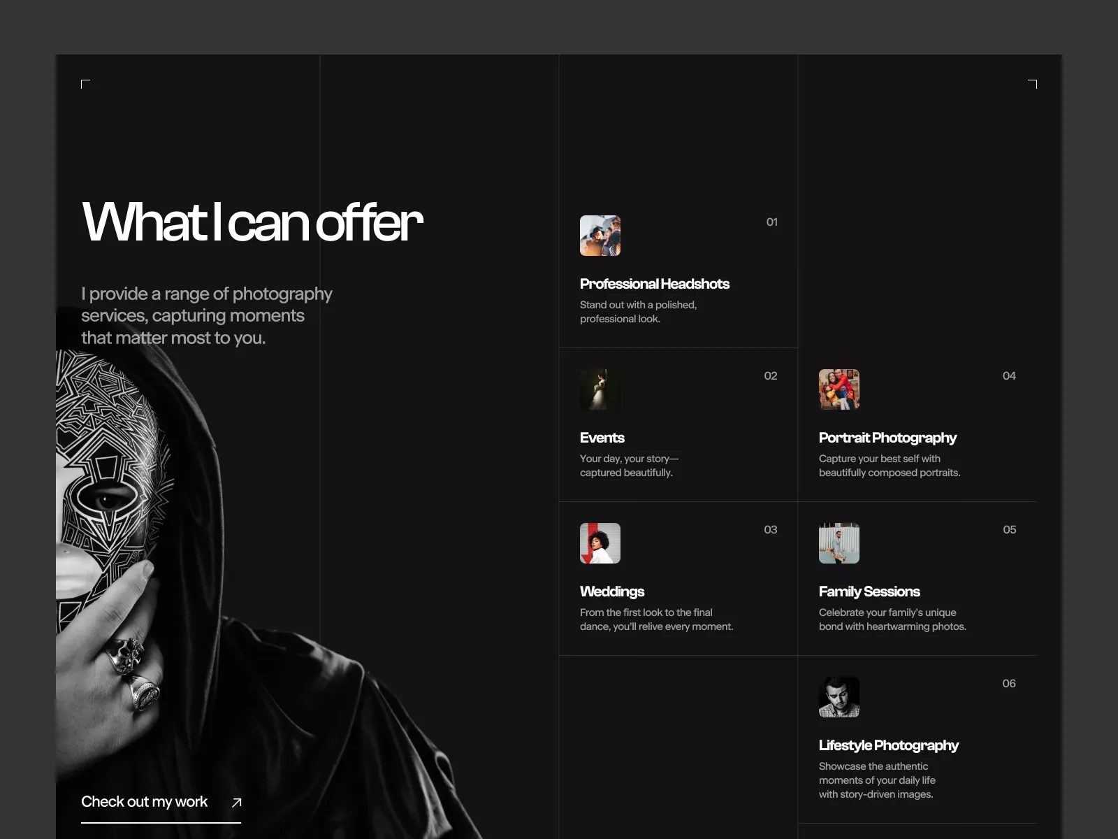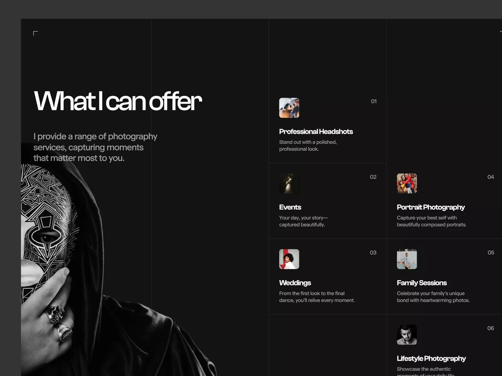 Modern, monochrome UI design for showcasing photography services, fully customizable in Figma for a professional online portfolio.