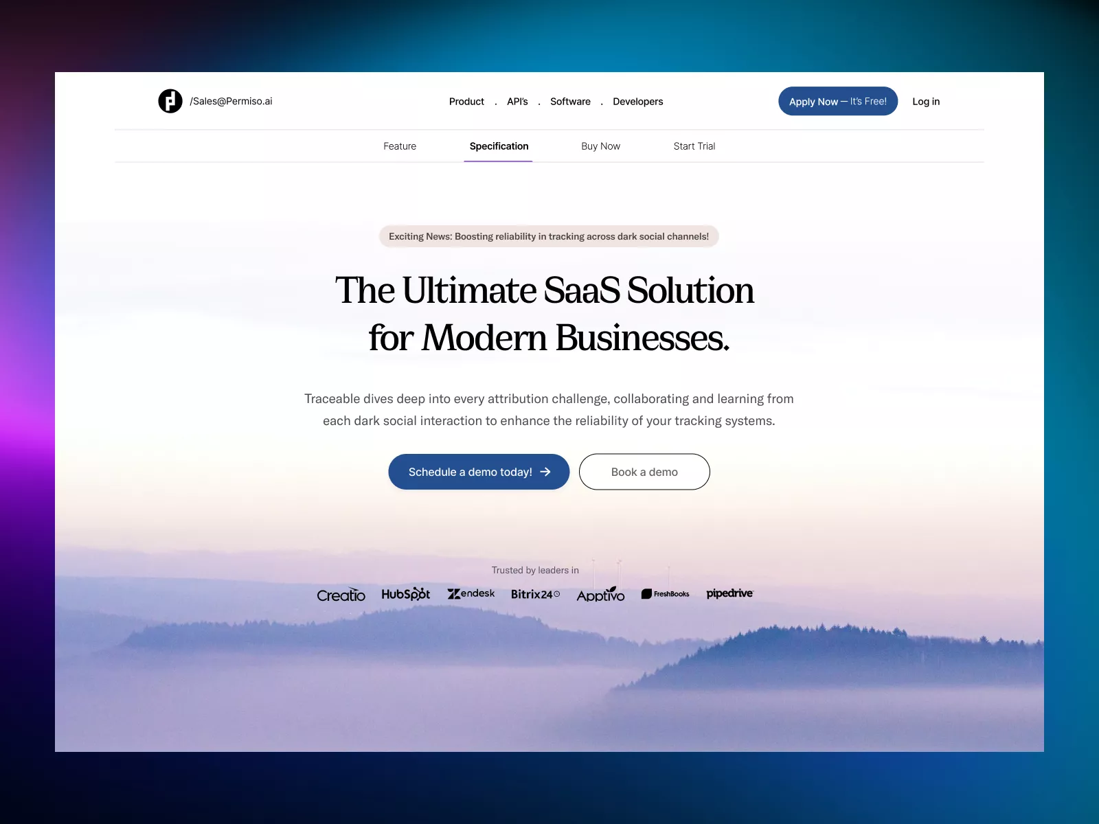 This UI design presents a sophisticated and seamless solution for SaaS websites, tailored to captivate the attention of modern businesses seeking innovative digital solutions. With its clean layout and elegant typography, this design ensures a professional aesthetic that resonates with tech-savvy audiences. The navigation bar is intuitively structured with clear sections like 'Product', 'APIs', 'Software', and 'Developers', making it effortless for users to explore. The striking headline, 'The Ultimate SaaS Solution for Modern Businesses', immediately communicates the core message, while the subheadline highlights the unique selling proposition – the ability to trace every attribution challenge across dark social channels. A prominent call-to-action section featuring buttons like 'Schedule a demo today' ensures easy user engagement. Recognizable logos at the bottom convey reliability and trust, showcasing alliances with industry leaders. The subtle background of misty mountains adds a serene touch, creating a balance between corporate professionalism and visual appeal. Delivered as a Figma file, this design allows for efficient customization with seamless copy-paste functionality.