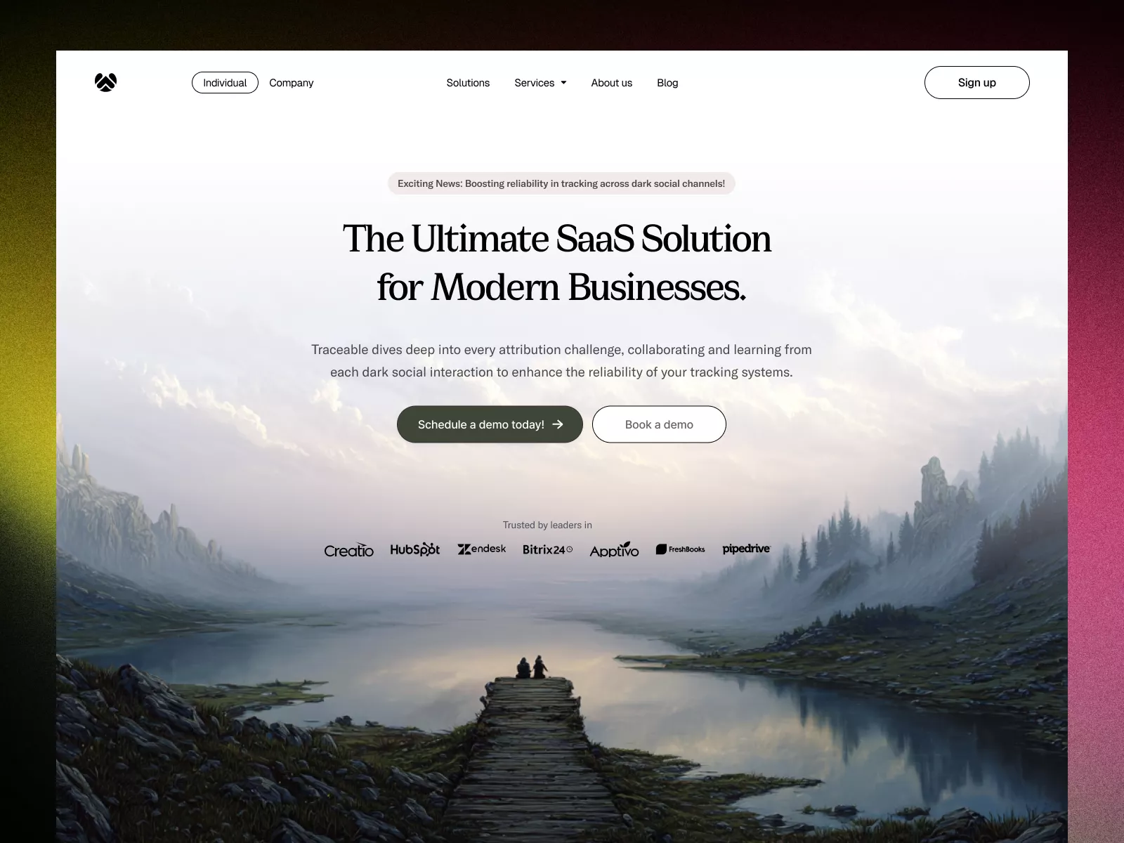 Experience a seamless blend of form and function with our cutting-edge UI design tailored for modern SaaS businesses. This design showcases a striking balance between aesthetic appeal and user-centric functionality, ensuring your website not only captivates visually but also delivers an intuitive user experience. At its core, this design features a majestic background landscape that evokes a sense of calm and clarity, aligning with the professional tone aimed at engaging top-tier companies. A minimalist and responsive interface is structured to highlight core offerings and features, allowing your brand's message to be communicated clearly and effectively. Interactive elements such as the 'Schedule a demo' and 'Book a demo' buttons are strategically positioned to enhance call-to-action experiences, driving user engagement. The design’s compatibility with Figma ensures that components can be easily copied and pasted, streamlining your workflow and customization process without the need for additional downloads. Ideal for businesses seeking to make a powerful first impression, this design is trusted by industry leaders, creating an affirmation of credibility and innovation. Elevate your digital presence with a design that speaks to the future of SaaS solutions.