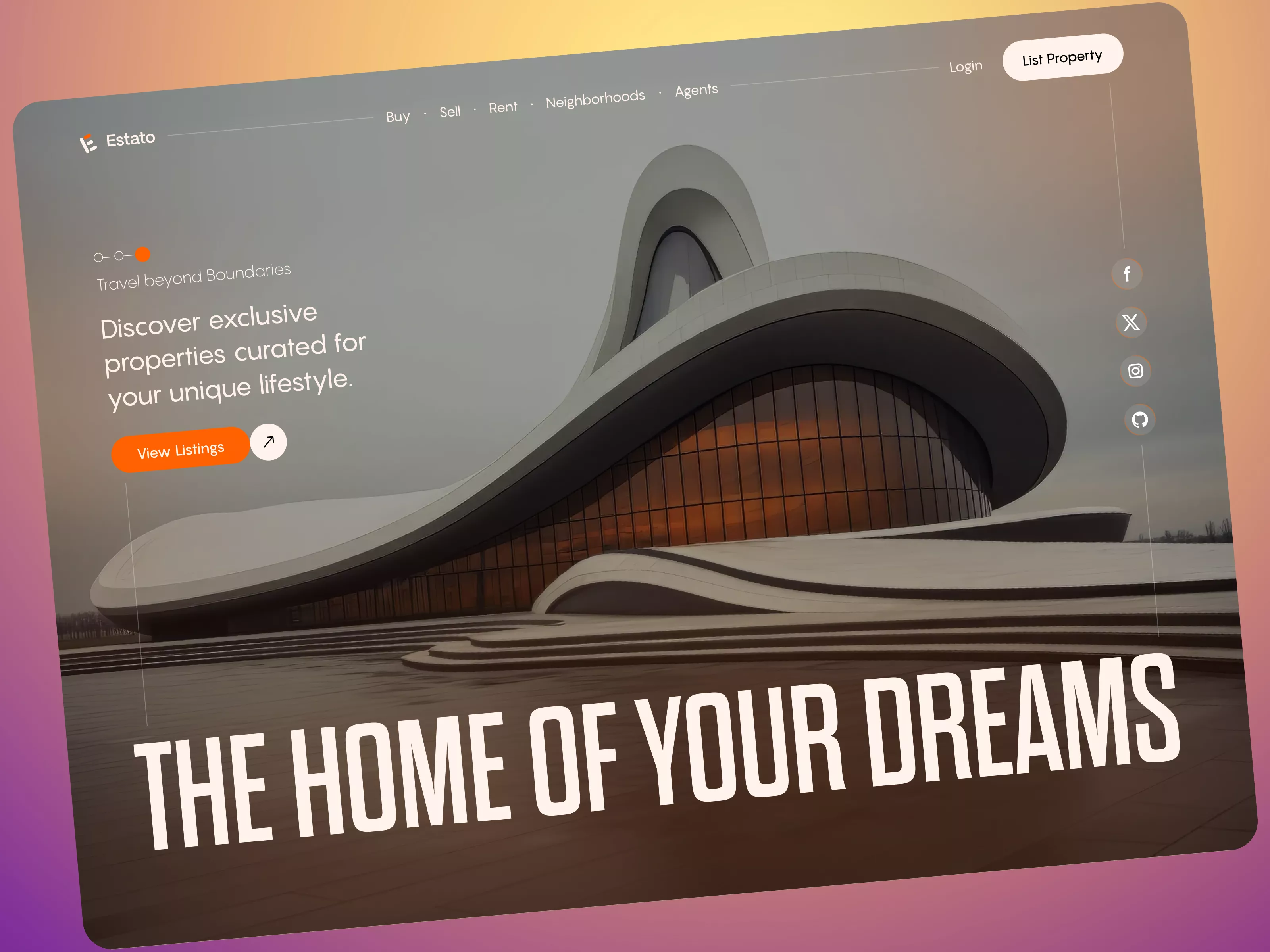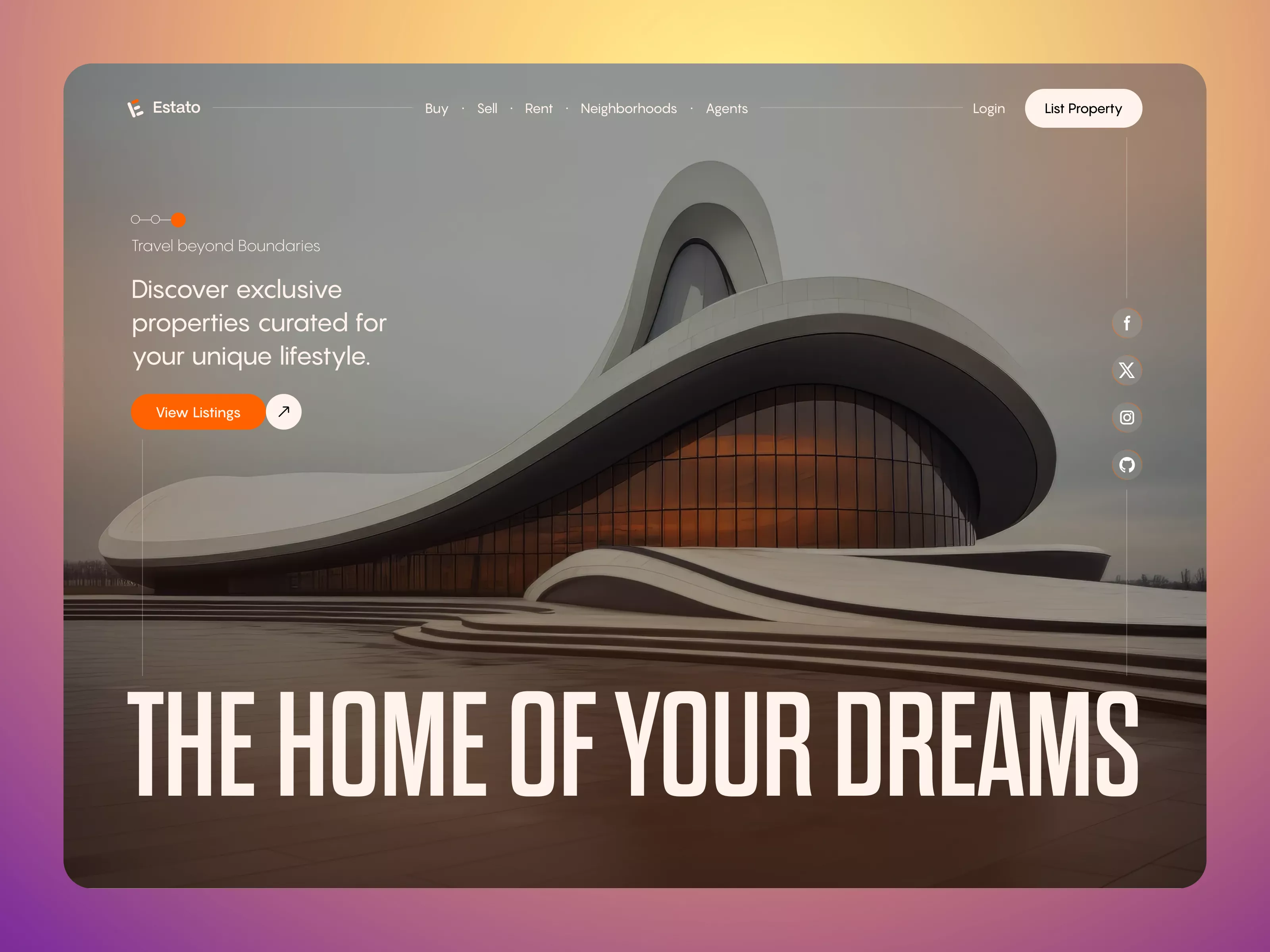 This beautifully designed user interface is perfect for a website dedicated to selling exclusive property listings. The design is sleek, featuring a modern architectural image that immediately draws the visitor's eye, perfectly complemented by a gradient blend of warm, inviting colors in the background. The navigation bar is simple yet effective, allowing users to easily access different sections such as 'Buy', 'Sell', 'Rent', 'Neighborhoods', and 'Agents'. The smooth, rounded corners of the design elements lend a sophisticated yet friendly aesthetic, inviting users to explore the listings. The call-to-action button, 'View Listings', is prominently displayed in a striking orange, encouraging interaction. The inclusion of social media icons subtly encourages connectivity and further interaction with potential clients. This Figma file allows easy direct copying and pasting, streamlining the process for designers. Perfect for real estate agencies looking for a unique online presence to showcase exclusive, curated properties, this design offers an innovative and stylish solution.