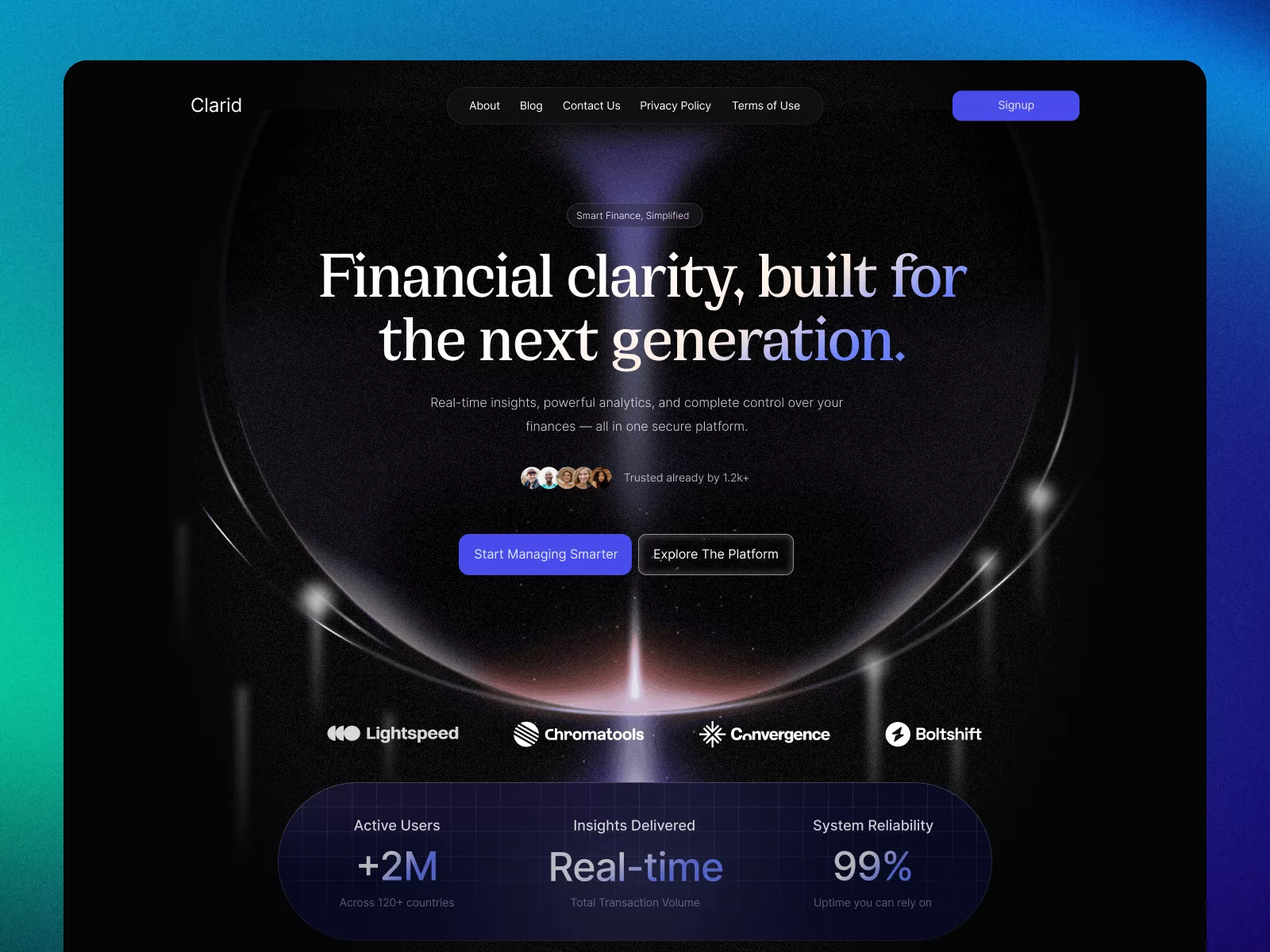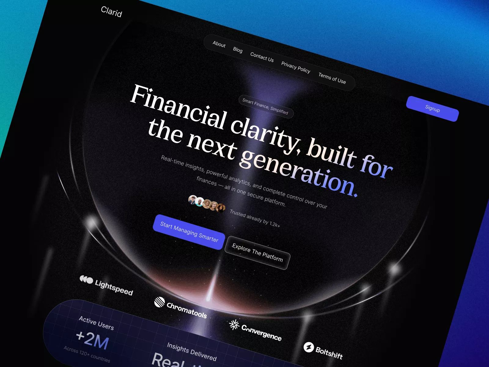 Introducing a cutting-edge UI design tailored for financial services, crafted to offer a seamless user experience with stunning visual appeal. This design combines modern aesthetics with functionality, ensuring that your financial brand stands out in the digital space. The centerpiece of the design is a bold headline that draws users in, promising financial clarity and a next-generation approach. With real-time insights prominently displayed, users are assured of the analytics power that the platform holds. The use of cosmic and gradient backgrounds adds a futuristic touch, while the integration of trusted partner logos builds immediate trust. This design is optimized for clarity and impact, with intuitive navigation options like 'Start Managing Smarter' and 'Explore The Platform'. Key metrics such as active users, insights delivered, and system reliability create a persuasive overview of the service's strengths. Designed in a Figma file format, this UI component is perfect for designers seeking to elevate financial websites. Easy to integrate with direct Figma copy-paste functionality, this design ensures both flexibility and ease of use, eliminating additional download requirements. It's an ideal choice for businesses aiming to marry functionality with a compelling visual narrative.