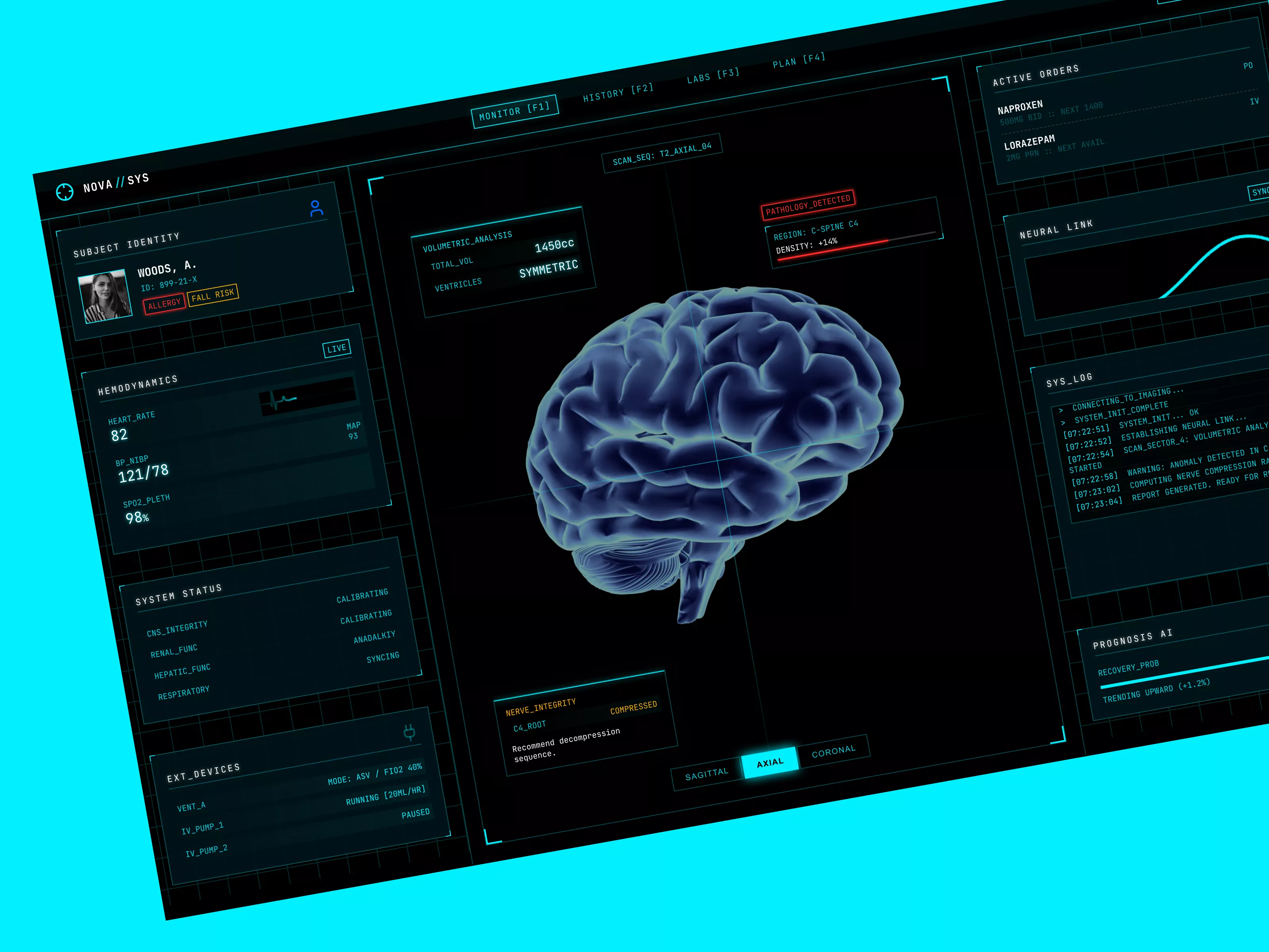 Immerse yourself in cutting-edge design with this futuristic UI concept tailored for those who crave intuitiveness and aesthetic appeal. This professionally-crafted Figma file offers a sleek, streamlined interface perfect for healthcare technology, complete with real-time data tracking and seamless navigation. The design highlights essential elements such as subject identity, hemodynamics, and active orders, allowing for efficient monitoring and decision-making. The centrepiece features a 3D visualization of a brain, enhancing visual engagement through advanced volumetric analysis and neural link statistics. The side panels provide a detailed system status and log, offering real-time insights and anomaly detection, augmented by an intelligent prognosis AI. The color palette, dominantly rich in blacks and cyans, is complemented by subtle gradients, adding depth and emphasis. Every element ensures clarity and usability, suited for both professional and detailed project presentations. Moreover, its inclusion as a Figma file allows designers to seamlessly integrate the entire layout into their own projects, customizable to fit various requirements without the hassle of file downloads.