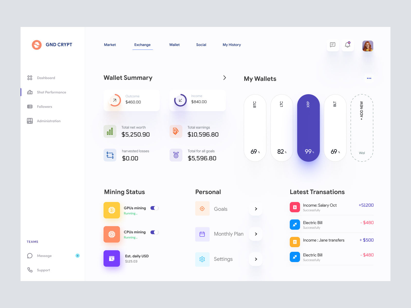 Discover the ultimate crypto wallet dashboard UI design tailored for modern financial applications. This sleek, minimalistic layout offers an intuitive user experience, tailored to simplify the complexities of cryptocurrency management. The design hosts a detailed Wallet Summary, showcasing vital statistics such as income, outcome, total net worth, and earnings, all beautifully visualized for easy comprehension. Users can effortlessly monitor their cryptocurrency portfolio across various wallets like BTC, LTC, and XRP, with graphical bars indicating percentages for quick insights. The Mining Status section allows users to check their GPU and CPU mining operations at a glance, while the Personal section keeps users organized through Goals, Monthly Plans, and Settings. This versatile design also includes a Latest Transactions panel, which provides up-to-date financial activities, enhancing user engagement by fostering transparency. Delivered as a Figma file, this UI design enables seamless integration into your projects, offering the flexibility of copy-and-paste elements directly into your workspace, conserving both time and effort.