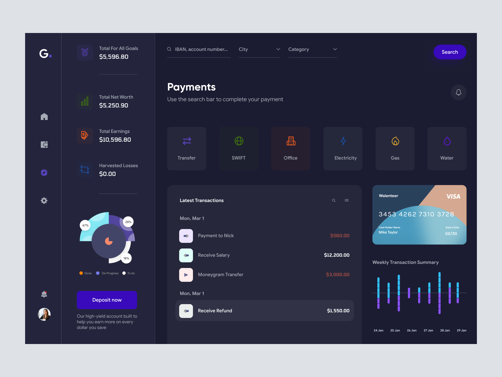 Introducing a sleek and modern dashboard UI design, tailored to bring both functionality and aesthetics to your financial management applications. This design integrates seamlessly into your existing projects, providing a harmonious blend of intuitive navigation and detailed data visualization. From the comprehensive side navigation panel highlighting total goals, net worth, and earnings, to the interactive payment and transaction management center, every aspect is crafted to optimize user experience. The vibrant color scheme, minimalist iconography, and strategic layout ensure quick access to essential features such as transaction history, payment methods including SWIFT transfers and utilities payment, and a secure card management area. This design comes in a fully editable Figma file format, enabling designers to effortlessly customize elements and personalize the interface according to specific project needs. Enhance user engagement and streamline digital transactions with this cutting-edge UI design that speaks both style and substance.