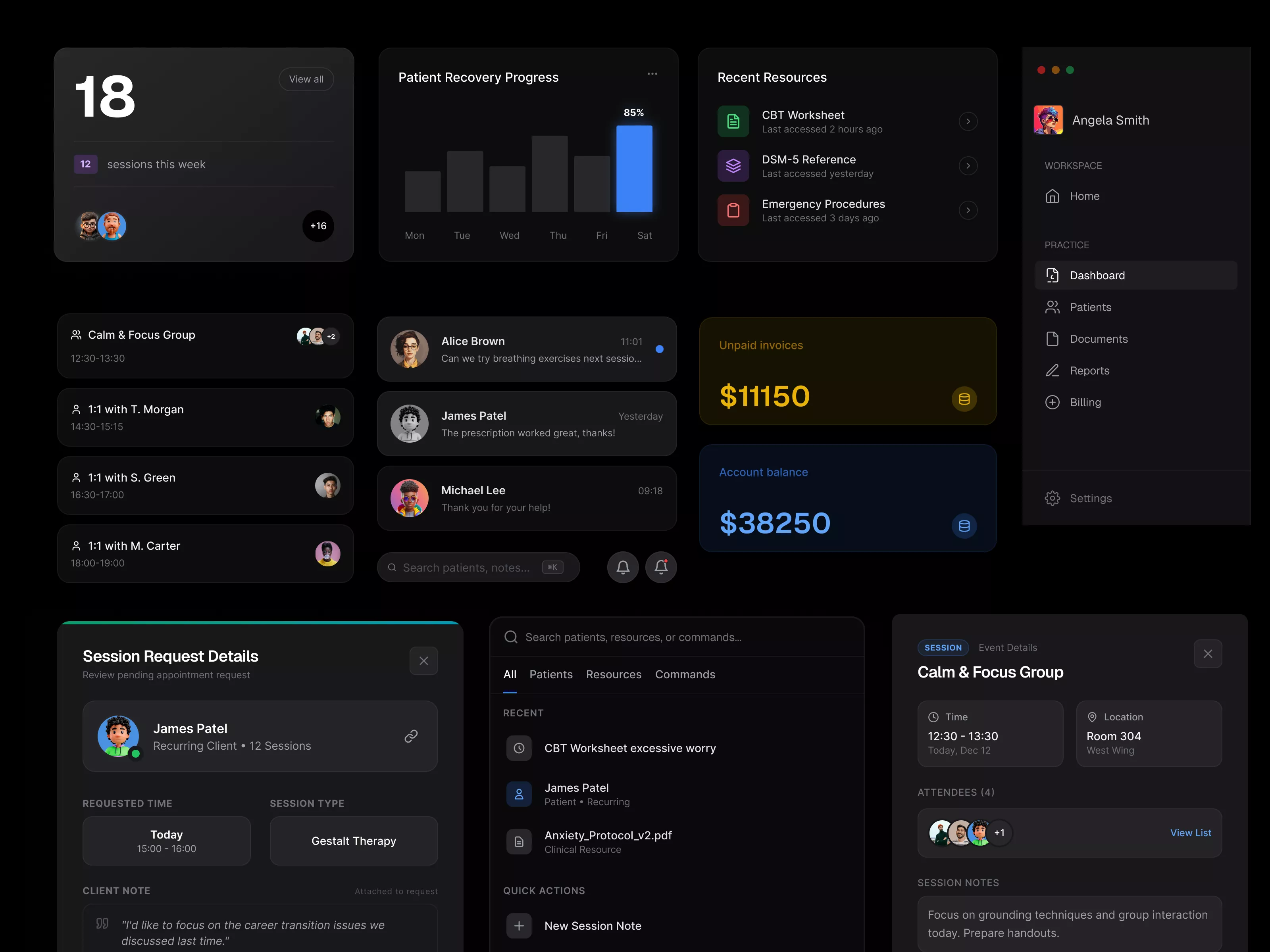 Immerse yourself in a neatly organized and visually captivating UI design tailored for professionals seeking an intuitive dashboard experience. This design emphasizes seamless interaction and accessibility for users who demand a comprehensive overview of financial metrics, client interactions, and session scheduling. The visually appealing color palette of dark backgrounds with vibrant highlights ensures enhanced focus and readability, catering to user needs for clarity and ease of navigation. Among its standout features, the design includes financial summaries such as unpaid invoices and account balances, maintaining a professional edge while facilitating financial oversight. The dashboard design optimally displays recent messages, session requests, patient recovery progress, and essential resources access. It features a right-side panel dedicated to daily agenda management, letting users keep track of their schedule effectively. Additionally, the left-side navigation menu offers quick access to essential sections like Patients, Documents, and Billing, enhancing efficiency. Delivered in a Figma file format, this design allows for instant integration and customization, enabling designers to accelerate their workflow by copying and pasting into their existing projects effortlessly. Its sophisticated aesthetic and high functionality make it an ideal choice for industries such as healthcare, finance, and consulting.