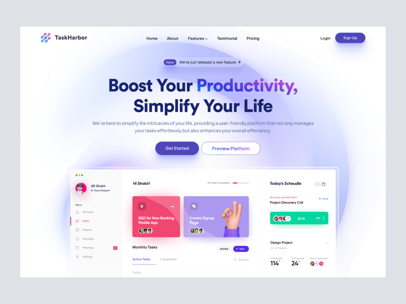 Introducing TaskHarbor, your ultimate UI design solution to enhance productivity and streamline life with elegance and functionality. This design, crafted with the modern designer in mind, features a sleek, intuitive layout that is both visually appealing and highly functional. The interface incorporates a minimalist aesthetic with a harmonious blend of colors, bringing a refreshing look to task management. With easy navigation, users can effortlessly access features like projects, standups, meetings, and settings. The homepage offers two prominent call-to-action buttons 'Get Started' and 'Preview Platform' that guide users through the journey of productivity enhancement. The clean typography, paired with strategic spacing, ensures maximum readability and user engagement. This UI design also includes a highly interactive dashboard that showcases tasks, schedules, and progress in a clear, concise manner. Offered as a Figma file, designers will enjoy the ease of copying and pasting assets directly without downloading, optimizing both time and creativity. Ideal for designers looking to revolutionize how they present task management solutions, this design is a blend of beauty and efficiency.