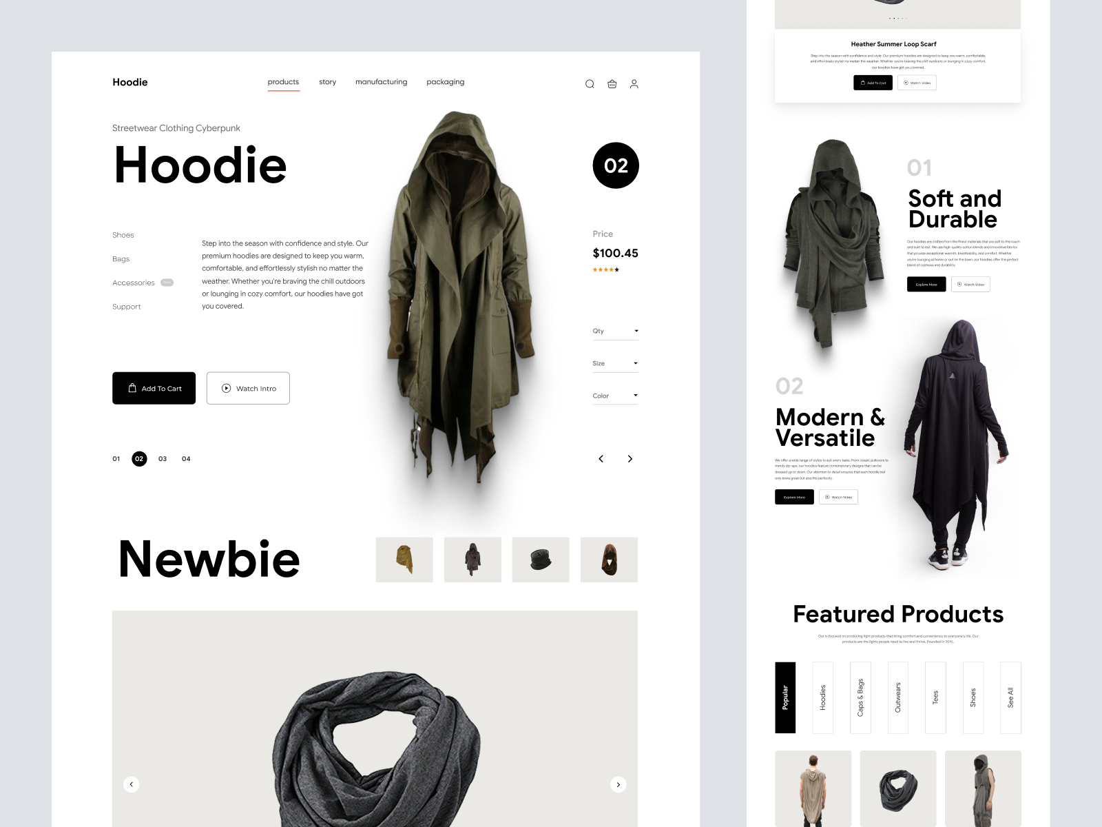 Introducing our meticulously crafted UI design for an e-commerce platform, tailored for a modern and seamless shopping experience. This design centers around a sleek and stylish hoodie collection, showcased with captivating imagery and a minimalist aesthetic. The homepage is clean, with a strategic use of white space and a sophisticated typography style to emphasize product details and pricing. The design offers an intuitive user flow, with easily accessible navigation to product specifications, and options to add items to the cart or watch an introductory video. The versatile layout adapts seamlessly to various devices, ensuring a consistent user experience across platforms. Downloadable as a Figma file, this design can be effortlessly integrated into your projects, allowing instant customization and implementation.