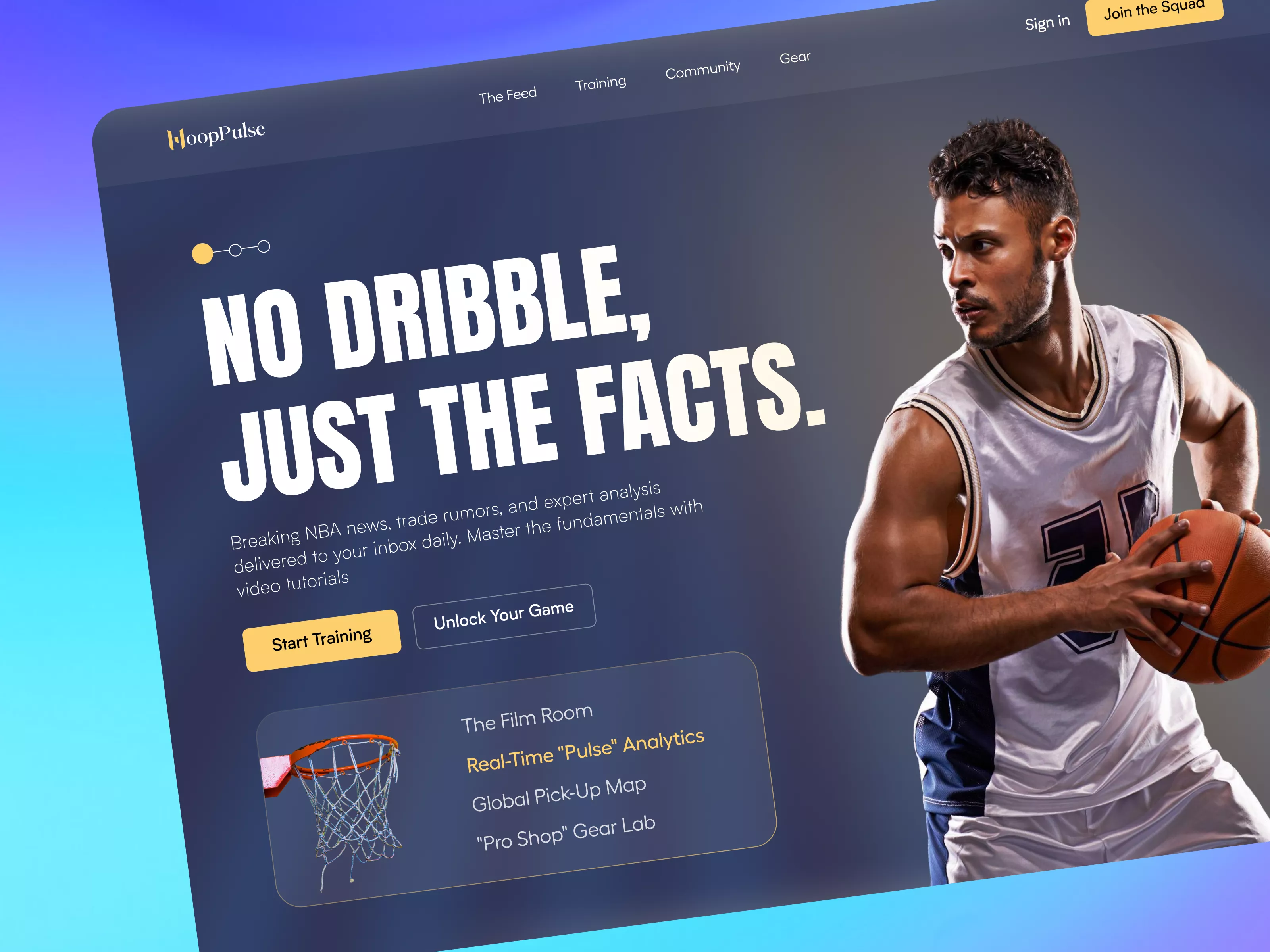 Introducing our premium UI design for HoopPulse, a vibrant and contemporary web page template tailored for sports enthusiasts and professionals alike. This Figma file offers an intuitive and engaging user experience, featuring a bold and impactful headline: 'NO DRIBBLE, JUST THE FACTS.' Designed with the modern basketball aficionado in mind, the layout combines dynamic imagery with clean typography to convey a sense of motion and excitement. The navigation menu is streamlined, allowing users to access sections such as The Feed, Training, Community, and Gear with ease. The call-to-action buttons, 'Start Training' and 'Unlock Your Game,' are strategically placed to encourage interaction and deeper engagement. The design incorporates gradient backgrounds and a sleek color palette that complements the sporty aesthetic while ensuring readability and accessibility. Users can expect seamless integration into their projects, thanks to the Figma file format enabling easy copy and paste functionality. Whether you're creating an interactive platform for NBA news or developing a community hub for basketball enthusiasts, this UI design provides the perfect blend of form and function.