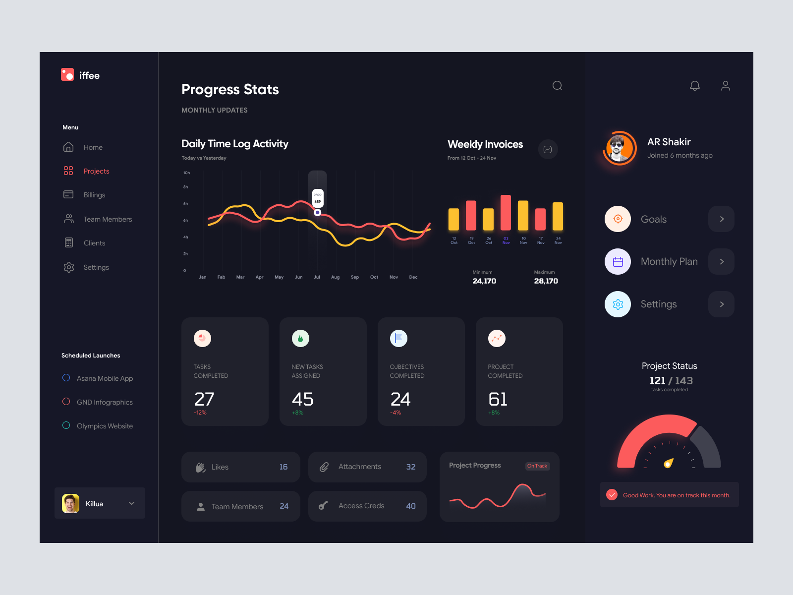Discover our cutting-edge UI dashboard design, crafted specifically for professionals seeking sleek and functional interfaces. This design boasts a dark-themed layout that enhances visibility and focus. The central module efficiently displays progress stats, with intuitive graphs like the Daily Time Log Activity and Weekly Invoices, offering users a clear visual interpretation of their data. Engaging color contrasts accentuate critical information such as task completion rates and project status, keeping key insights front and center. An organized sidebar offers easy navigation to various sections such as Projects, Billings, and Team Members, making multitasking seamless. This Figma file is ready to use, allowing designers to easily integrate and customize it into their own projects, enhancing productivity and user experience without any hassle.