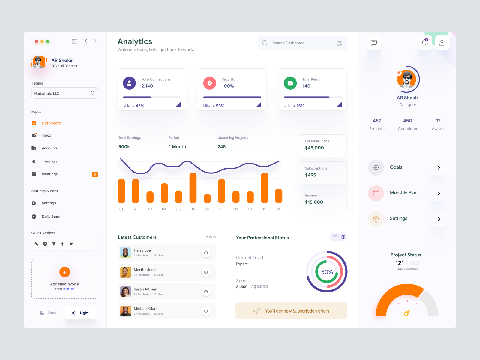 This modern UI dashboard design is expertly crafted for digital professionals who demand clarity and functionality in their workflow. With a clean aesthetic, it combines user-centric elements with vibrant color schemes to optimize user interaction and experience. The main dashboard offers a comprehensive analytics view, featuring metrics such as total connections, security status, and total items. The intuitive layout allows for easy navigation through the menu's sections, which include inbox, accounts, and meetings among others. The dashboard also integrates a graphical analysis of earnings, project status, and professional status, enabling users to effortlessly track and manage their business performance. Designed for seamless user engagement, this Figma file is easily integrable, providing a copy-and-paste feature directly in Figma without any download necessary. Ideal for designers looking to elevate their project dashboards with a sophisticated touch.