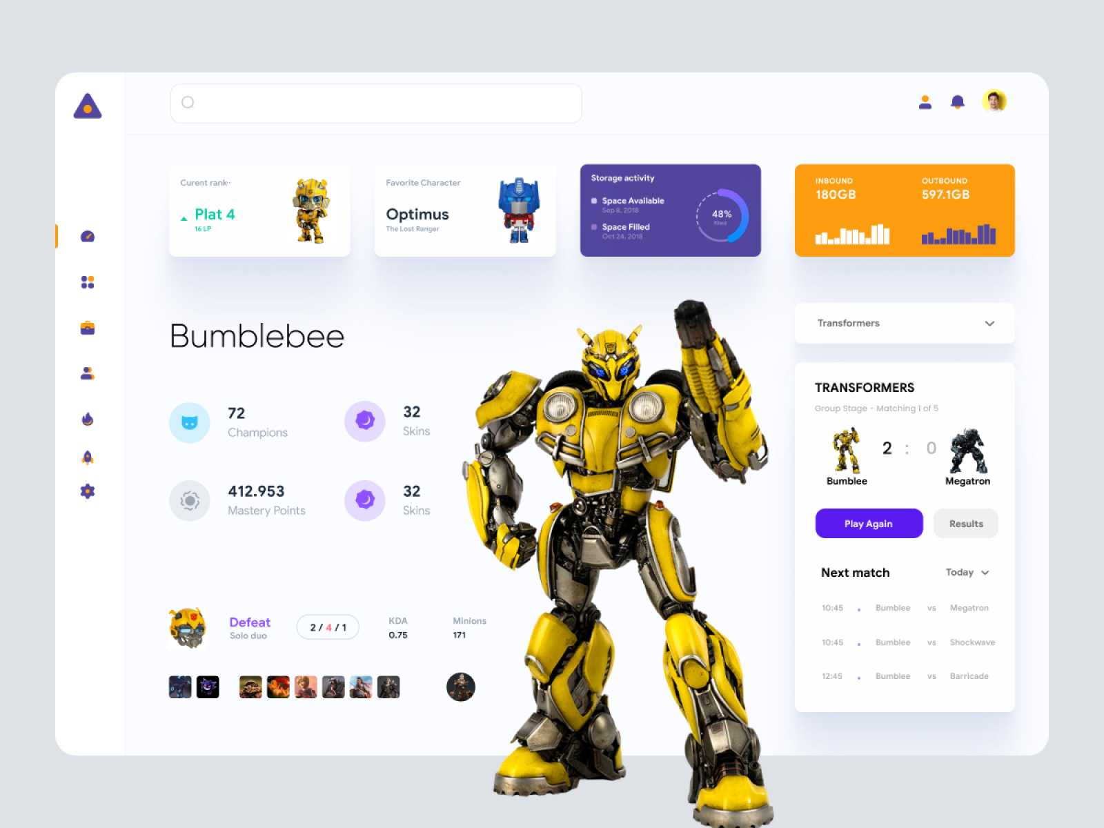 Dive into a visually captivating and intuitive UI design tailored for gaming enthusiasts and developers. This design showcases a transformative interface focused on gamification, featuring a sleek dashboard that's both aesthetically pleasing and highly functional. The left navigation panel includes easily recognizable icons for swift access to various sections. The dynamic header displays user rank and favorite character, fostering a personalized experience. User stats are vividly highlighted, with clear indicators for champions, skins, and mastery points. Integrated charts provide visual representation of storage activity, encouraging interactive engagement. The transformative theme extends to a particular focus on character face-offs, complete with a section for ongoing matches and upcoming tournaments. Each component is meticulously designed for seamless interaction and ease of use. The file comes as a Figma file, allowing users to copy-paste directly into their projects, providing immediate design integration and customization.