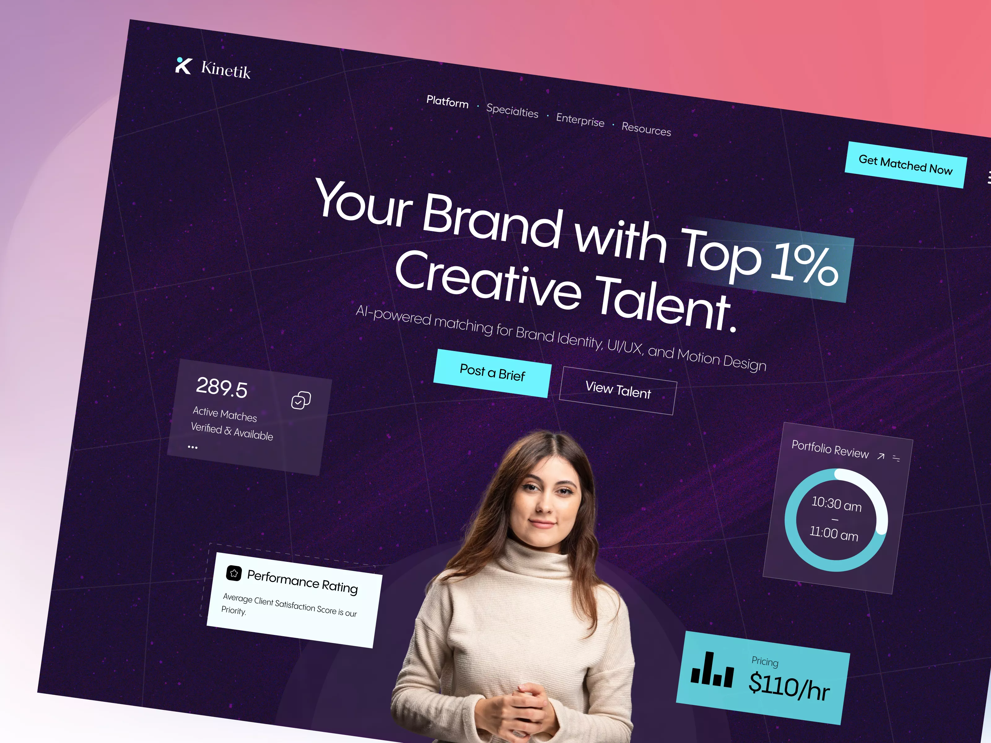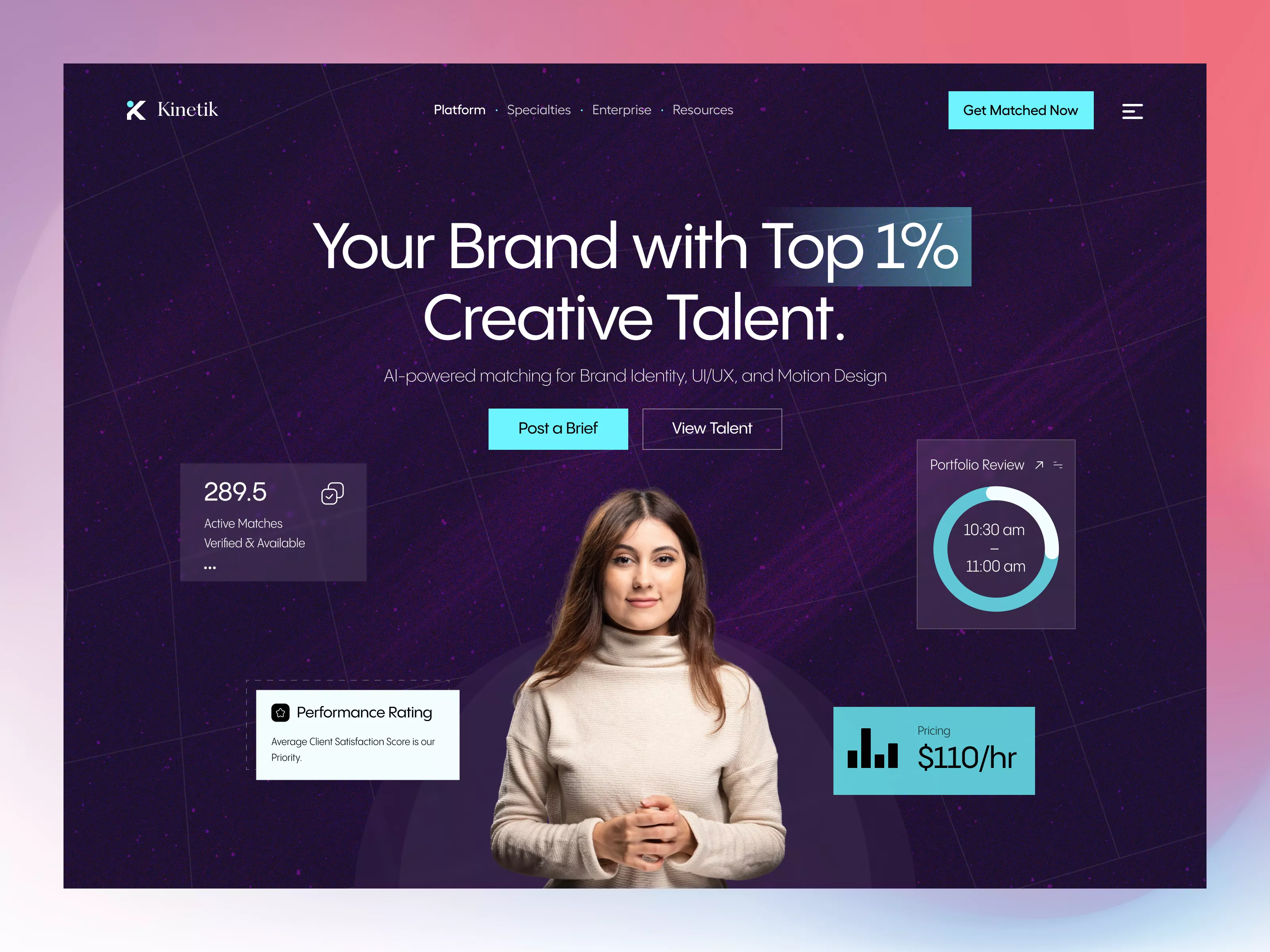 Discover the ultimate gateway to top-tier creative talent with our cutting-edge UI design, perfectly crafted for websites dedicated to selling UI components. This Figma file offers an exceptionally sleek and modern interface, tailored to engage designers and creative professionals. The background is enriched with a deep purple cosmic theme, seamlessly blending with a gradient pink and blue hue that adds an air of sophistication and creativity. The central focus of the design is a bold, captivating headline that proudly declares 'Your Brand with Top 1% Creative Talent,' immediately setting the tone for the quality and exclusivity of the service. Key features include a user-friendly navigation menu with clearly defined categories, ensuring a smooth browsing experience. The call-to-action buttons, 'Post a Brief' and 'View Talent,' are strategically placed to guide your visitors effortlessly. Additional elements like a performance rating indicator, pricing details, and a portfolio review widget add layers of interaction, providing users with comprehensive insights into available options. This design is a perfect choice for any platform seeking to enhance user engagement and showcase unique talent offerings. With its seamless Figma integration, your team can easily copy and paste components into their workspace, streamlining workflow and maximizing efficiency.