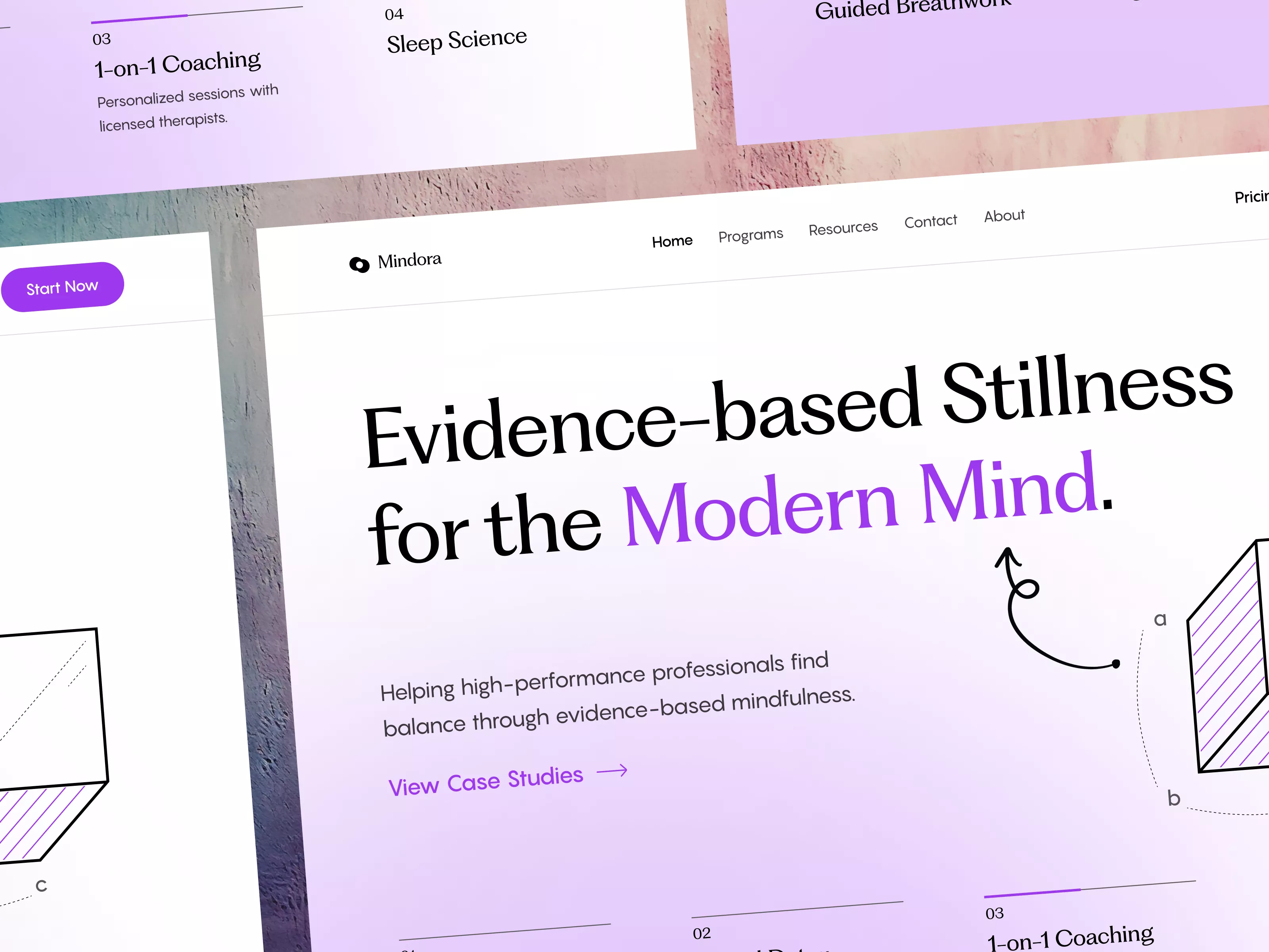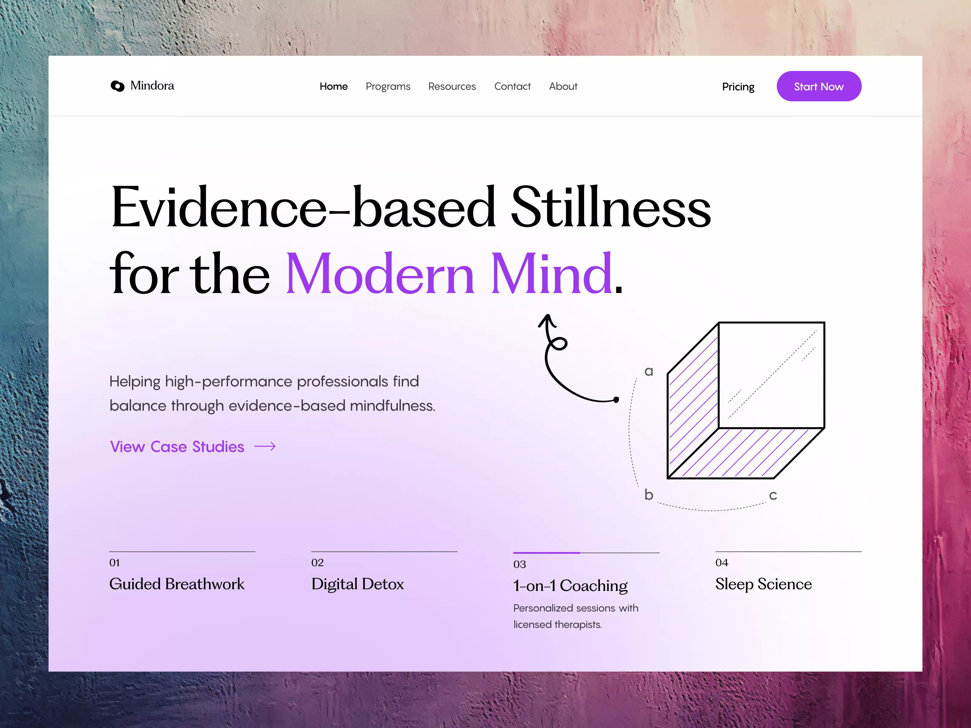 Introducing a sophisticated and contemporary UI design that seamlessly marries form and function, perfect for a website focused on mindfulness, wellness, or any cutting-edge lifestyle brand. This design encapsulates a clean aesthetic with a minimalist approach, utilizing ample white space to enhance readability and focus. The typography is modern, with a balanced mix of bold and regular weights, emphasizing the key message: 'Evidence-based Stillness for the Modern Mind.' The design is further enriched with a subtle gradient background, blending soothing pastel tones, which evoke a sense of calm and serenity. The inclusion of illustrative elements, like the geometric shape, adds a unique artistic touch that can resonate with creative professionals. The navigation is streamlined with clear and concise labeling, ensuring a user-friendly experience. This Figma-ready file allows for immediate copy-paste functionality, making it an effortless addition to any designer's toolkit. Ideal for those who wish to capture the essence of modern mindfulness, this UI design offers a perfect balance of elegance and functionality, setting the stage for an impactful online presence.