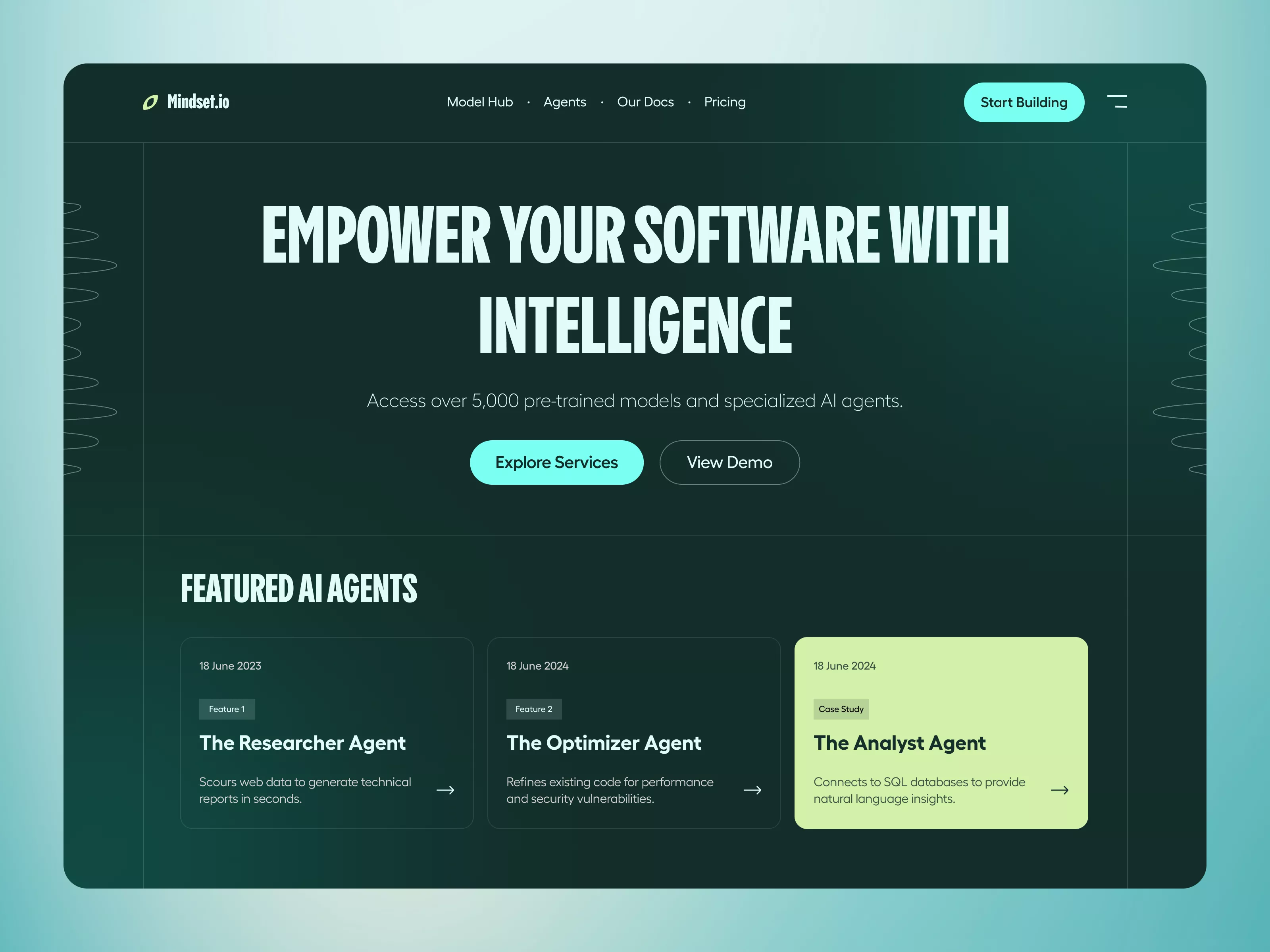 Introducing a sleek and modern UI design crafted to elevate your digital presence, perfect for companies specializing in AI and technology services. This design features a bold, high-impact headline 'Empower Your Software with Intelligence,' seamlessly drawing the viewer's attention. Below, a call to action invites users to explore services or view a demo, prioritizing user engagement. The palette consists of calming teal and green hues, creating a trustworthy and professional aesthetic. The navigation bar is minimal yet effective, featuring crucial sections like Model Hub, Agents, Our Docs, and Pricing, ensuring intuitive user flow. The 'Featured AI Agents' section is laid out with cards, providing snapshot descriptions of key services, making it effortlessly accessible for users. Each card features a subtle hover effect, enhancing interactive engagement. Delivered in a Figma format, this design allows for hassle-free customization directly within your existing workflow. Transform your website into a visually compelling platform, making a lasting impression on potential clients and users.