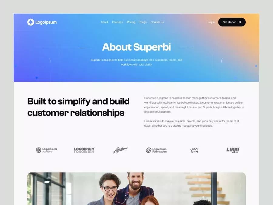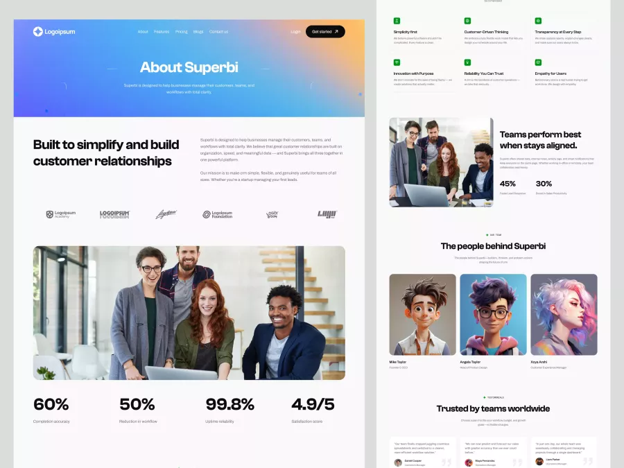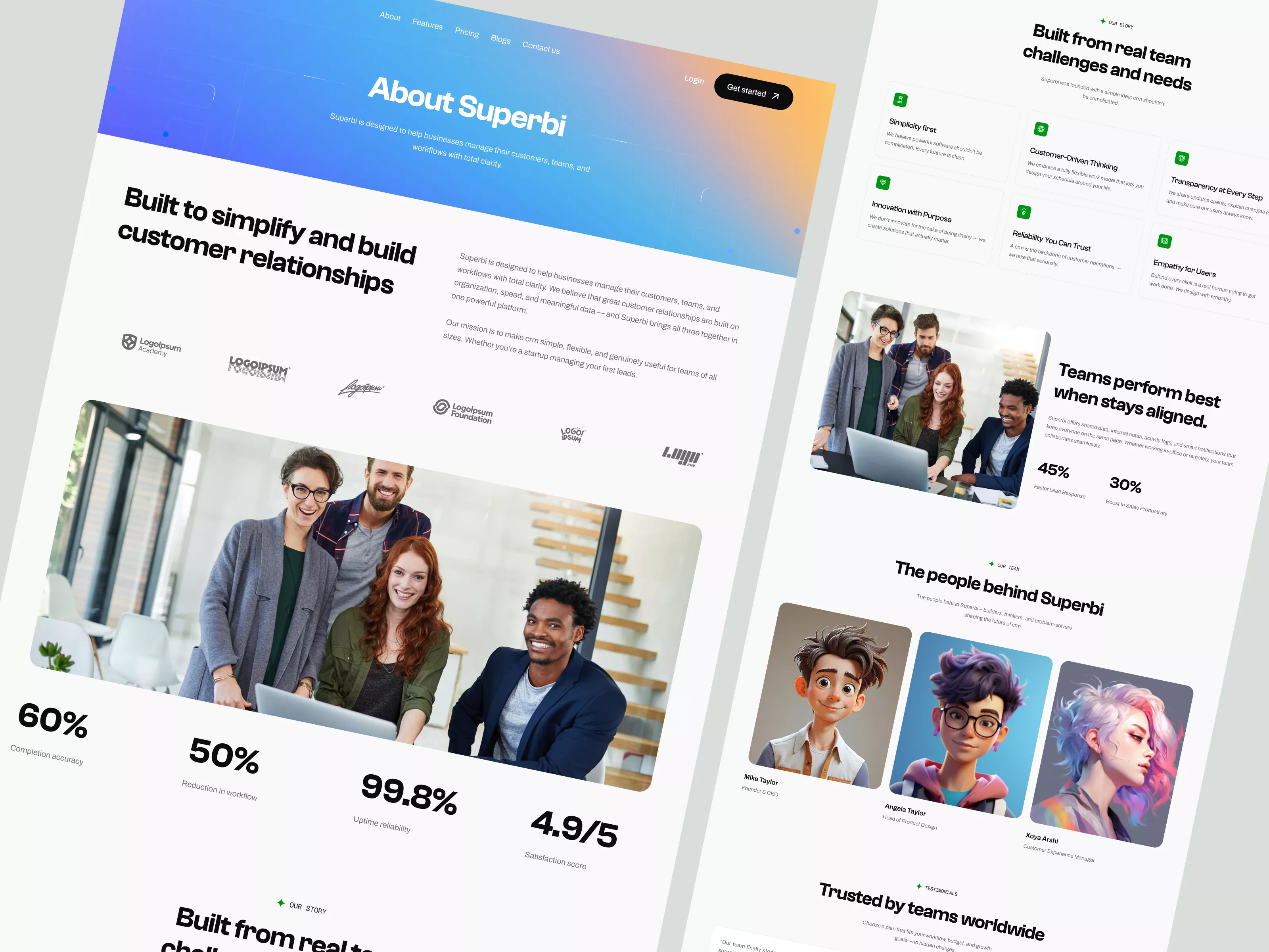 Introducing Superbi, a modern UI design crafted to enhance your customer relationship management with its sleek and intuitive layout. This design focuses on clarity and simplicity, allowing businesses to manage their customers, teams, and workflows seamlessly. The vibrant header sets a professional tone, featuring navigation options such as About, Features, Pricing, Blogs, and Contact. A prominent call-to-action invites users to learn more and get started effortlessly. Below, engaging visuals and informative stats highlight the product's benefits, while testimonials from team members and satisfied clients build trust and reliability. Designed for clarity and ease, this template includes sections for key metrics such as completion accuracy and uptime reliability, and showcases team members to humanize your brand. With its easily customizable format in Figma, Superbi is perfect for showcasing your company's strengths and aligning teams for optimal productivity.