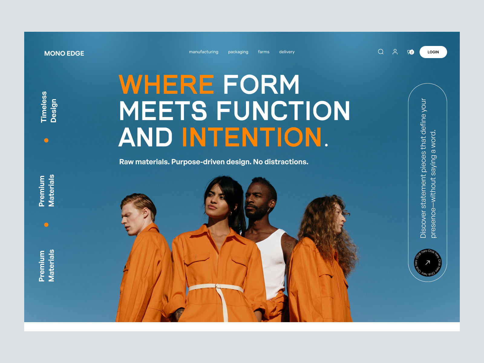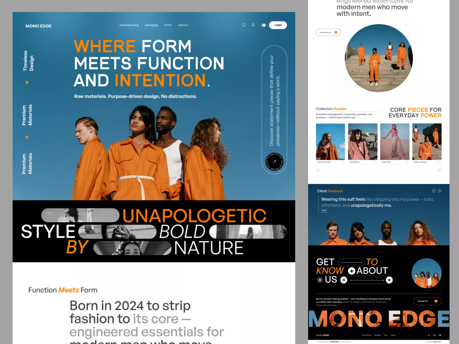 This UI design showcases a contemporary and sleek website layout tailored for a brand named Mono Edge, which sells fashion-forward apparel with a focus on minimalism and functionality. The hero section prominently features bold text overlays and high-quality images that convey a message of combining aesthetics with purpose-driven design. The color scheme is dominated by a striking combination of blue and orange, which not only captures attention but also reinforces the brand's identity. Strategically placed call-to-action buttons and navigation elements are subtly integrated, ensuring a seamless user journey. The website layout demonstrates a keen attention to detail with sections highlighting product features, customer testimonials, and brand ethos, all designed to resonate with modern consumers seeking style and substance. Overall, the UI design effectively balances aesthetic appeal and user-centric features, making it an ideal fit for brands that prioritize both form and function.