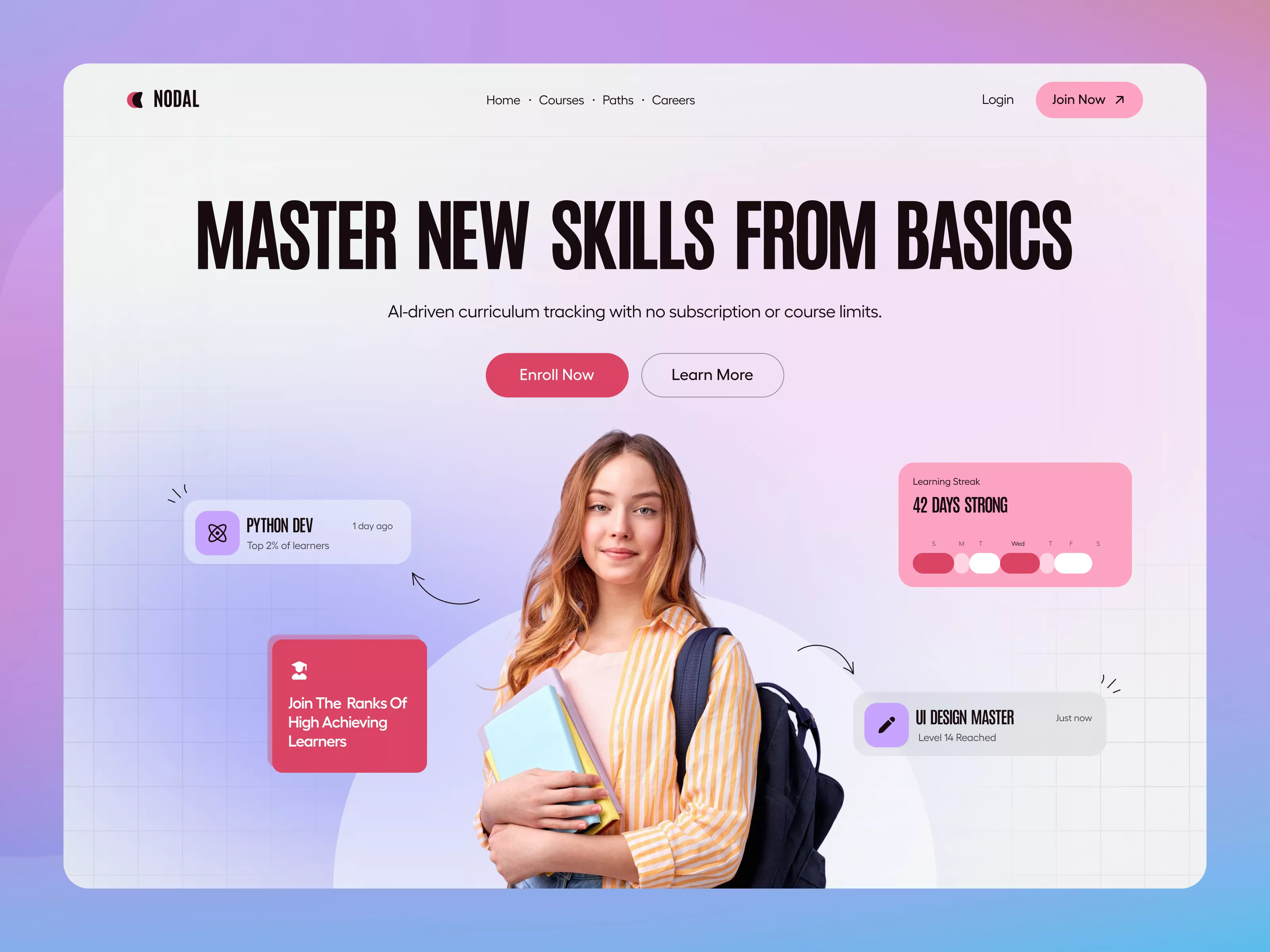 Introducing an exquisite UI design tailored for educational websites, this layout balances modern aesthetics with practical navigation, making it a must-have for designers aiming to redefine e-learning platforms. The homepage captivates with its bold, motivational headline 'Master New Skills from Basics', promoting an AI-driven curriculum tracking system devoid of subscription or course limits. The inviting color palette of pinks and purples not only exudes energy but also encourages engagement and learning. The design showcases a strategic blend of visual elements; a prominent 'Enroll Now' CTA button grabs the eye, encouraging immediate interaction, while a 'Learn More' button is also available for further exploration. Integrated components like learning streak trackers and skill notifications foster a sense of achievement, accompanied by a centralized image that personalizes the learning experience. This design is embedded within a Figma file format, enabling seamless integration into other projects and direct usability without the need for downloads. Ideal for platforms offering courses in various domains, this UI design enhances user experience by streamlining access to content, paving the way for seamless learning journeys. Elevate your educational website's appeal with this contemporary, easily customizable design.