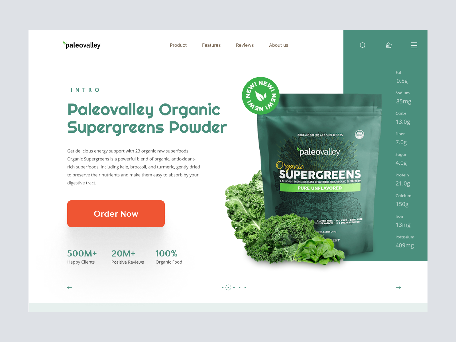 hero, header, stats, clients and mentions, why us, about us, our mission, product info, product details, featured products, testimonials, call to action, footer|