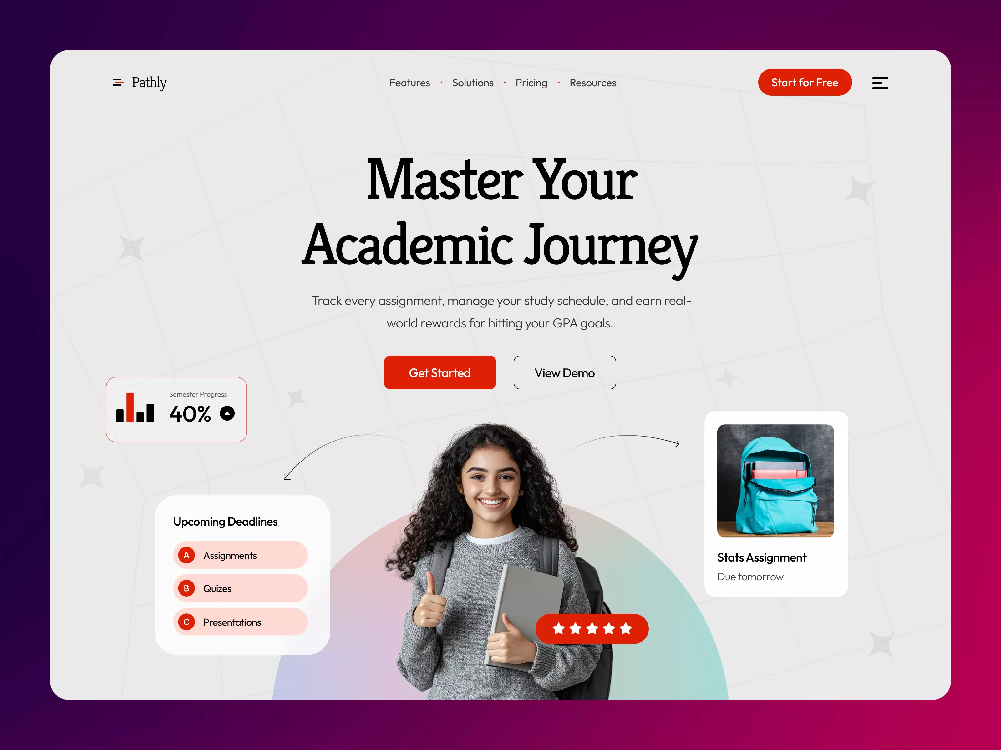 Introducing a sleek, modern UI design crafted for the academic sector, tailored to enhance the user experience for students, educators, and academic organizations. This design embodies a perfect balance between functionality and aesthetics, presenting a visually appealing layout that guides the user effortlessly through the application. The landing page is characterized by a dominant header 'Master Your Academic Journey' that quickly communicates the core purpose of the platform. Below, users can see their semester progress as a percentage, clearly displayed with an engaging chart, fostering quick comprehension. The design also features intuitive icons and sections emphasizing 'Upcoming Deadlines' for Assignments, Quizzes, and Presentations, which are all crucial elements for academic success. Furthermore, a motivational section highlights featured tasks, encouraging students to stay organized. The inviting 'Get Started' and 'View Demo' buttons are strategically positioned to grab attention and encourage interaction. Developed for Figma, this template enables seamless integration, allowing users to effortlessly edit and customize without downloading. Elevate your academic platform with a design that speaks to efficiency, elegance, and user-centricity, capturing the essence of modern education technology.