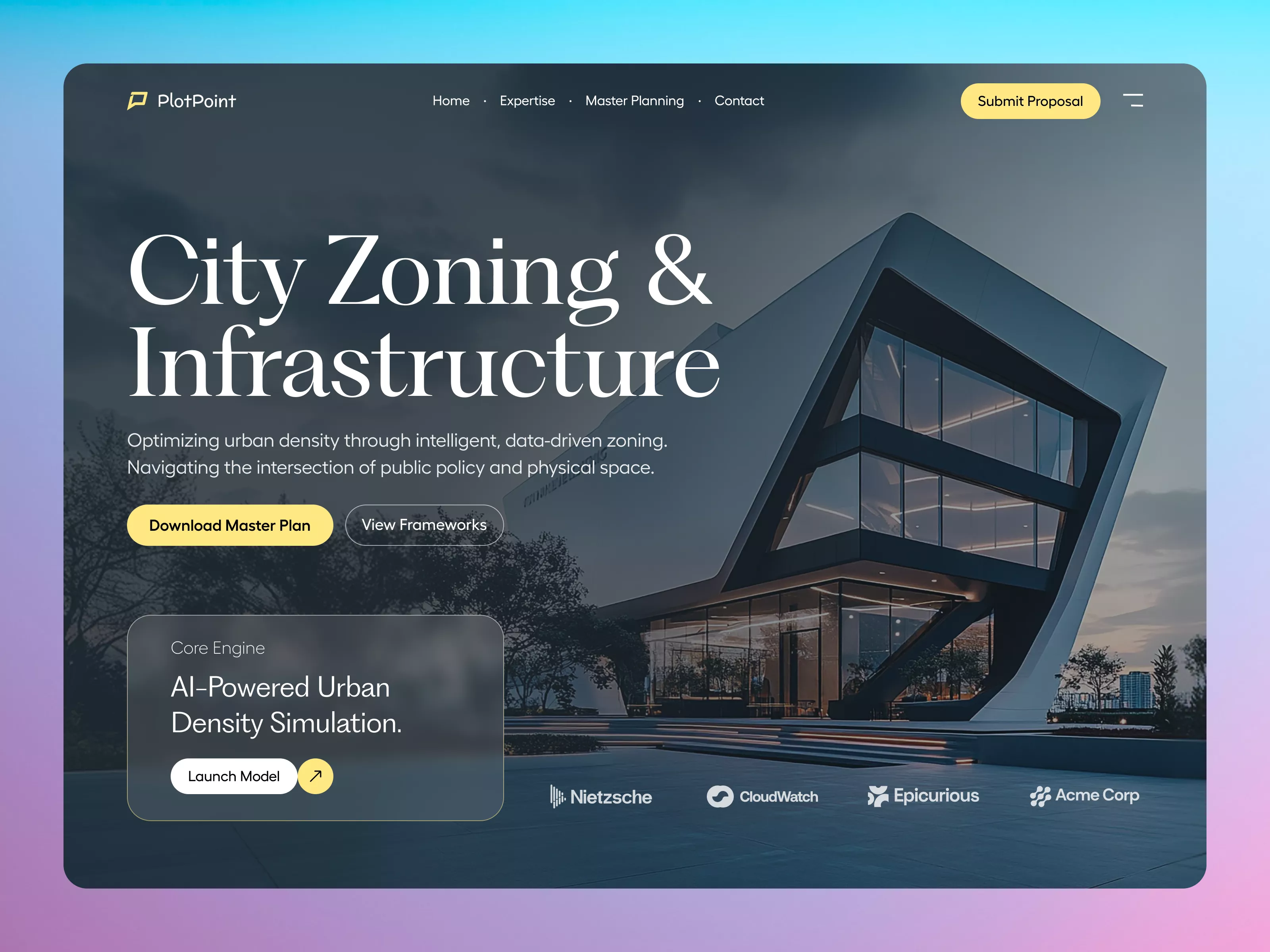 Introducing an innovative UI design meticulously crafted for urban development and infrastructure projects. This sleek and modern design encapsulates a professional feel, perfectly blending aesthetic appeal with functionality. The design prominently features a captivating image of a futuristic building, set against a twilight backdrop, symbolizing the cutting-edge solutions you offer in the field of city zoning and infrastructure. The typography is bold yet elegant, ensuring that key information stands out to capture the user's attention immediately. With intuitive navigation and strategically placed call-to-action buttons, such as 'Download Master Plan' and 'Submit Proposal', this UI design is built to drive engagement and conversions. The layout is further enhanced by a sophisticated color palette, comprising calming blues and grays accented with lively yellows, creating a balanced visual experience that is both dynamic and easy on the eyes. Logos of reputed partners and clients at the bottom build credibility, while the clean, structured layout ensures that content is delivered effectively, catering to professionals in architecture, urban planning, and related industries.