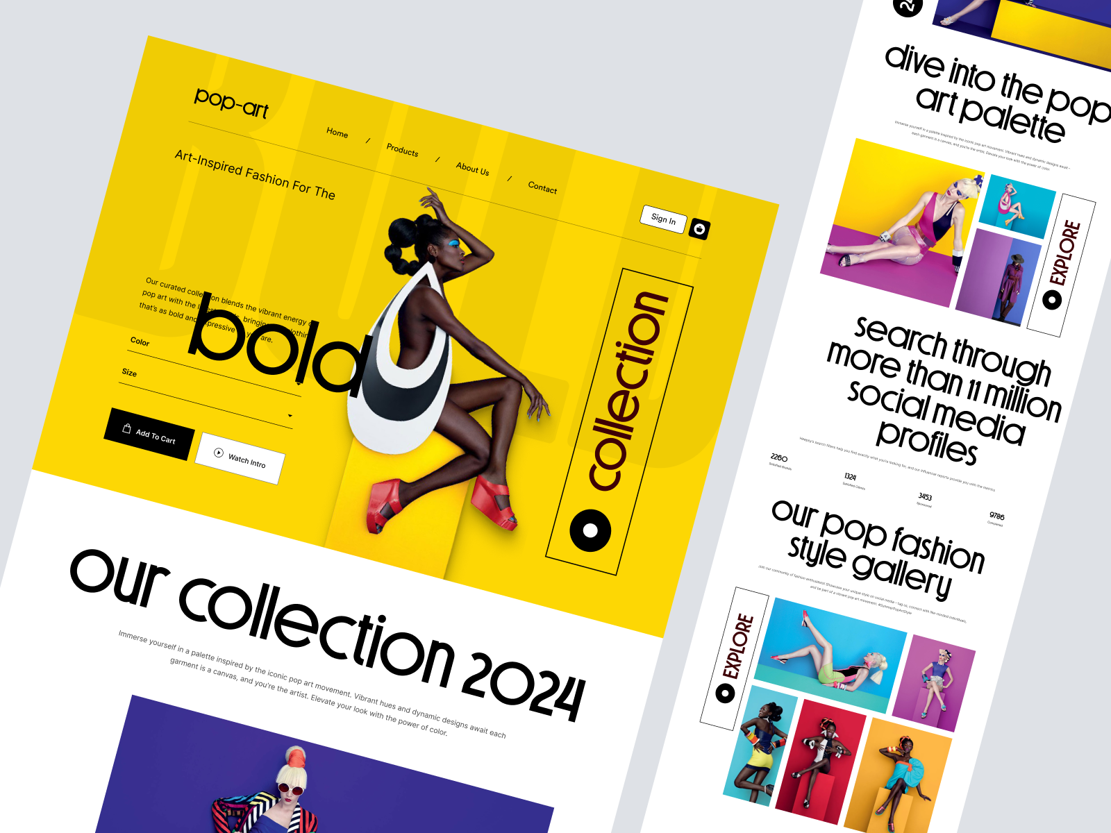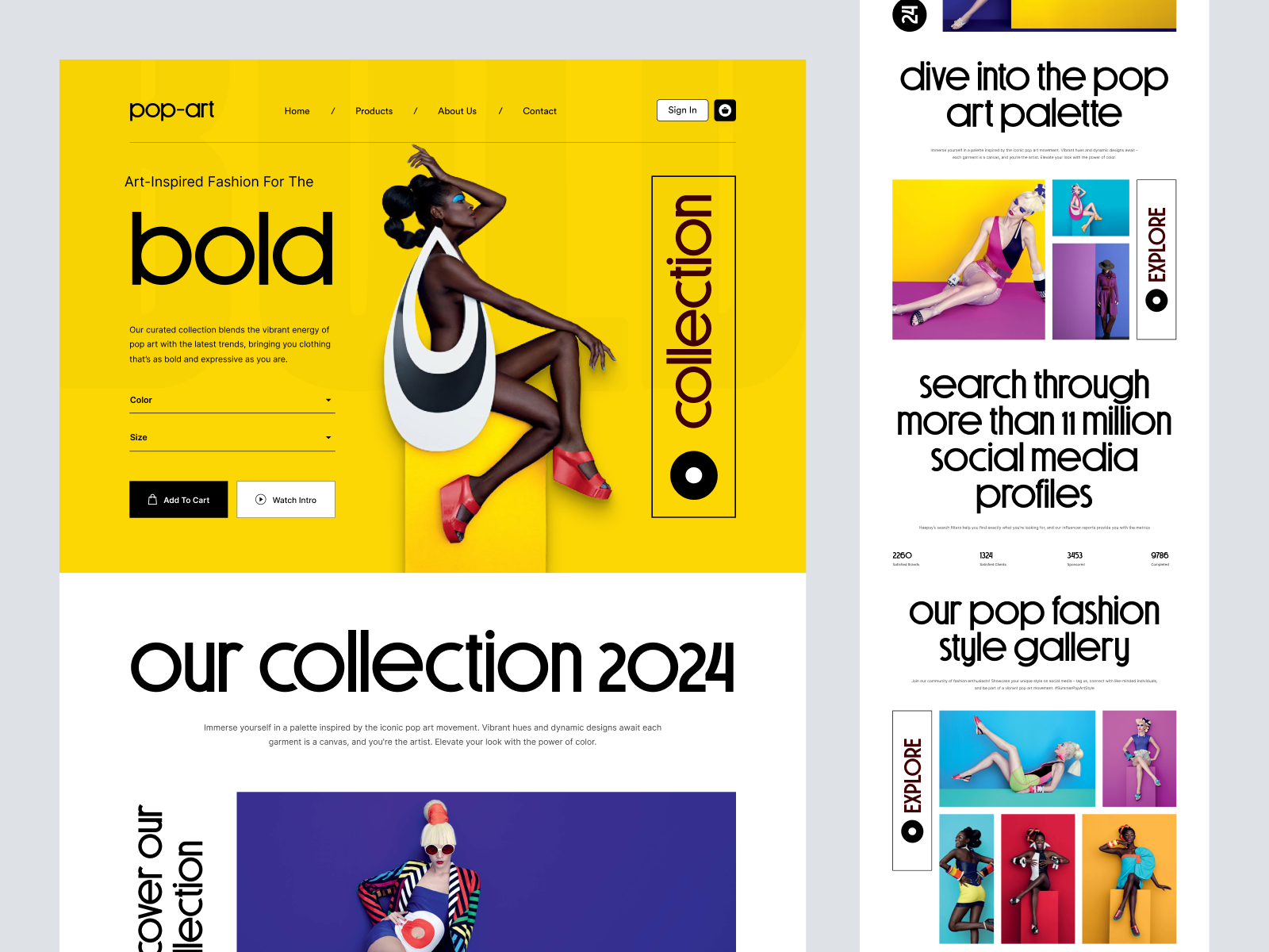 A dynamic, pop-art inspired UI design in Figma, featuring vibrant visuals, intuitive navigation, and seamless customization. Perfect for fashion-forward, modern web projects.
