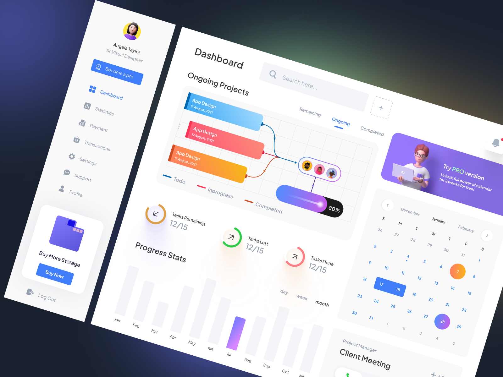 This dynamic and modern UI design is the perfect solution for designers looking to enhance their web projects with a contemporary touch. The dashboard provides an intuitive user interface with a clean layout that efficiently organizes information for real-time project management. Featuring a sleek sidebar navigation, users can easily access different modules such as Dashboard, Statistics, Payment, Transactions, and more. The main display highlights ongoing projects with visually engaging charts and progress trackers, while a calendar and task overview ensure seamless scheduling and task management. Designed with aesthetics and functionality in harmony, this UI offers customization flexibility, allowing you to tailor the components to suit your brand’s specific needs. Accessible as a Figma file, you can copy and paste the components directly, streamlining your workflow and enhancing productivity without the hassle of downloading files.