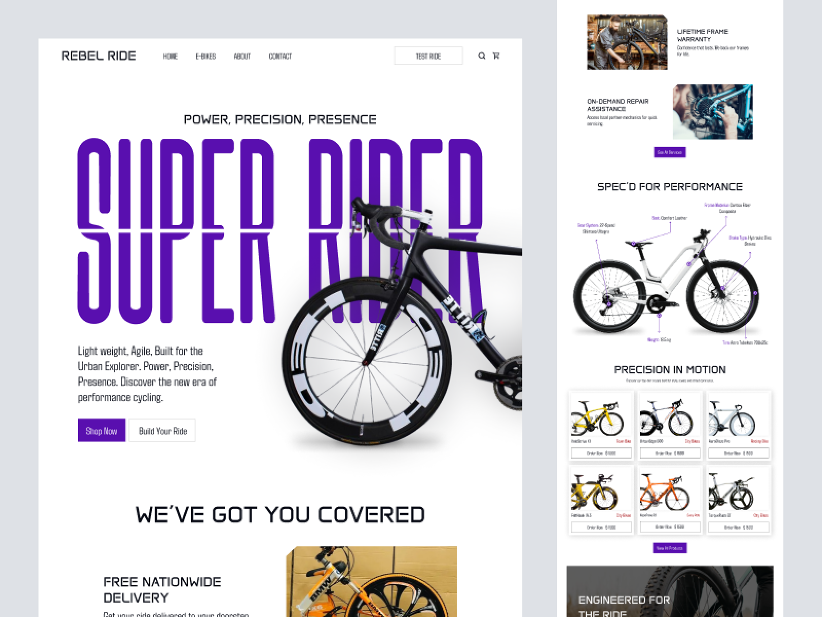This cutting-edge UI design is crafted for your website to showcase and sell high-performance bicycles with flair. Striking in its modern aesthetic, the design integrates bold typography and a minimalist layout to effectively highlight product features and benefits. Designed in Figma, it allows users to copy and paste directly into their projects, streamlining the process and saving valuable time. The layout presents seamless navigation with key sections such as performance specifications and service options, enhancing the user experience. The integration of sharp imagery and engaging calls-to-action encourage visitors to explore more, effectively converting interest into sales. With a clean, professional look and intuitive interface, this UI design is perfect for engaging modern consumers who appreciate both style and functionality.