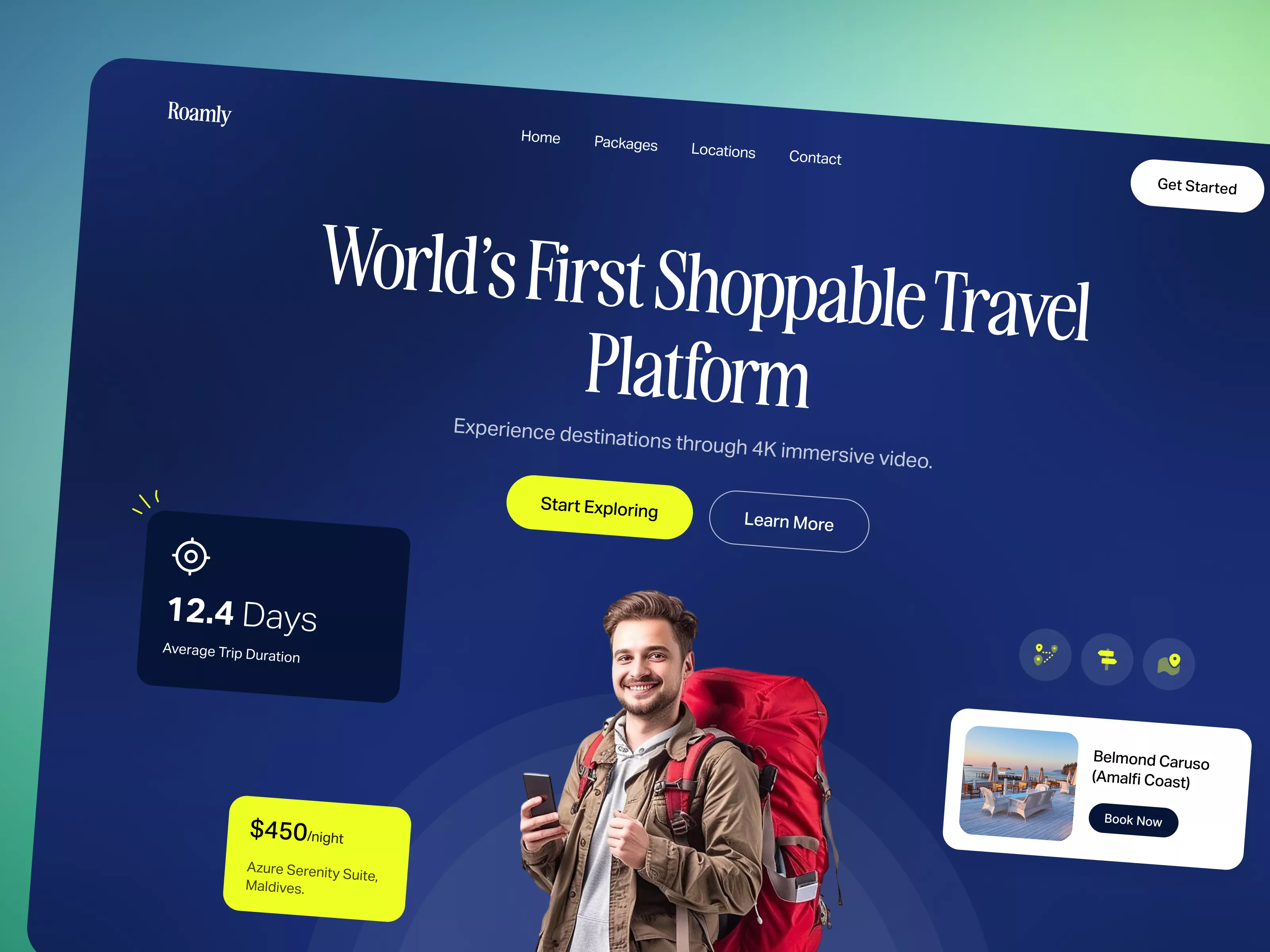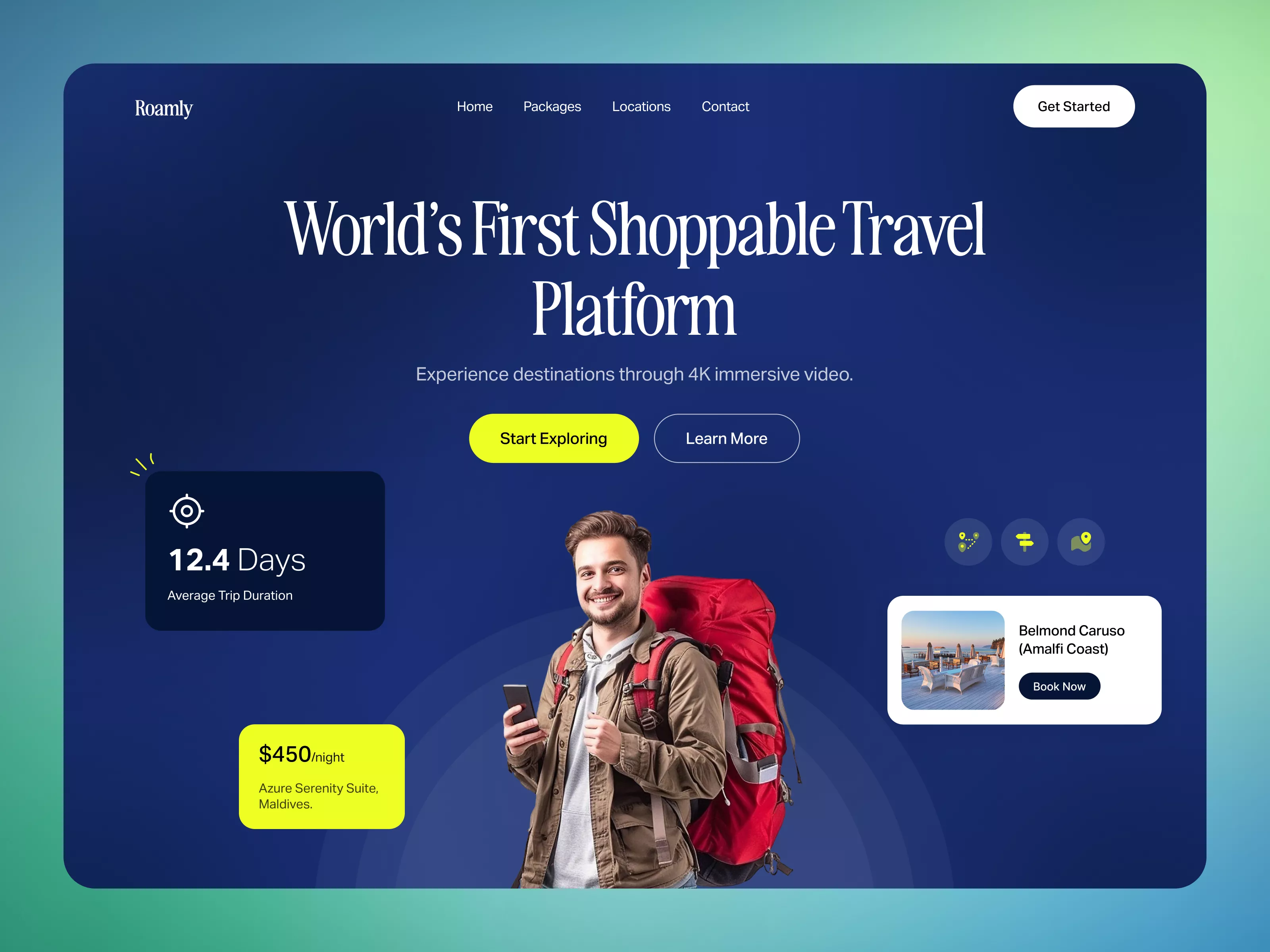 Unleash the true potential of your travel website with our dynamic UI design template, crafted to captivate and engage users from the very first glance. This layout embodies a seamless and intuitive user experience, specifically designed for platforms aiming to provide immersive travel experiences. Featuring a bold header proclaiming it as the 'World's First Shoppable Travel Platform', the design immediately draws the visitor's attention. Below, streamlined navigation options such as Home, Packages, Locations, and Contact ensure ease of access to key information. The enticing call-to-action buttons 'Start Exploring' and 'Learn More' are ergonomically placed to enhance user interaction. The UI also boasts of an interactive trip duration widget, vividly displaying an average trip length of 12.4 days, paired with an attractive price highlight at $450/night for the Azure Serenity Suite in Maldives, emphasizing luxury and affordability. Additionally, a spotlight on the Belmond Caruso showcases enticing visuals that are bound to inspire wanderlust, accompanied by a convenient 'Book Now' button. The design harmonizes vibrant colors like yellow and blue to evoke feelings of excitement and trust, ensuring potential travelers embark on their next adventure with confidence. Delivered as a Figma file, this design offers the convenience of being easily integrated into your current projects. Simply copy and paste directly into Figma without the need for any downloads, making this not just a stunning addition to your digital offerings, but a truly functional and adaptable solution.