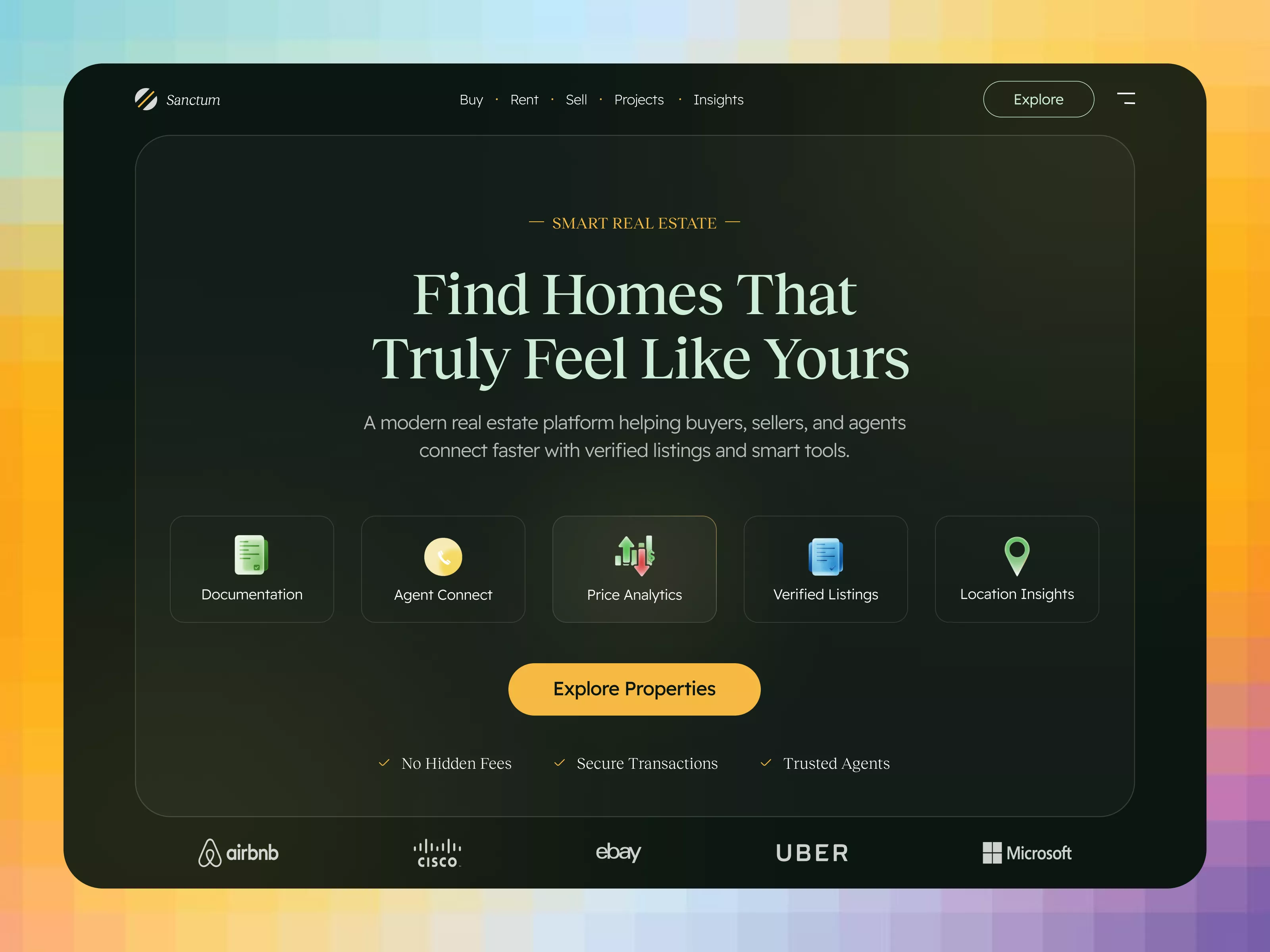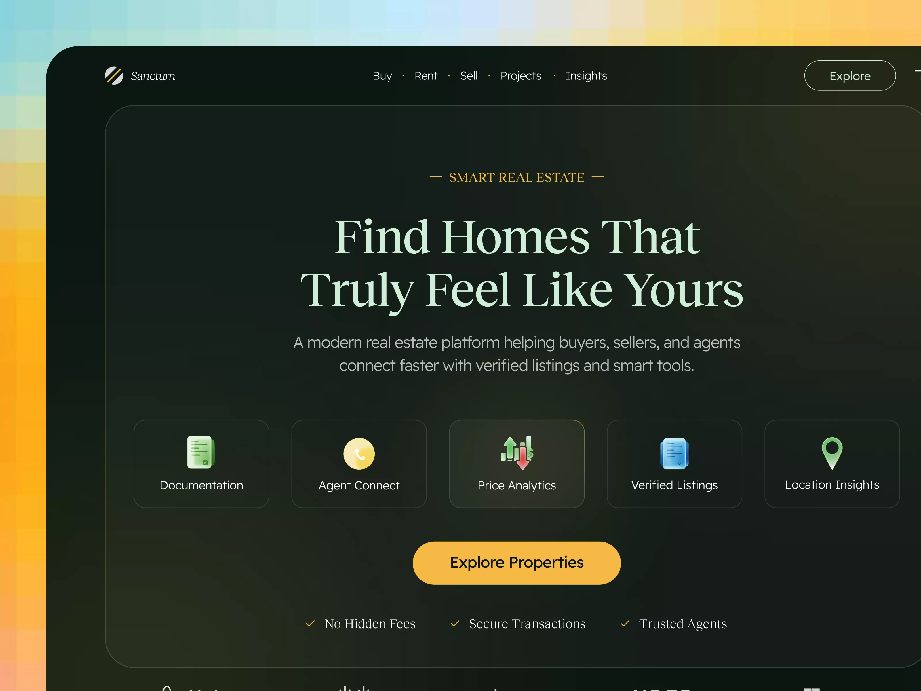 Introducing our cutting-edge UI design tailored for smart real estate platforms that seamlessly integrates contemporary aesthetics with functionality. This design boasts a sleek and modern interface designed to captivate potential buyers, sellers, and agents. The centerpiece of this design is the bold, captivating tagline 'Find Homes That Truly Feel Like Yours,' which complements the sophisticated layout, ensuring users feel engaged and motivated. Each element is meticulously crafted, from the intuitive navigation bar that guides users effortlessly, to the sleek icons representing essential functions like documentation, agent connection, price analytics, verified listings, and location insights. The background utilizes a calming gradient, enhancing readability while providing a visually appealing framework that highlights the core features. The button 'Explore Properties' stands out with its vivid color, inviting users to dive into the platform. Below, value propositions reassure users, emphasizing 'No Hidden Fees,' 'Secure Transactions,' and 'Trusted Agents' to build trust. This Figma file can be effortlessly copied and pasted, offering unparalleled ease of use, making it an indispensable asset for developers and designers aiming to create a dynamic, user-friendly real estate interface.