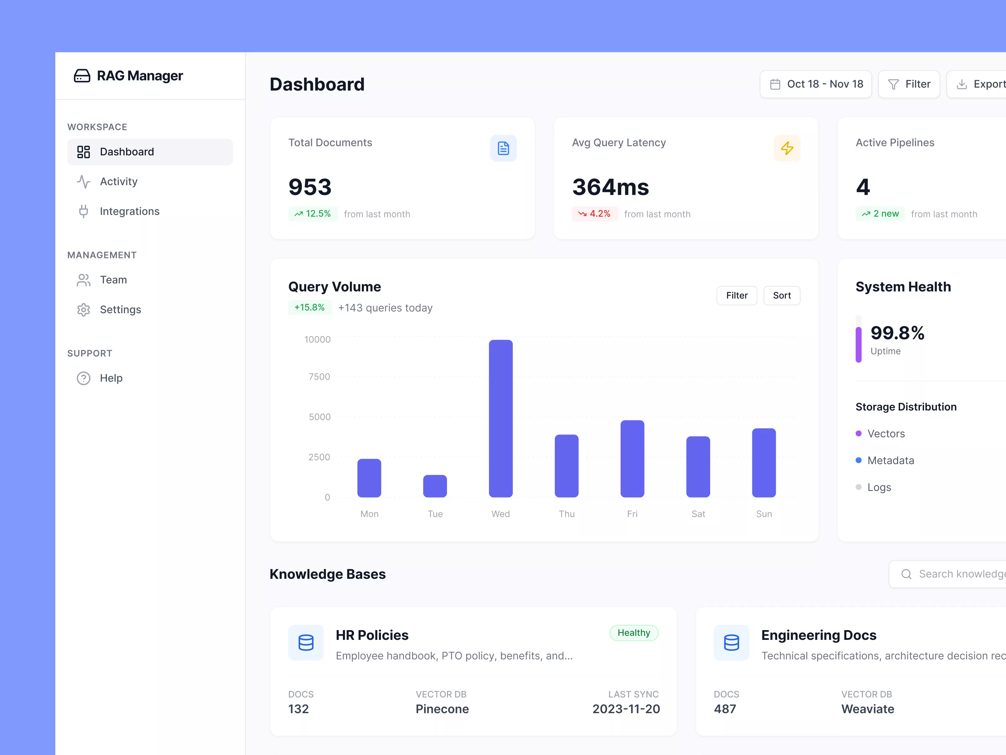 This UI design for a web application dashboard offers a clean and intuitive interface, aimed at providing users with comprehensive insights and easy navigation. The sidebar on the left serves as the primary navigation panel, featuring sections such as Workspace, Management, and Support. The 'Dashboard' tab is currently active, displaying critical metrics in a well-organized grid format in the main section. This includes Total Documents, Average Query Latency, and Active Pipelines, each highlighted with concise statistical data and trend indicators. The central graph dynamically illustrates weekly query volume, enabling users to visually track performance over time. On the right, 'System Health' and 'Storage Distribution' deliver real-time stats on uptime and data usage. Below, a Knowledge Bases section succinctly presents categorized documentation, with indicators for status and last sync dates enhancing the immediacy of information. Overall, this design effectively balances aesthetics and functionality to enhance user experience.