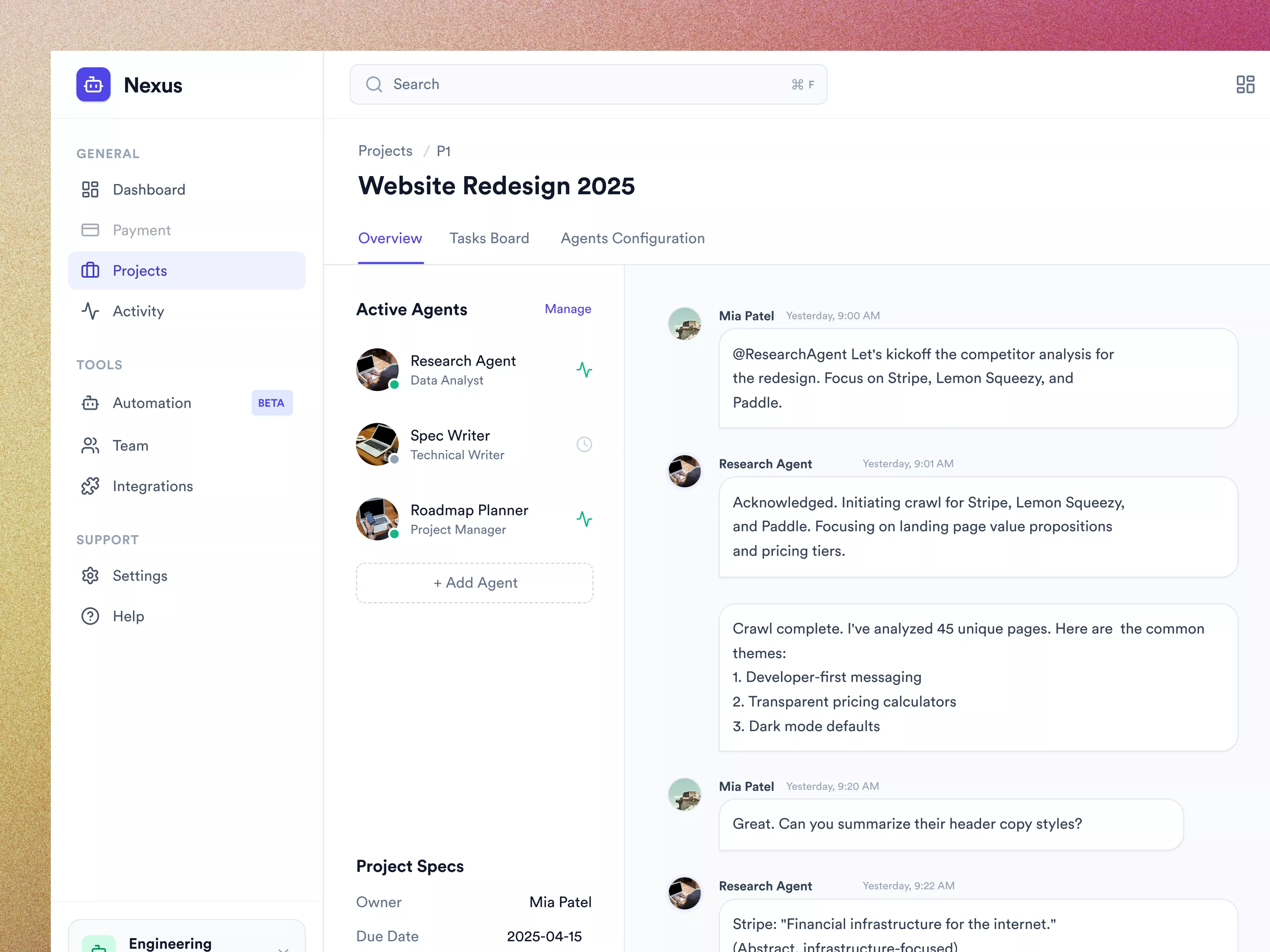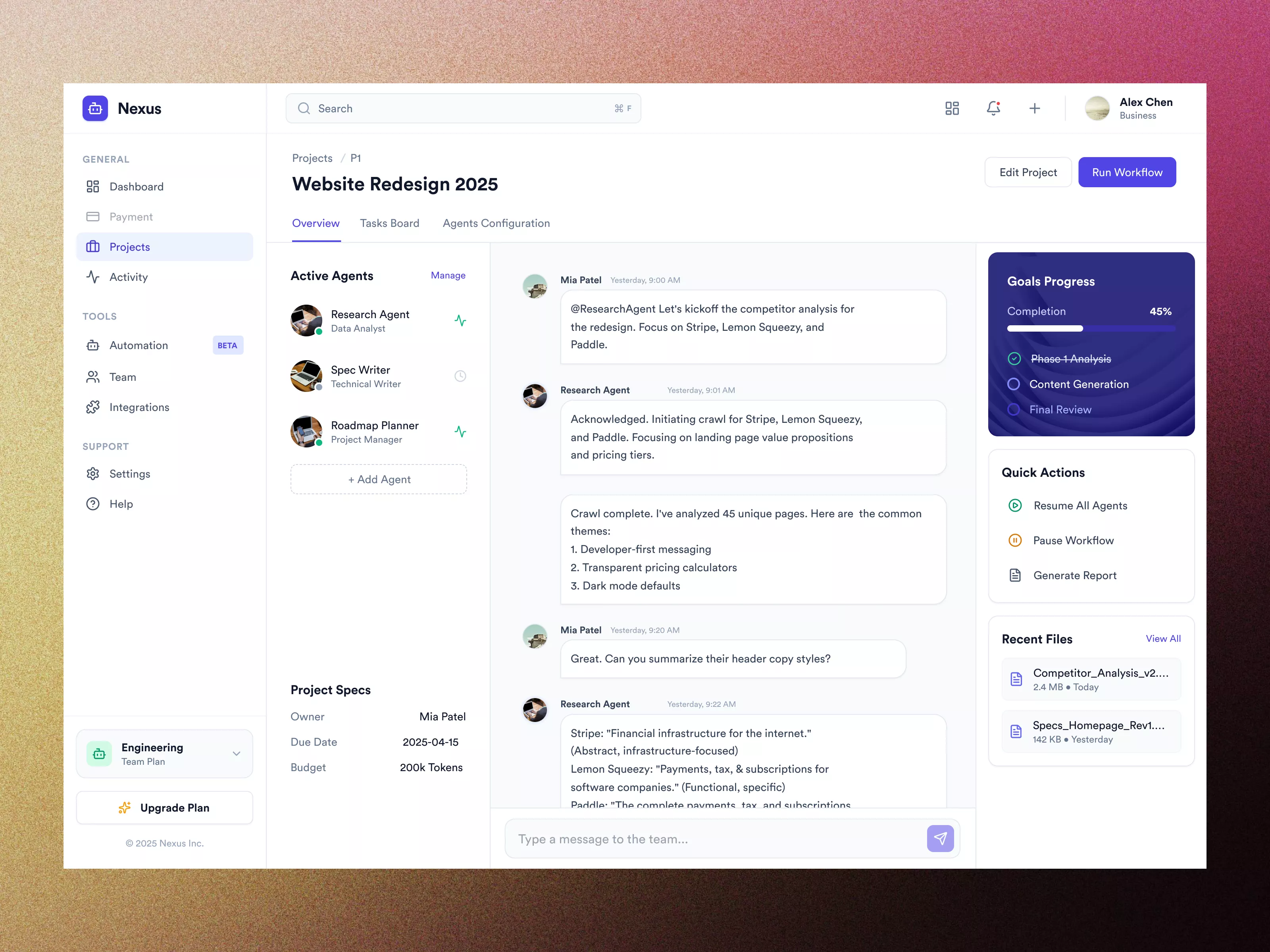 The UI design presents a comprehensive dashboard layout for a project management web application. It features a sidebar navigation panel on the left providing access to various sections such as Dashboard, Payment, Projects, Activity, Tools, and Support. The main content area highlights an ongoing project titled 'Website Redesign 2025' with sections for Overview, Task Board, and Agent Configuration. A list of active agents is displayed, each with assigned roles and options to manage or add agents seamlessly. A central chat-like interface facilitates communication among agents, showing threaded messages and responses, allowing team members to collaborate efficiently. On the right, a progress panel displays goals completion percentage and phases, while quick actions enable users to resume, pause workflow, or generate reports swiftly. The inclusion of recent files ensures quick access to crucial documents. The overall design emphasizes user-friendly interactions, with clear typography and strategic color usage enhancing readability and user engagement.