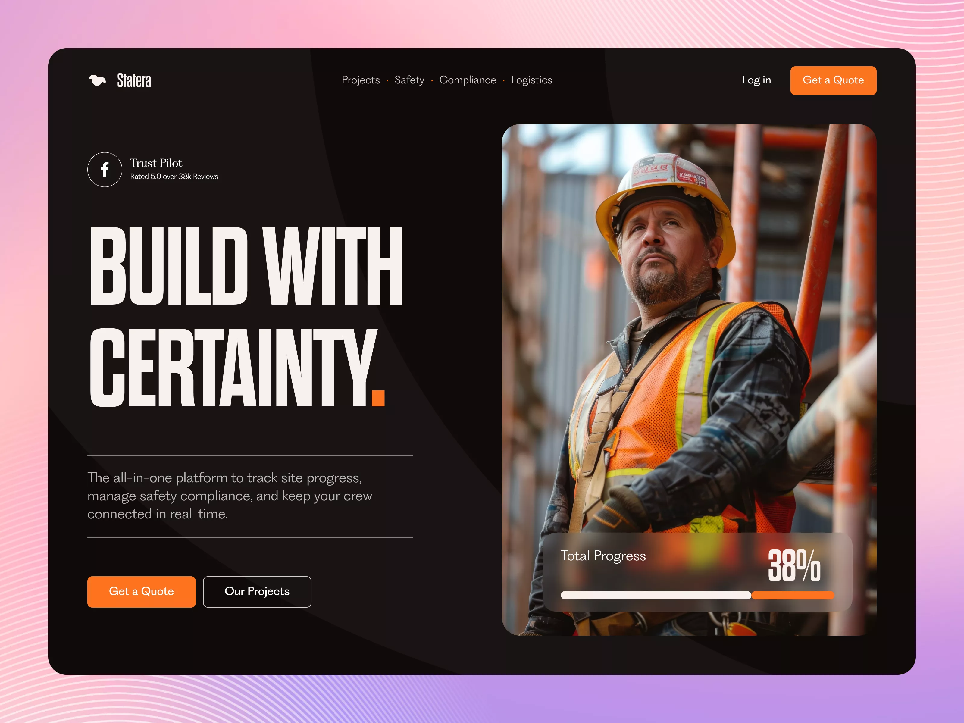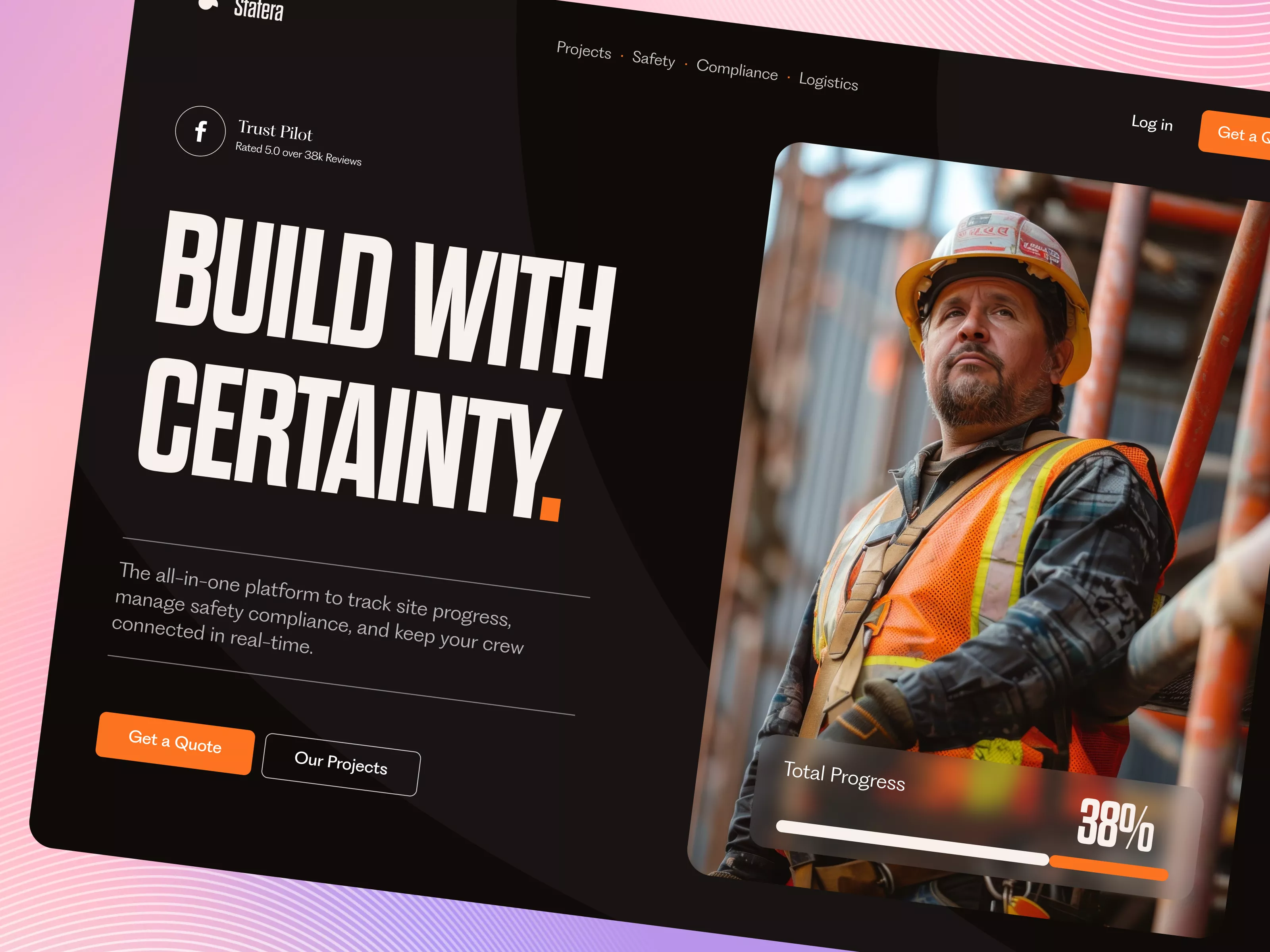 Introducing our cutting-edge UI design tailored specifically for construction and project management platforms. This sophisticated interface is designed to enhance user experience with its sleek and modern aesthetic while maintaining a high degree of functionality. The design features a bold headline 'BUILD WITH CERTAINTY' that captures attention immediately, instilling confidence and assurance in the users. The user-friendly layout ensures seamless navigation through various sections including Projects, Safety, Compliance, and Logistics. The vibrant call-to-action buttons like 'Get a Quote' and 'Our Projects' are strategically placed to drive engagement, encouraging users to explore further. The design incorporates a progress bar visual at the forefront, providing users immediate feedback on project progress, promoting transparency and efficiency. Provided in a Figma file format, this UI can be effortlessly copied and pasted directly into Figma without requiring any download, making it incredibly convenient for designers. Meticulously curated to not only look appealing but also support real-time progress tracking and team connectivity, this UI design is the ultimate solution for any industry professional looking to elevate their digital presence.