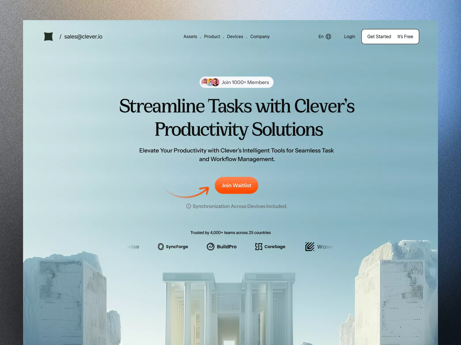 Discover a modern and sophisticated UI design crafted for productivity solutions with our new Figma template. This design blends aesthetic appeal with practical functionality, tailored to capture the attention of designers and users alike. Featuring a serene, pastel-hued background with clean, bold typography, this interface is not only visually appealing but also easy to navigate. The central call-to-action button invites users to 'Join Waitlist,' illustrating a streamlined approach to user engagement. Above this, a dynamic header promises to 'Streamline Tasks with Clever's Productivity Solutions,' immediately conveying the core value proposition. The top navigation bar allows seamless access to 'Assets,' 'Product,' 'Devices,' and 'Company' sections, enhancing the user journey. Furthermore, the template includes intuitive icons and sections for showcasing trusted partners, emphasizing credibility. Users can paste this Figma file directly into their workspace without the hassle of downloading additional files, allowing for immediate integration and customization.