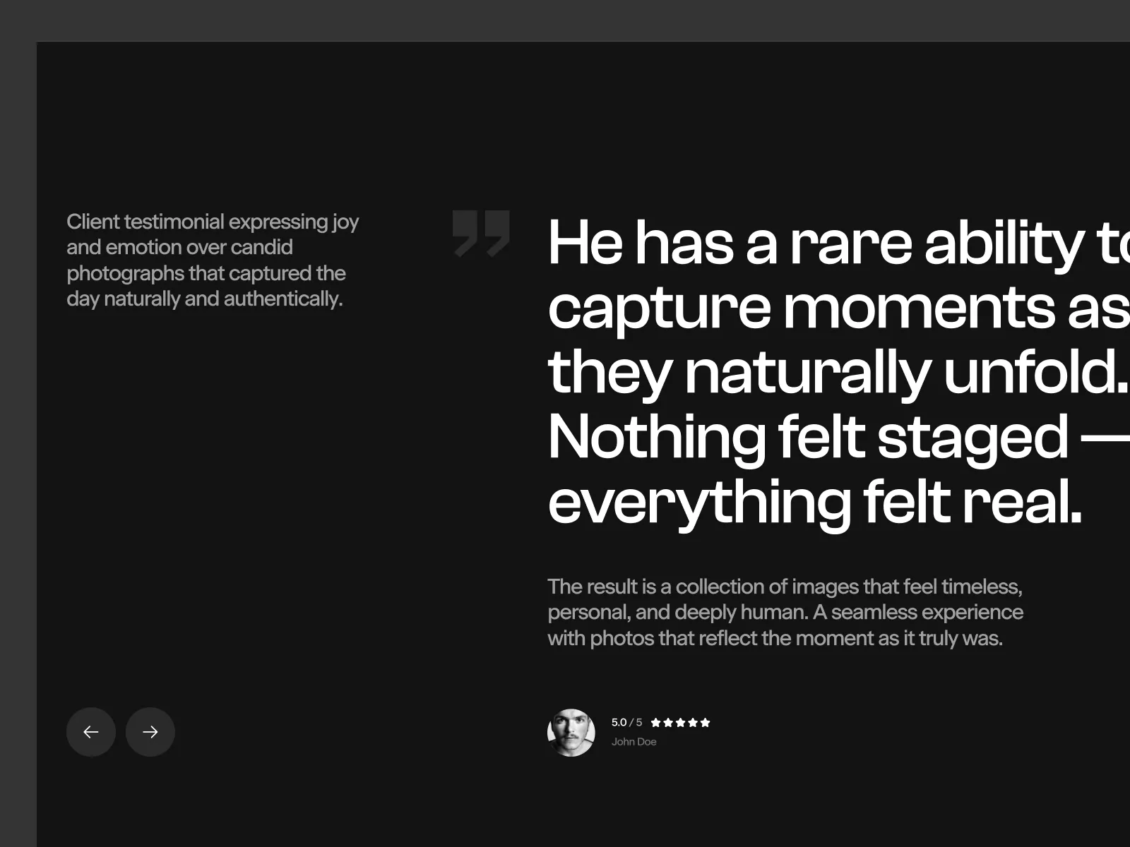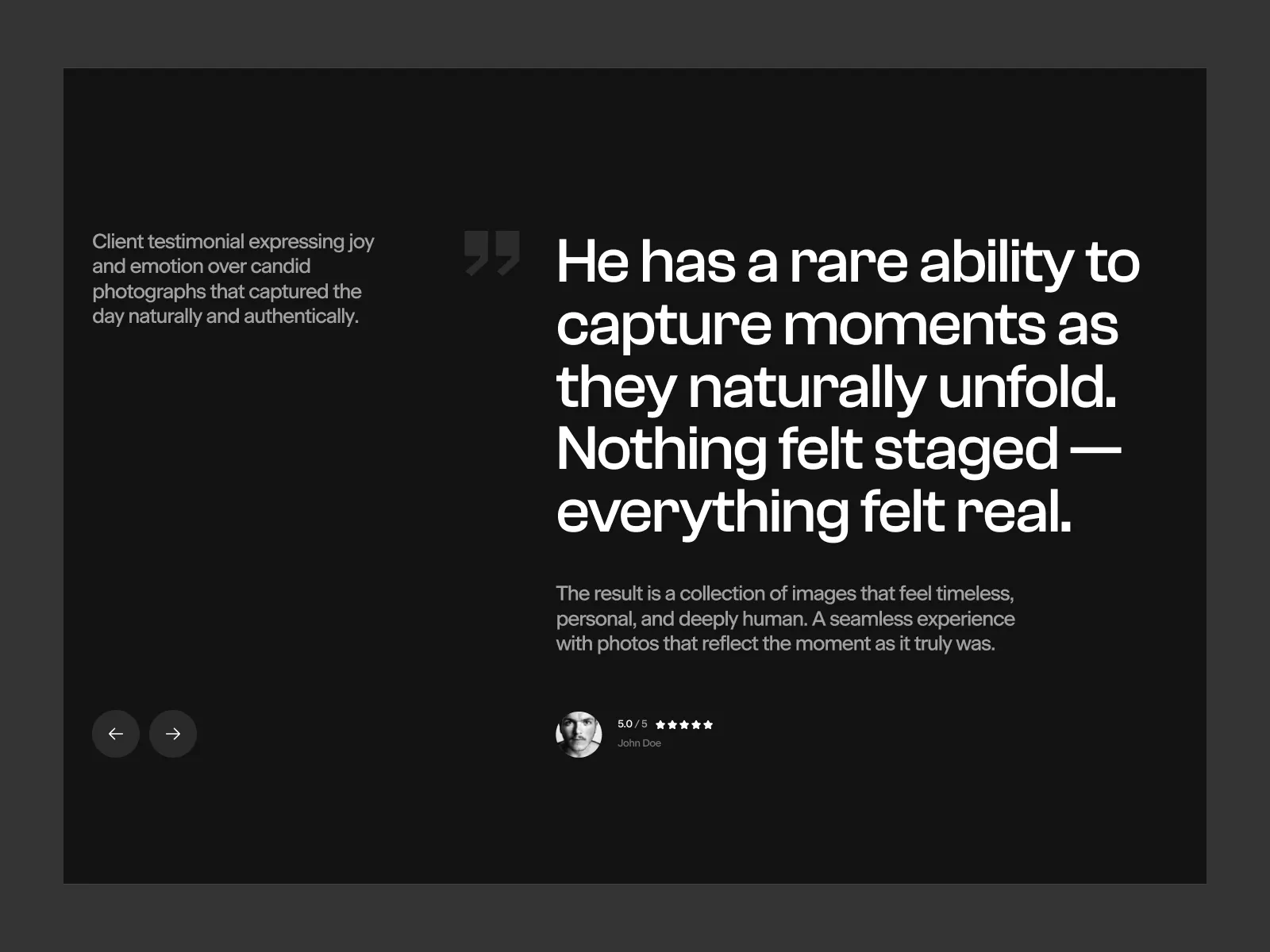 Sleek minimal UI design for authentic client testimonials. Seamless integration with Figma, ideal for photographers or designers showcasing client feedback.