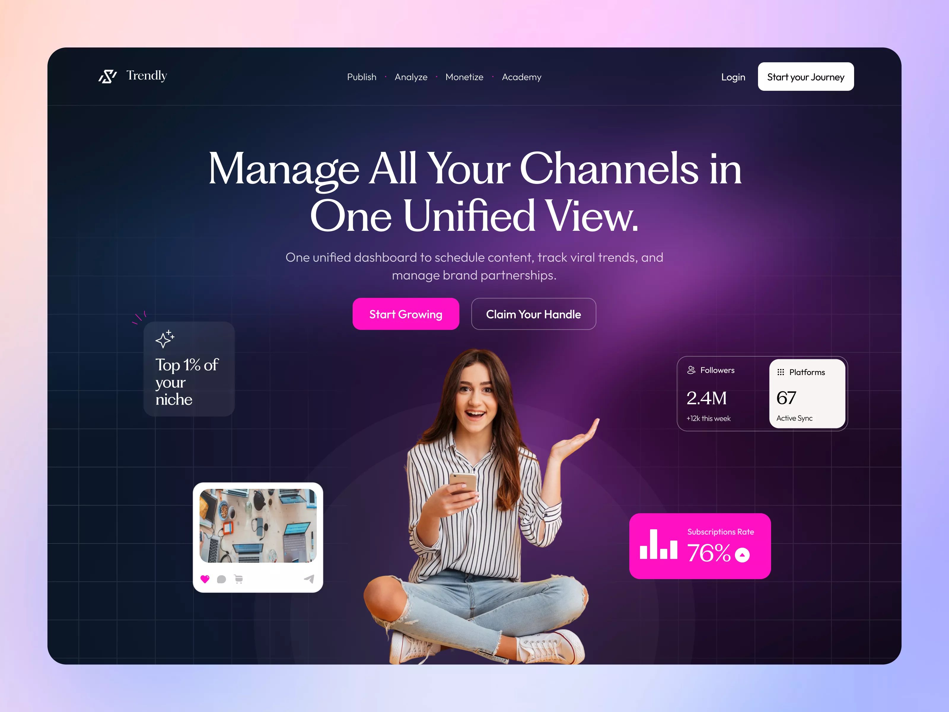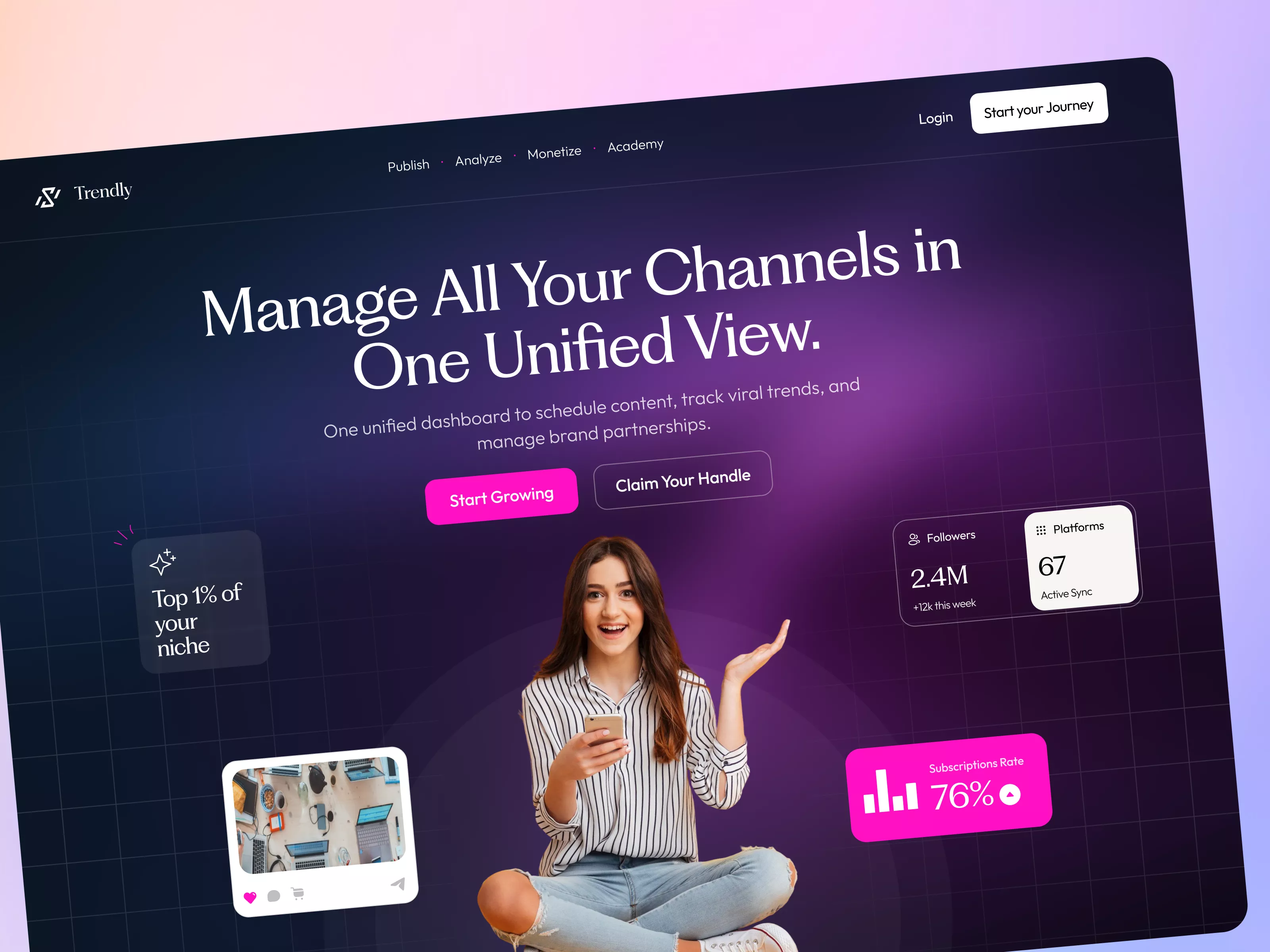Introducing a modern, intuitive UI design that seamlessly integrates all your channel management needs into one unified dashboard. Crafted with attention to detail, this design is perfect for those looking to streamline content scheduling, track viral trends, and manage brand partnerships effortlessly. The layout is both aesthetically pleasing and highly functional, ensuring an enhanced user experience. The design features a sophisticated blend of colors, creating a visually appealing interface that captures attention while maintaining a professional look. The use of large, readable fonts ensures that all important information is easily accessible, while strategically placed CTAs like 'Start Growing' and 'Claim Your Handle' encourage user engagement. The statistics widgets provide real-time data insights, aiding in informed decision-making. This UI design is not just a visual delight but a practical solution for any agency or individual looking to elevate their content management game. Available in a Figma file, it allows for easy customization and integration into your existing workflow.