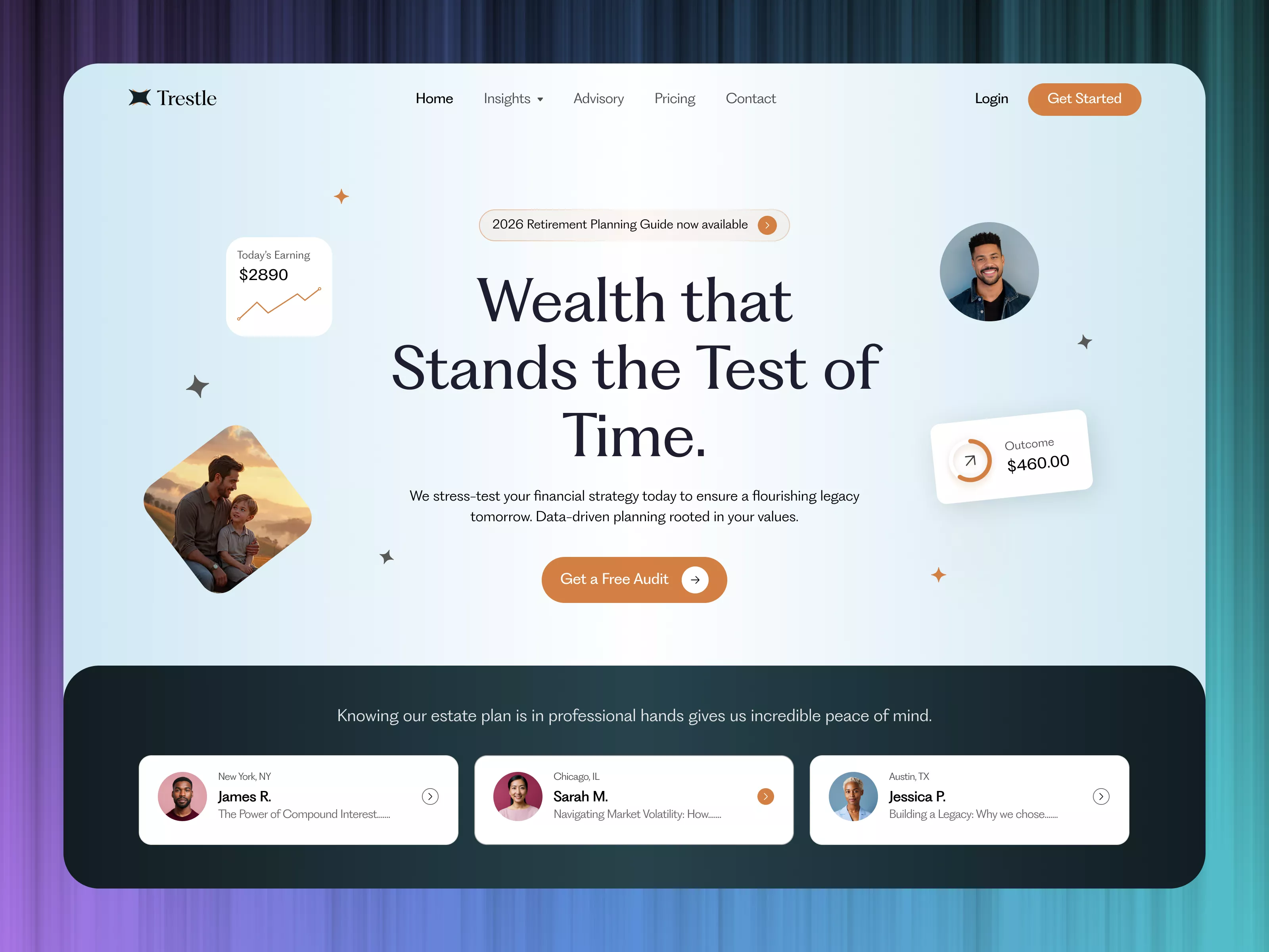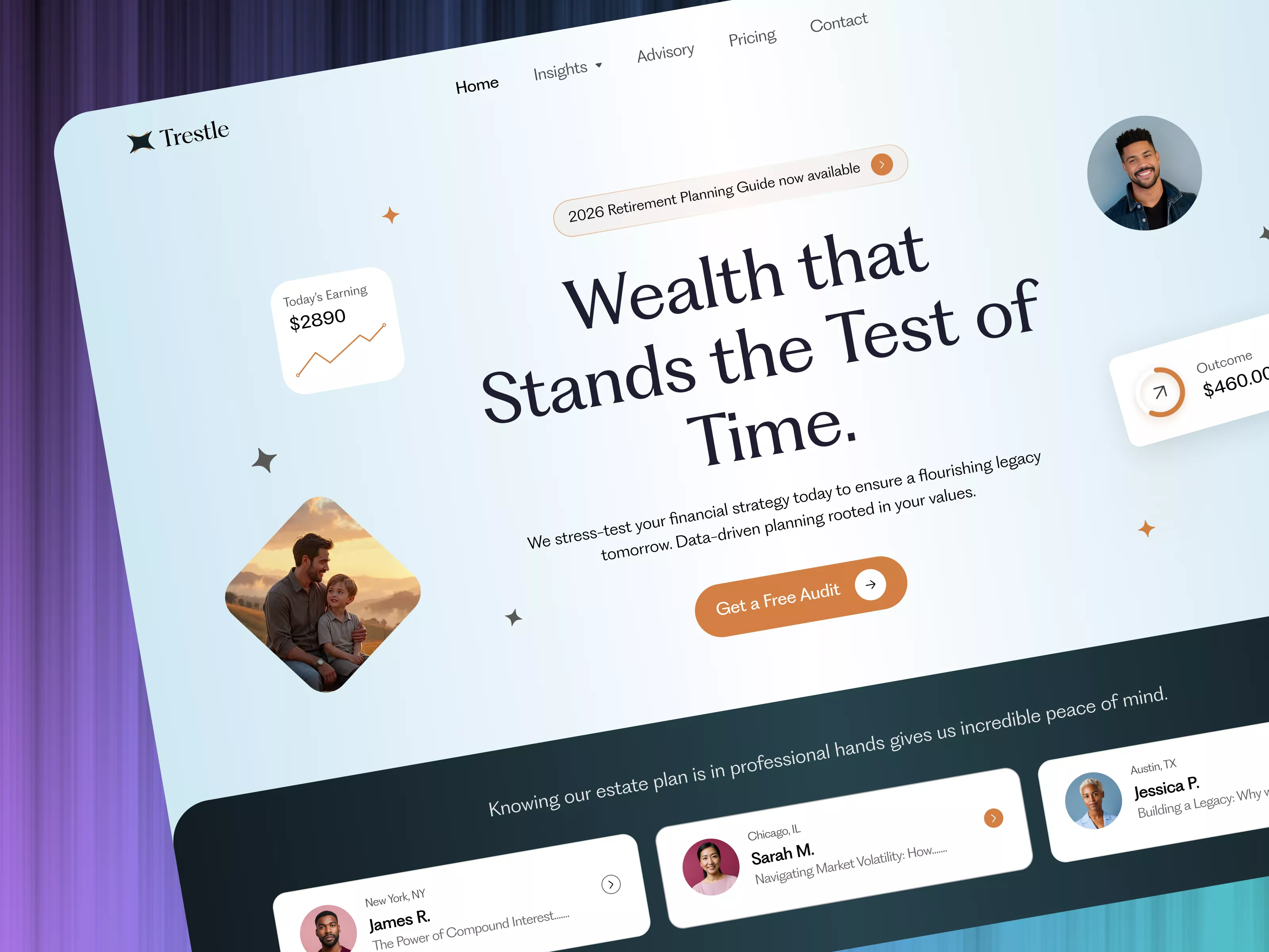 This premium UI design template offers a sophisticated, modern layout tailored for financial service platforms, ensuring a compelling online presence. Centered around a calming blue gradient backdrop, the design highlights a visually striking headline, 'Wealth that Stands the Test of Time,' which effectively communicates trust and longevity to potential clients. The interface features a seamless blend of typography styles from bold headers to well-contrasted body text, delivering content with clarity and emphasis. The strategic placement of graphics, such as earnings insights and client testimonials, enriches the user experience by presenting critical information upfront. Additionally, the design incorporates an intuitive navigation bar, providing easy access to essential sections like Insights, Advisory, and Contact, reinforced by a compelling CTA button, 'Get a Free Audit.' This component-rich Figma file allows designers to customize visual elements and brand them to suit specific market needs quickly. Built with meticulous attention to detail, the template is fully responsive, ensuring consistent aesthetics across devices and boosting engagement rates significantly.