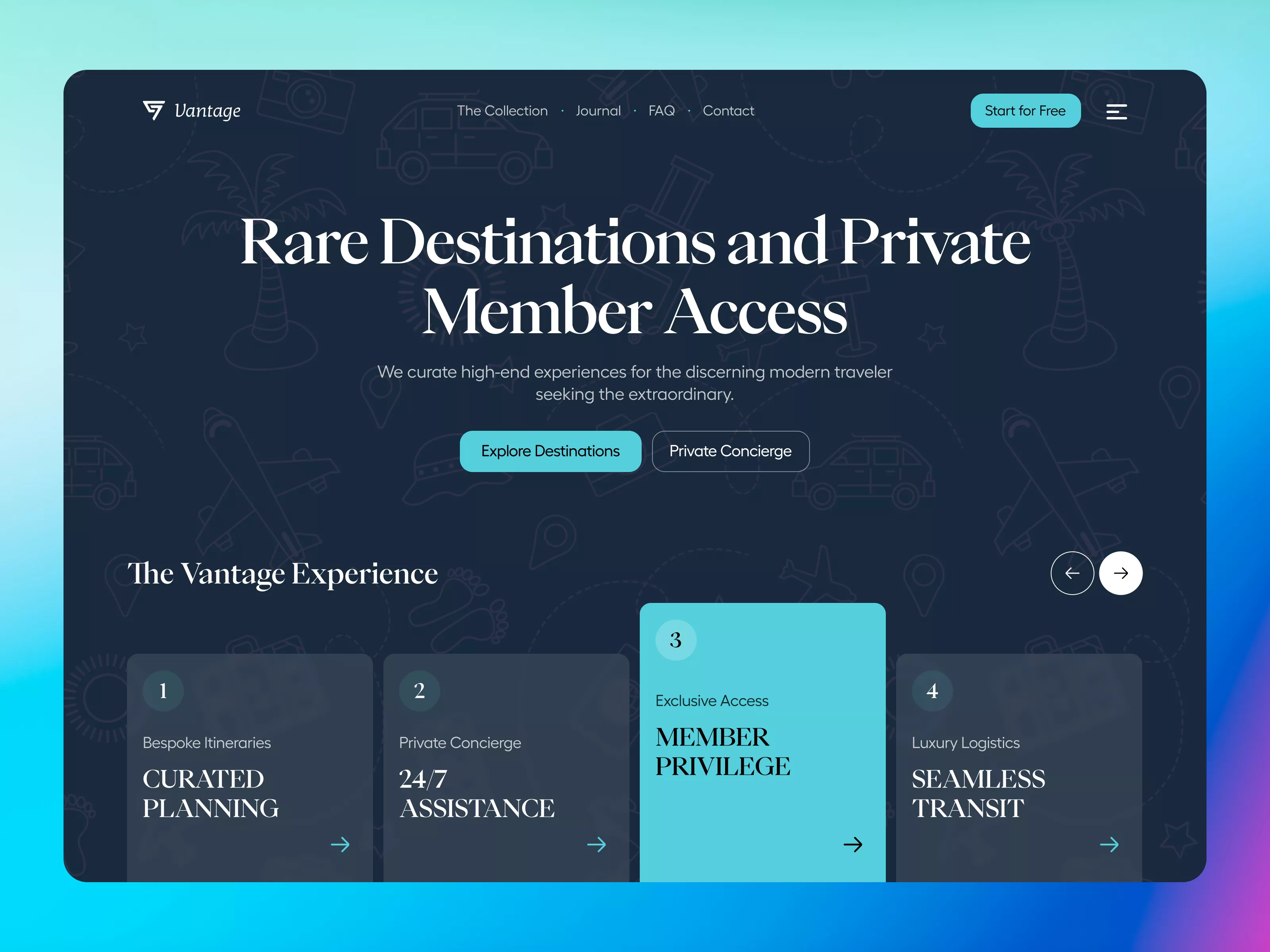 Welcome to a cutting-edge UI design tailored for luxury travel platforms. Our new design encapsulates the essence of exclusivity and sophistication, targeting modern travelers with a taste for unique experiences. The homepage boasts a sleek, dark theme highlighted by elegant, contrasting typography, offering both a visually compelling and user-friendly interface. The prominent 'Explore Destinations' and 'Private Concierge' buttons are designed with inviting aqua tones that perfectly blend with the subtle background illustrations of travel icons, creating an immersive travel-themed aesthetic. With clean, card-based sections that offer insights into bespoke itineraries, 24/7 concierge services, exclusive member privileges, and seamless transit options, this design prioritizes user engagement and accessibility. Every element is meticulously crafted to ensure that visitors are drawn seamlessly through the journey of discovering rare travel destinations. This Figma file is easily accessible, allowing for direct copy and paste into your projects, ensuring efficiency and immediacy in your workflow. Whether you're curating bespoke travel experiences or managing high-end logistics, this UI design sets the stage for an unparalleled online user experience.