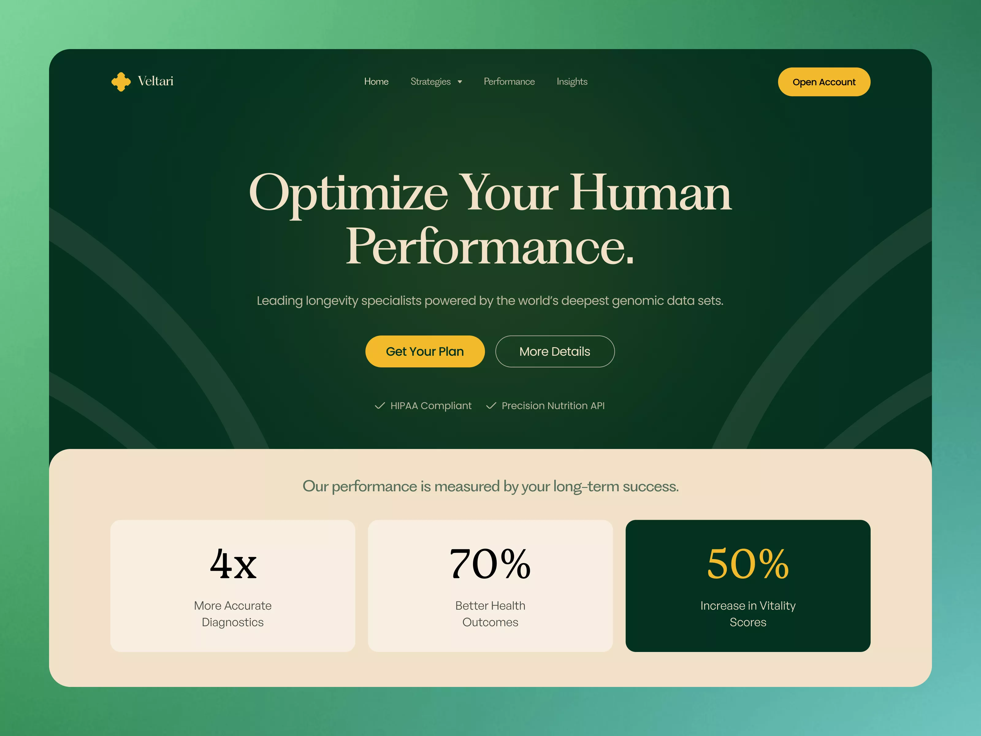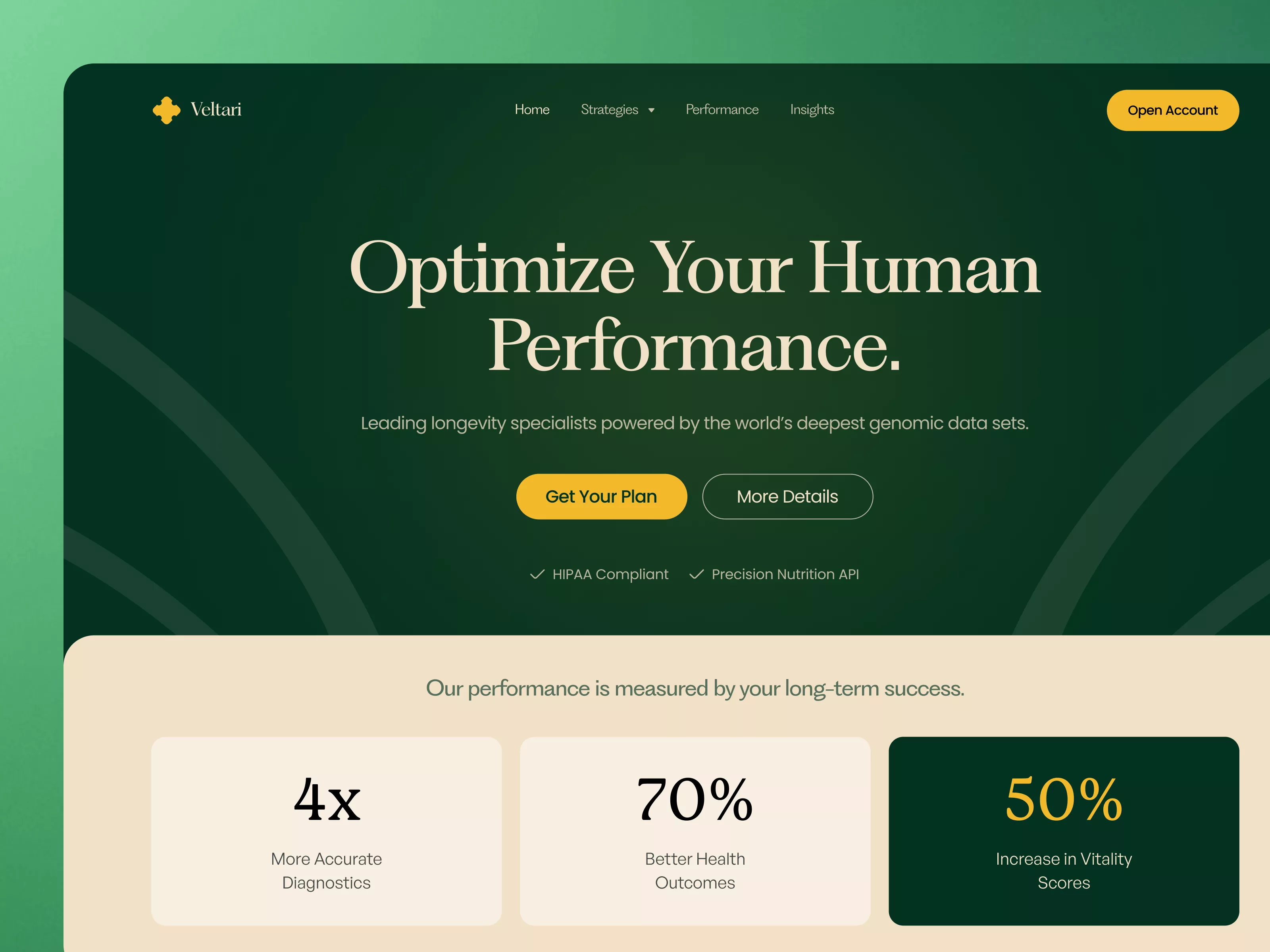 Introducing a sophisticated UI design tailored for platforms focusing on human performance and optimization. This design is crafted to captivate and engage users with its calming, earthy green tones combined with modern typography. Designed for easy navigation, the homepage is structured with clear call-to-action buttons like 'Get Your Plan' and 'More Details,' ensuring a seamless user journey. This design emphasizes transparency and trust, showcasing vital metrics such as '4x More Accurate Diagnostics,' '70% Better Health Outcomes,' and '50% Increase in Vitality Scores,' making it ideal for health, wellness, and longevity-focused businesses. Each section is purposefully designed, providing detailed information without overwhelming the viewer. Key features include compliance indicators and an introduction to genomic data specialization, adding an edge of credibility to your brand. Delivered in a Figma format, this design allows you to effortlessly integrate and customize elements to suit your specific needs without the need for downloads. Elevate your brand with this cutting-edge UI design that seamlessly combines aesthetics with functionality.