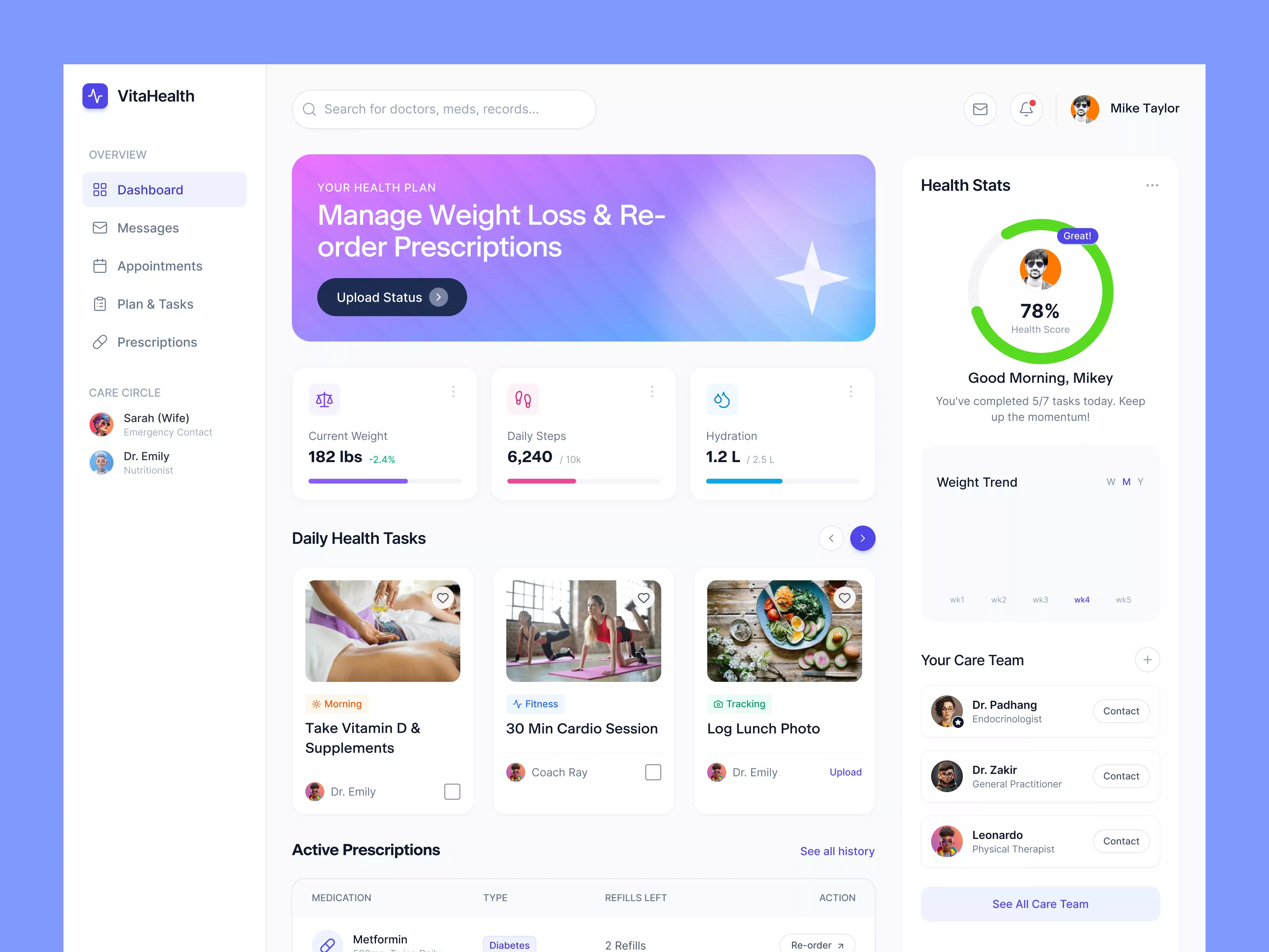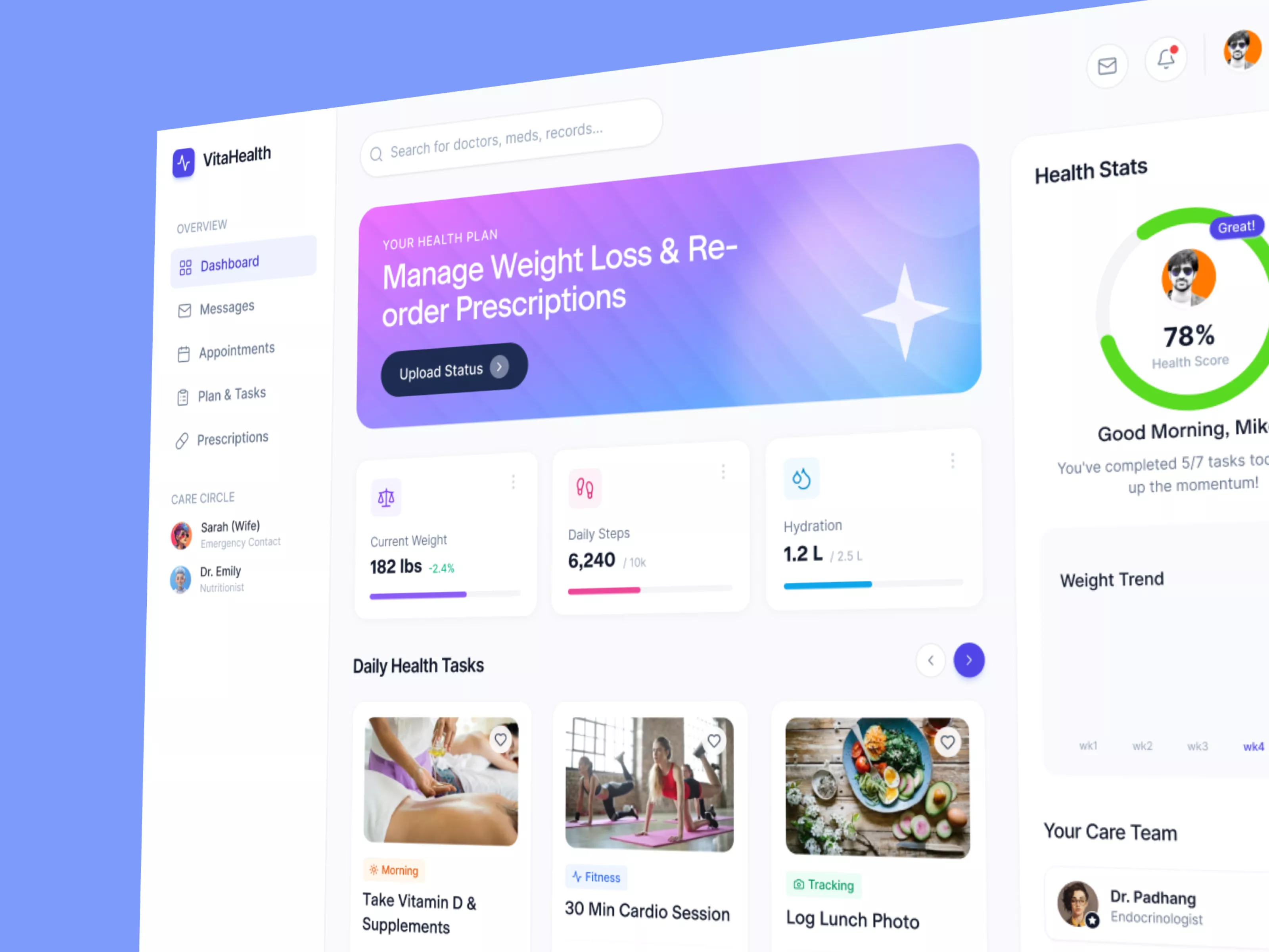 This UI design presents a comprehensive and user-friendly dashboard for a health and wellness application named VitaHealth. The design is structured into three main sections, allowing easy navigation and enhanced user interaction. On the left, a vertical navigation bar provides quick access to primary features such as Dashboard, Messages, Appointments, Plan & Tasks, and Prescriptions. Below the navigation, a 'Care Circle' highlights emergency contacts and health professionals associated with the user. The central area prominently displays a customizable health plan banner, alongside widgets that track the user's current weight, daily steps, and hydration levels. 'Daily Health Tasks' are featured with classified activities like 'Morning' and 'Fitness', encouraging user engagement. The right panel showcases 'Health Stats' with a progress circle and weight trends, providing immediate visual feedback on the user's health journey. The design's fresh and vibrant color scheme makes the interface engaging and pleasant to explore.